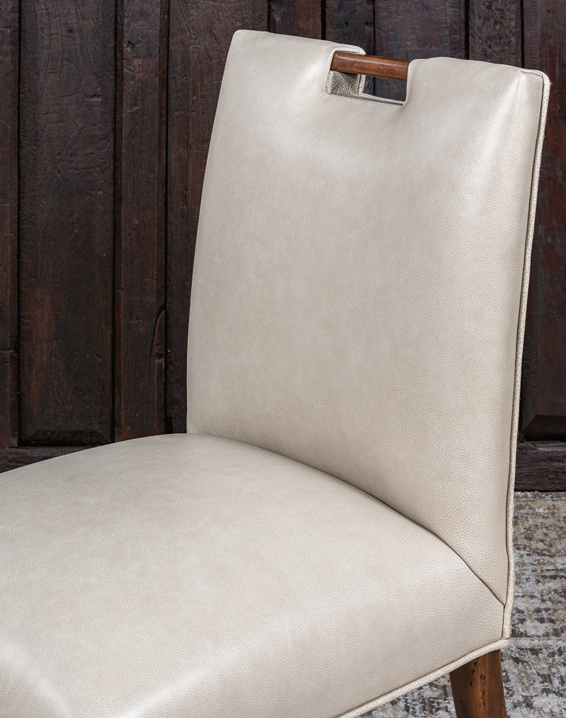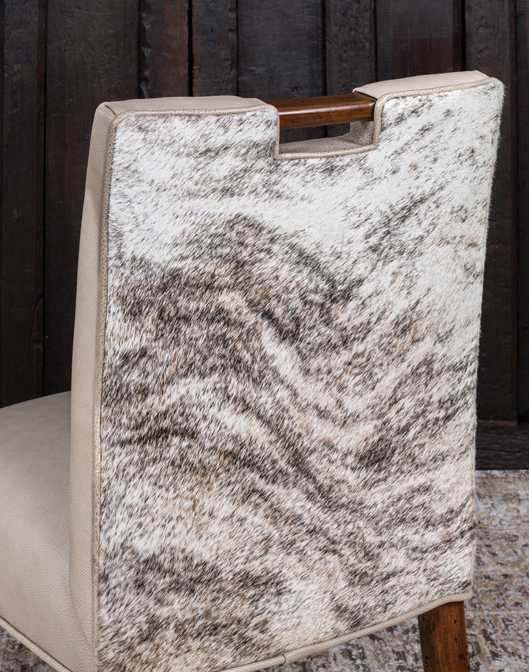 Upholstered in luxurious top-grain leather in a soft ivory tone, the chair delivers a clean, tailored aesthetic from the front. The outside back adds a bold rustic accent, wrapped in premium, upholstery-grade brindle cowhide with natural variations in warm taupe, gray, and cream tones. A hand-finished wooden top rail adds a sculptural detail and built-in handle for functional elegance.