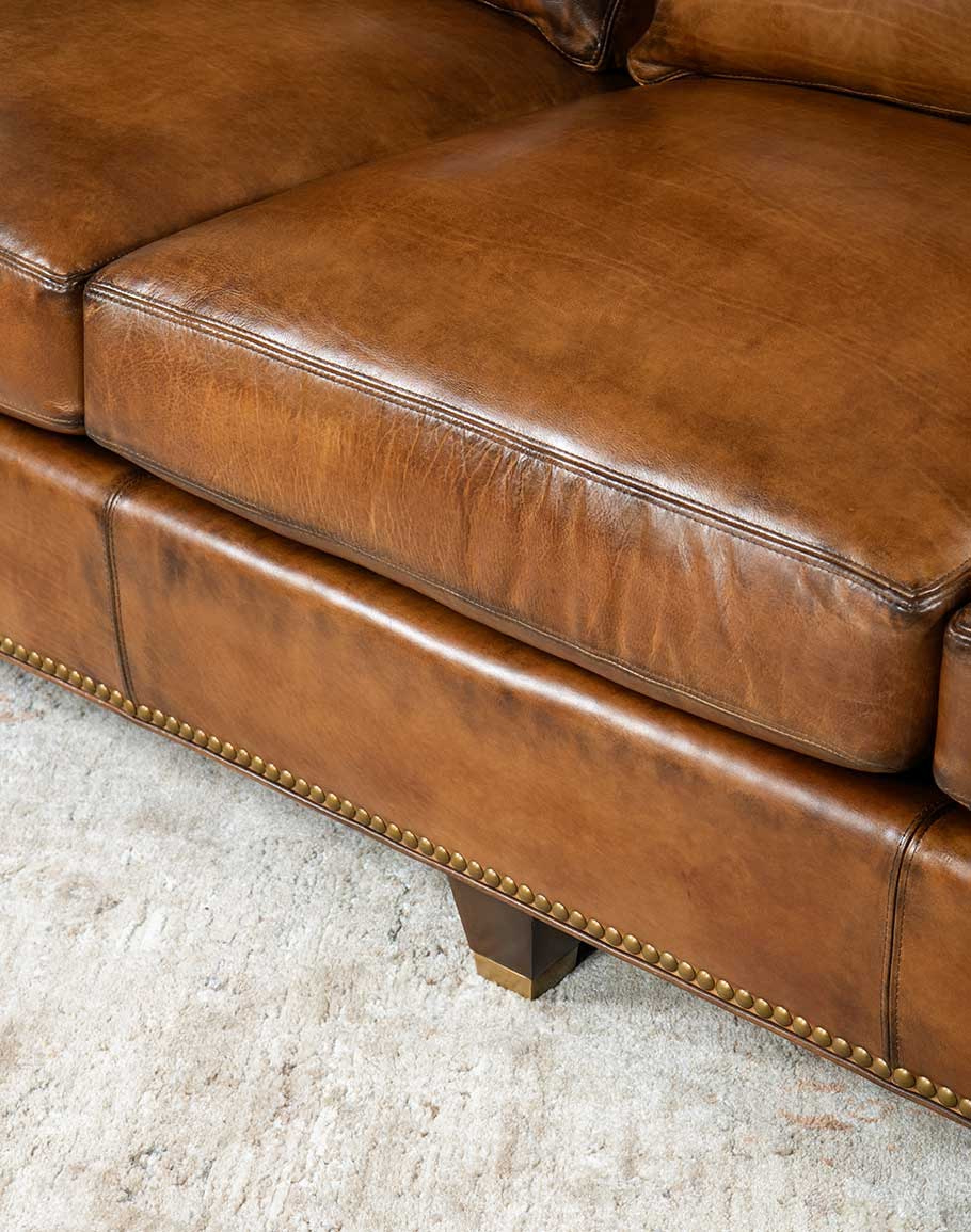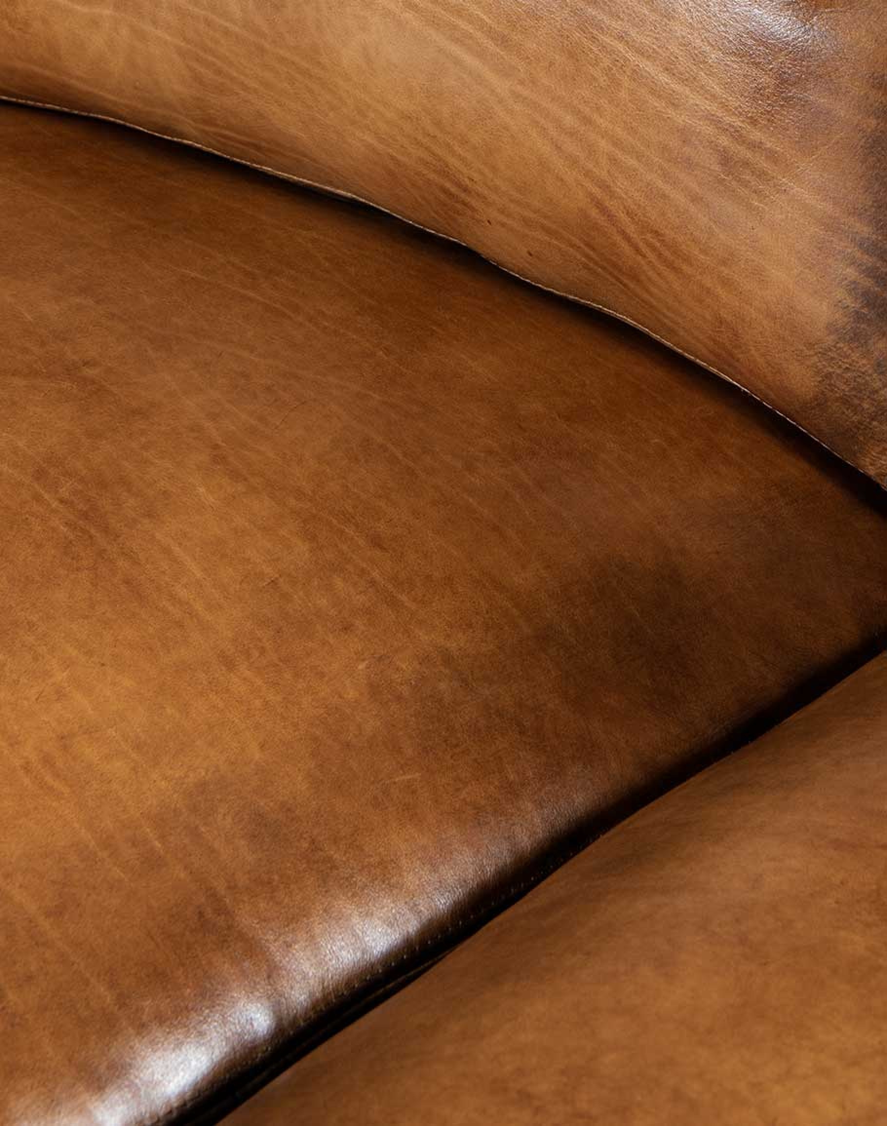 Leather Description: This is a full grain aniline leather tanned in a historic leather producing region of Italy using English hides. The century old tannery prepares this leather article by applying a hot wax, then turning the hides in old wooden tanning drums overnight to soften the natural fibers and impart it with a remarkable suppleness. The leather is then upholstered in its "crust form" on the furniture in North Carolina, After the furniture is made our leather artisans apply a multi step hand rubbed Patina using the same waxes and pigments used in Italy. Performing this process on the actual finished piece allows our artisans to develop a unique Patina, composition, and overall essence that creates a piece of furniture that has uniqueness, character and style that matches the individual who's selecting it. This leather imparts the feeling of a softer, well broken in leather one might find on a decades old chair discovered in a French country estate or the Parisian flea market. The leather is brand new from our Artisans hands... without the aging issues that sometimes come from the hands of time. Truly a unique, hand-made article in an era when only companies committed to the highest standards lavish this sort of attention and time to unique American made furniture.
