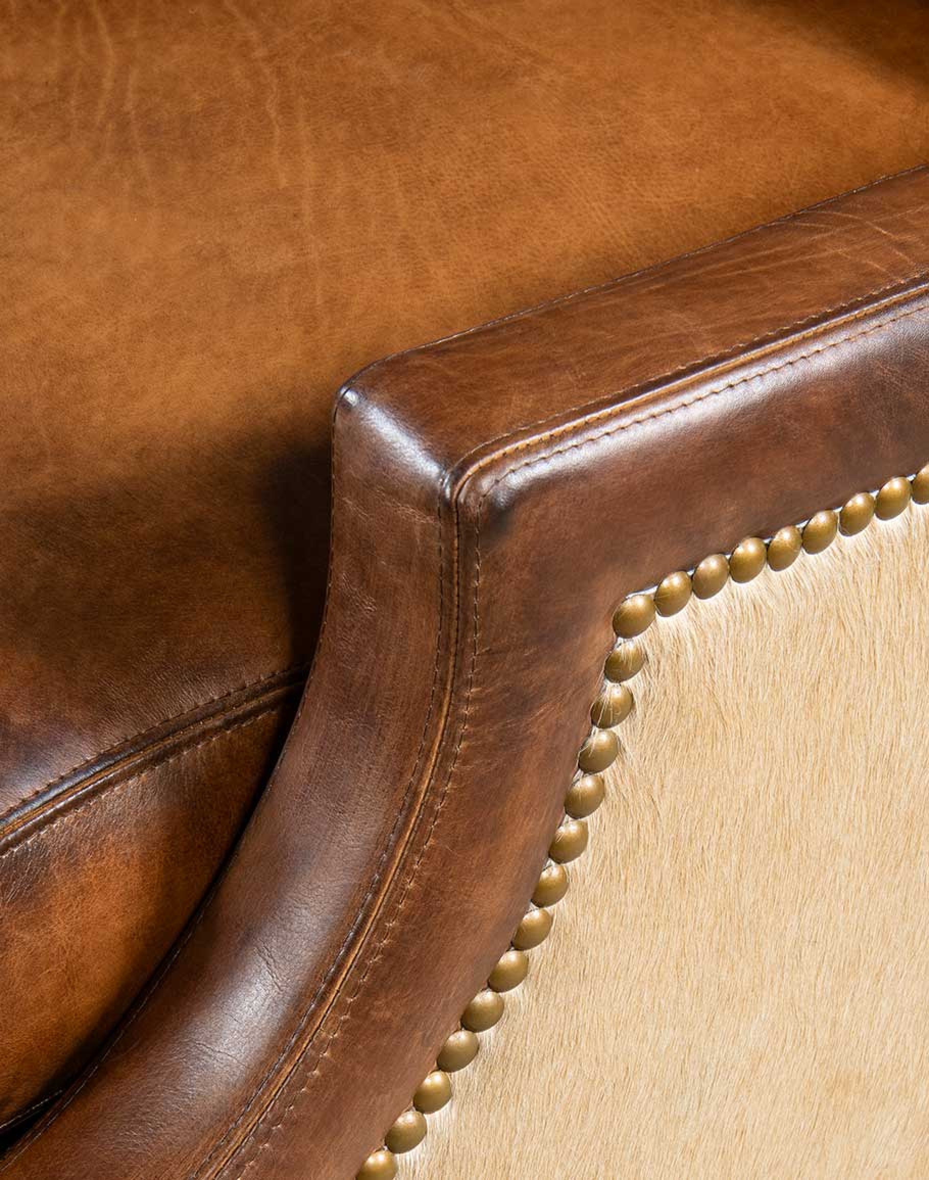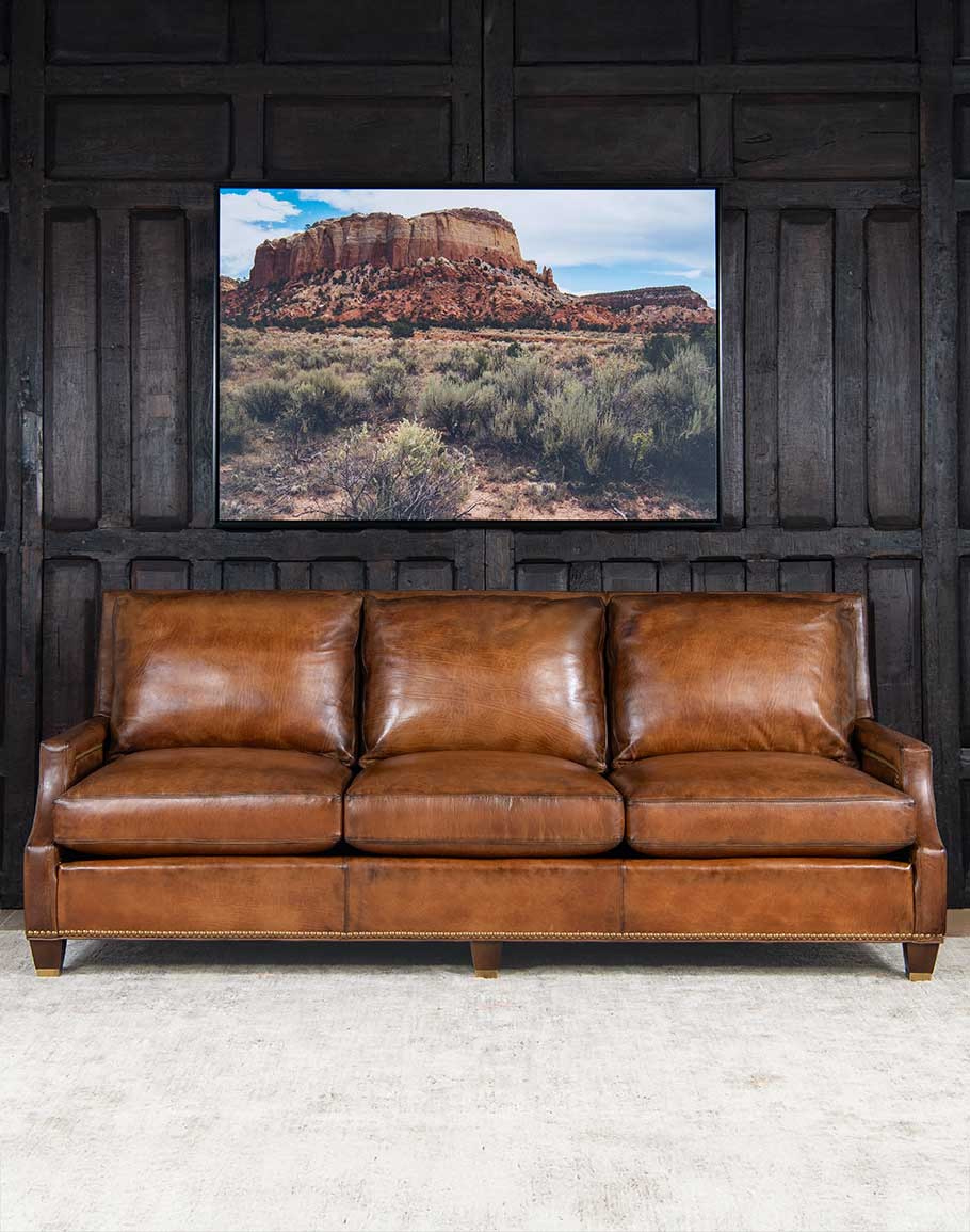 Our Jericho Leather Sofa is a striking, fashionable piece of classic ranch style. This rich hand, burnished leather sofa with a natural blonde cowhide accent is as stylish as it is comfy! The Jericho Leather Sofa features an elegantly straight-line design that echoes some of the finest natural patterns. Rich, Elegant, hand-burnished leather and natural cowhide make this sofa the perfect addition to any home pursuing a rustic, elegant aesthetic. The Jericho Leather Sofa is a prime example of the quality possible with hand-crafted furniture. The hand-burnished leather gives this unique high-end sofa a patina of classical elegance. Because of its distinctive shape and versatile finishing material, the Jericho Leather Sofa is a welcome addition to virtually any family or living room, whether urban or ranch. This beautiful piece of furniture pairs well with almost any interpretation of the fine rustic aesthetic. It exudes luxury yet can be paired with virtually any design aesthetic thanks to its simple, classic design. 100% American-made to the highest standards of quality and craftsmanship, an heirloom in the making. At Adobe Interiors, we create the furniture, and you create the memories.