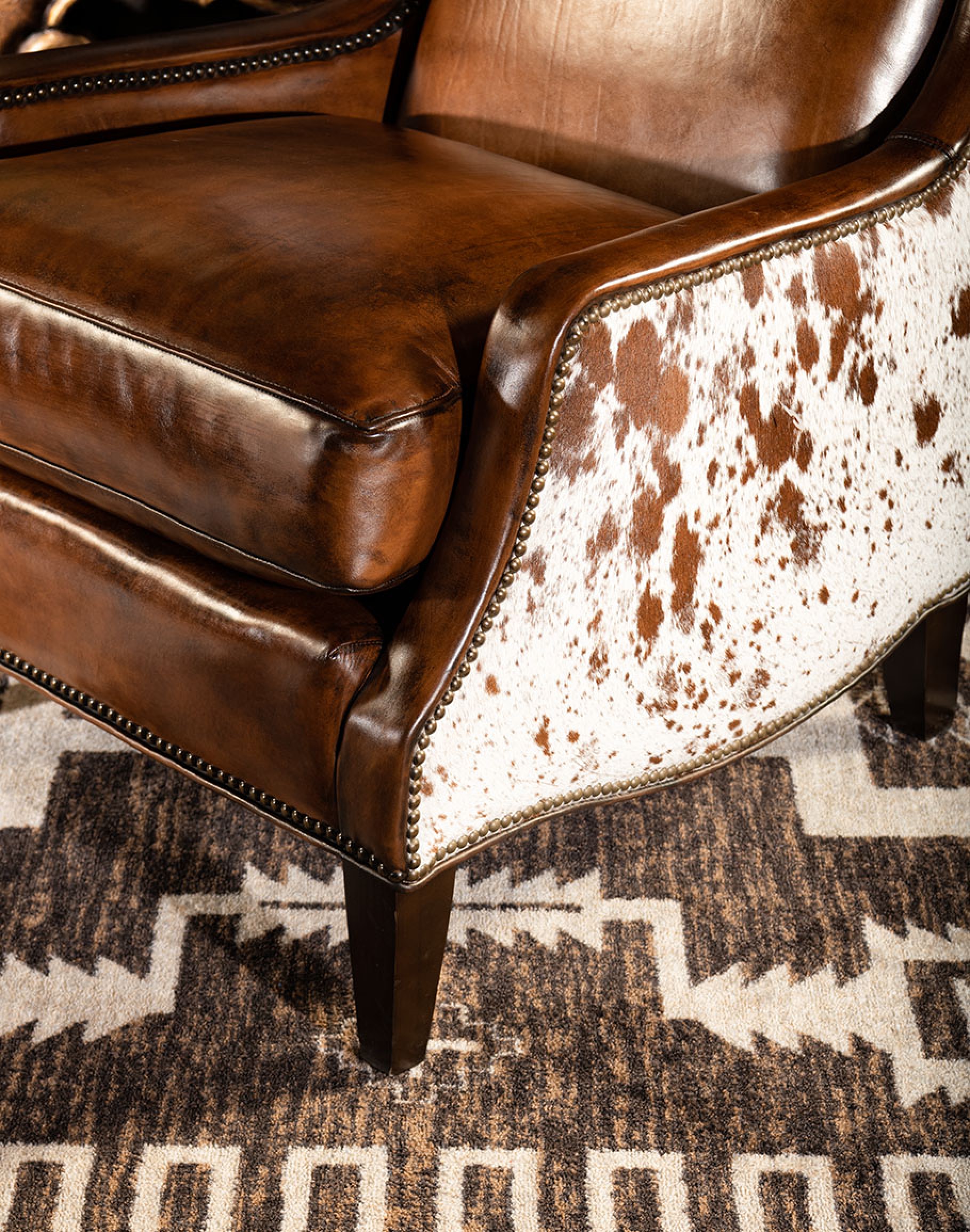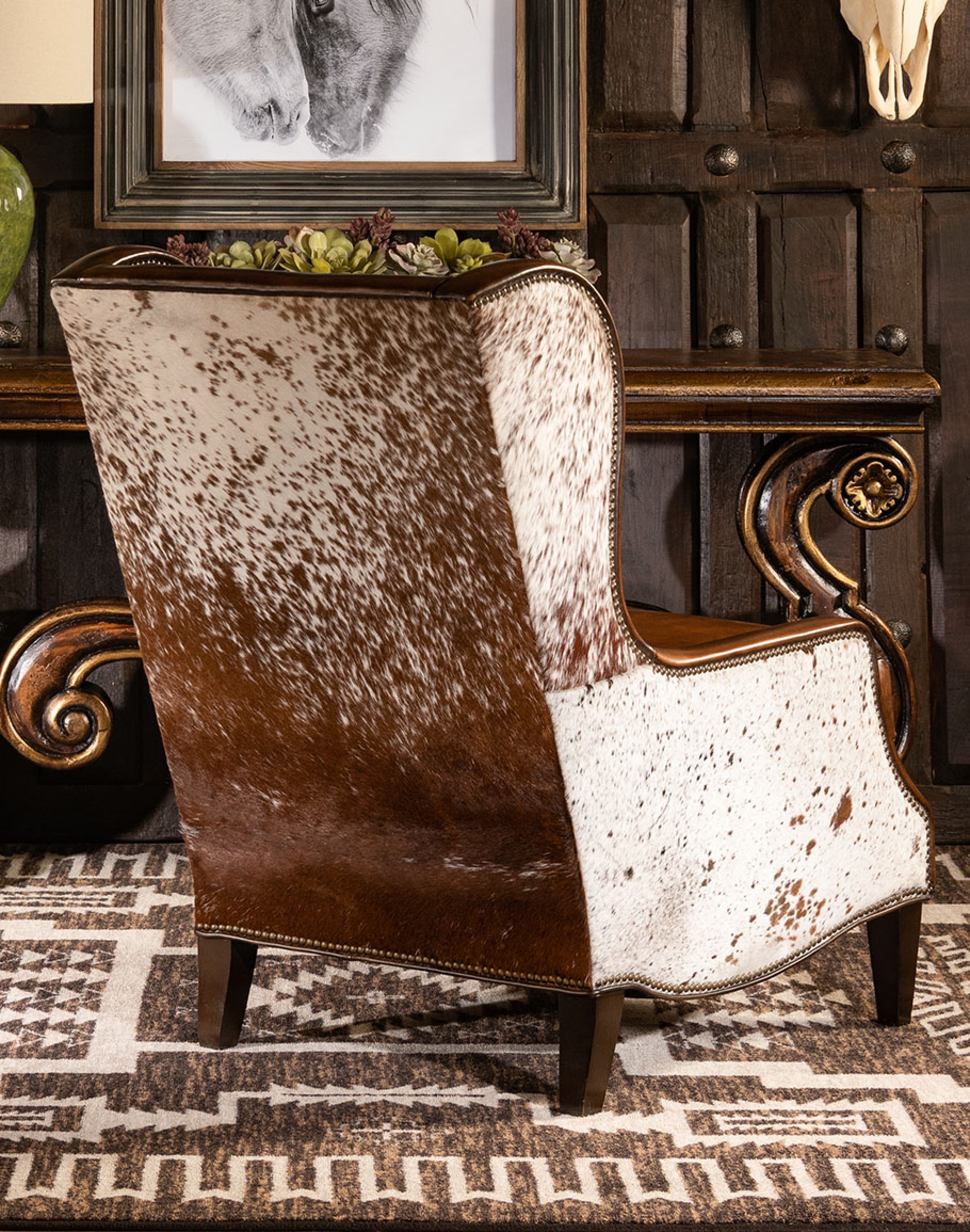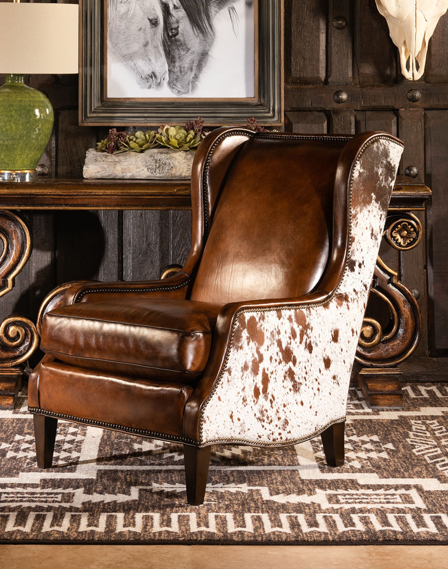 Our Alamo Leather Chair is an extraordinary piece of furniture that epitomizes luxury and sophistication. It features artisanal leather tanned to the highest standards of quality and is 100% American-made. Crafted with unparalleled attention to detail, this wingback chair showcases impeccable artisanal craftsmanship, seamlessly combining supreme comfort with timeless appeal. The Alamo Leather Chair boasts fine leather upholstery, highlighted by meticulously placed brass nail tacks that enhance its refined aesthetic. The sides and back are enveloped in genuine cowhide, adding a touch of rustic elegance. This luxurious wingback chair offers a firm, tight back, ensuring enduring support and comfort. With its exceptional quality, craftsmanship, and use of top-tier materials, the Alamo Leather Chair is more than just a seating option—it’s a statement piece. Its timeless style and exquisite attention to detail make it a Classic Ranch and Desert Ranch collection star. This chair is a highly desirable addition to any discerning homeowner's furniture collection, bringing a touch of elegance and sophistication to any space. Experience the blend of tradition, quality, and design. At Adobe Interiors, we create the furniture, and you create the memories.
