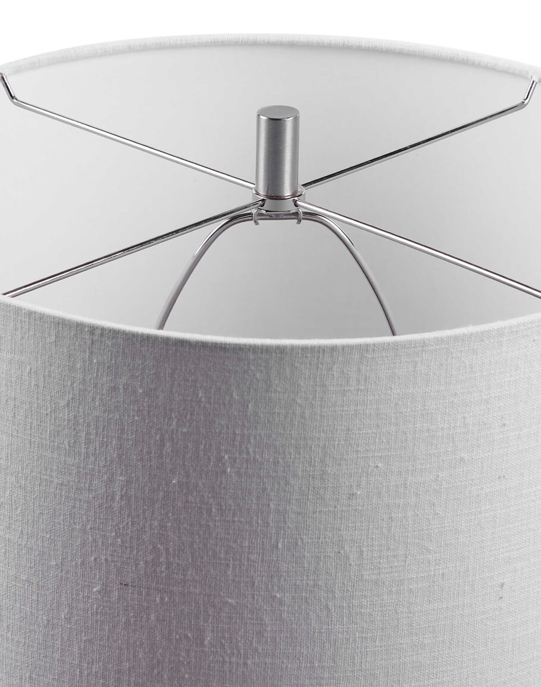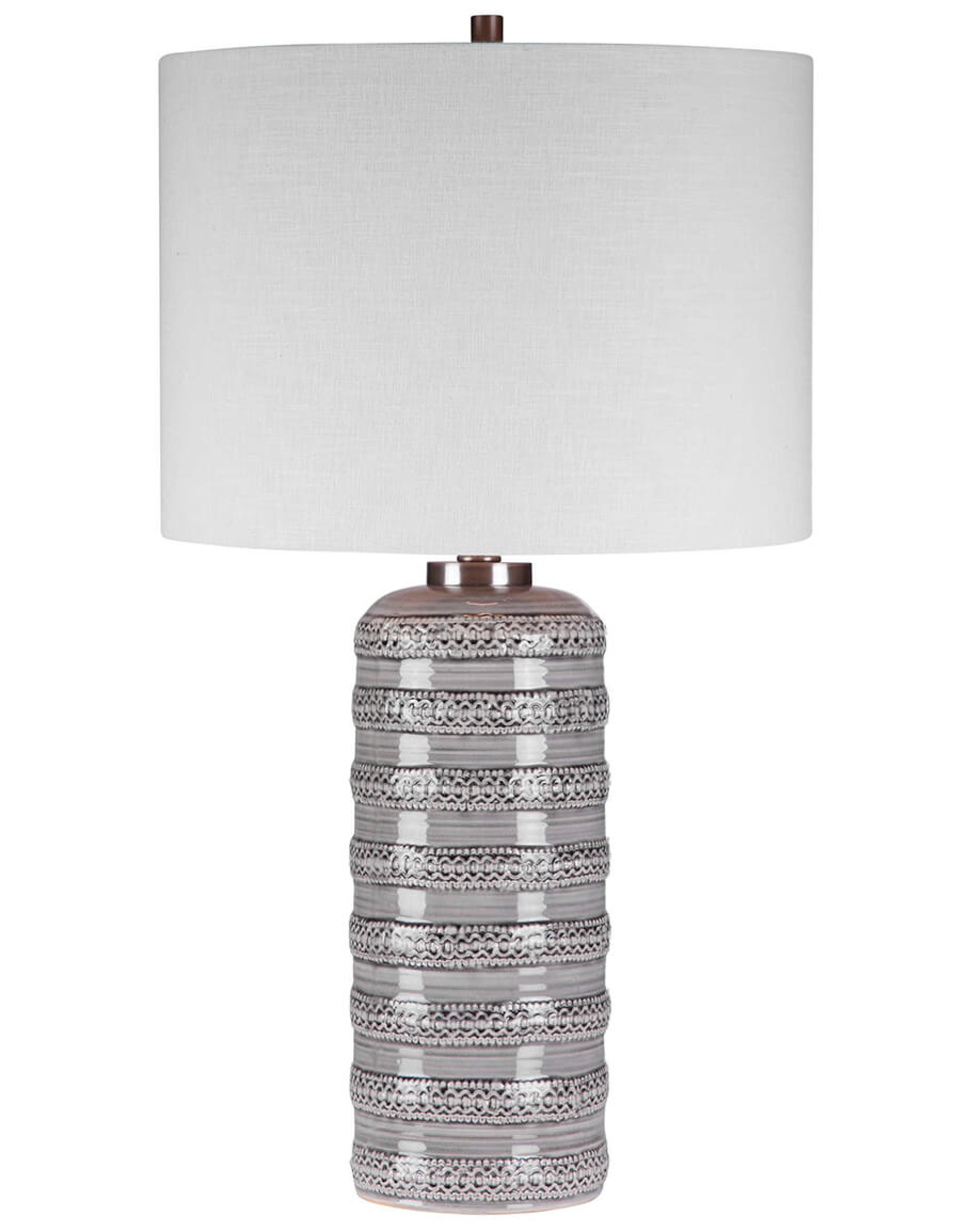 This traditional ceramic table lamp has an elegant, overlaid lace design with a delicate light gray glaze, accented with brushed nickel plated details. The piece is paired with a white linen fabric drum shade with natural slubbing.