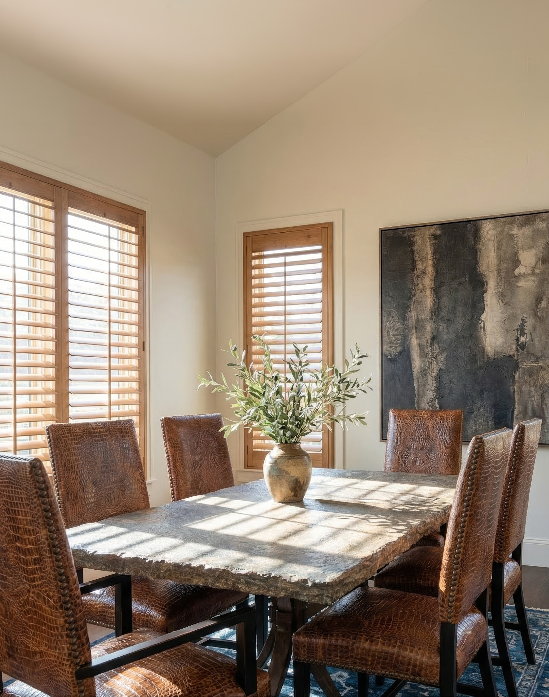 Smart never looked as stylish as it does in our modern rustic styled Amazon Croc Dining Chair! Like a professor on sabbatical, this piece is effortlessly sophisticated yet also refreshingly relaxed. Perfect for the dining room or the study, this chair speaks to the gentleman inside every cowboy. With a clean lined shape, a dynamic embossed croc leather exterior and bold studded details, the high-quality leather dining chair will put your guests at ease, be it at a formal celebration or a casual get-together. Like a flavorful stock or an impeccable sauce, let this piece provide the foundation for a good meal shared by friends and family. This fine, rustic elegant Dining Chair works well as a standalone in your home office, or in a set of multiple dining room chairs. With luxury this accessible, you need not consult an artist or a scholar to realize your dream of sophisticated aesthetics and wise indulgence. 100% American Made!