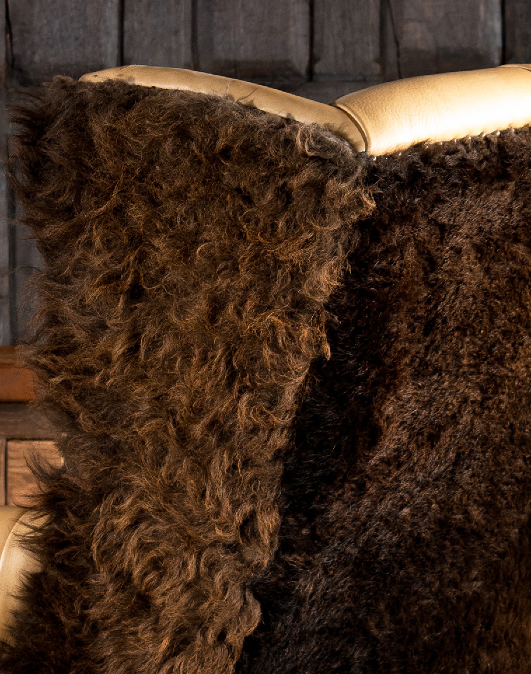 The full-grain leather is carefully hand burnished, giving it a stunning, one-of-a-kind look, and the bison hair on hide wrapped along the outsides of the chair adds to its unique character.
