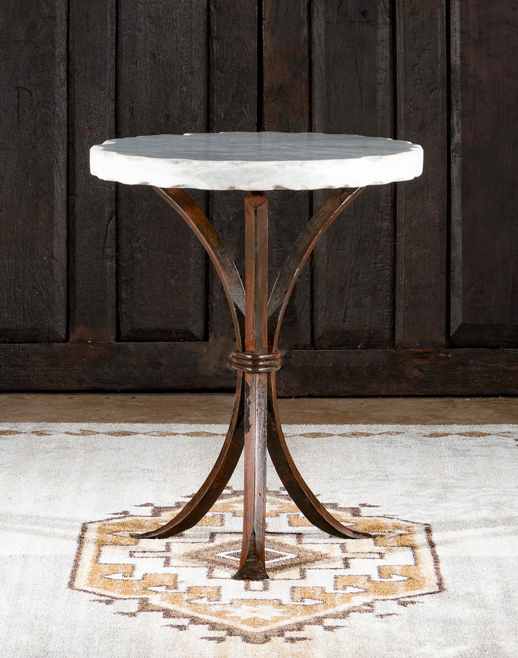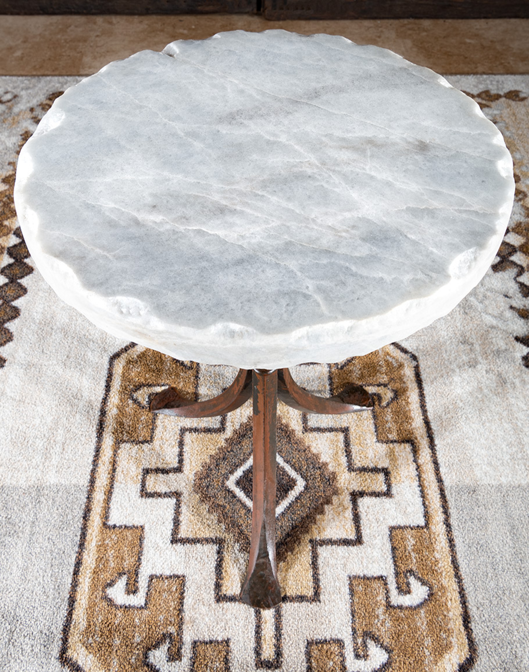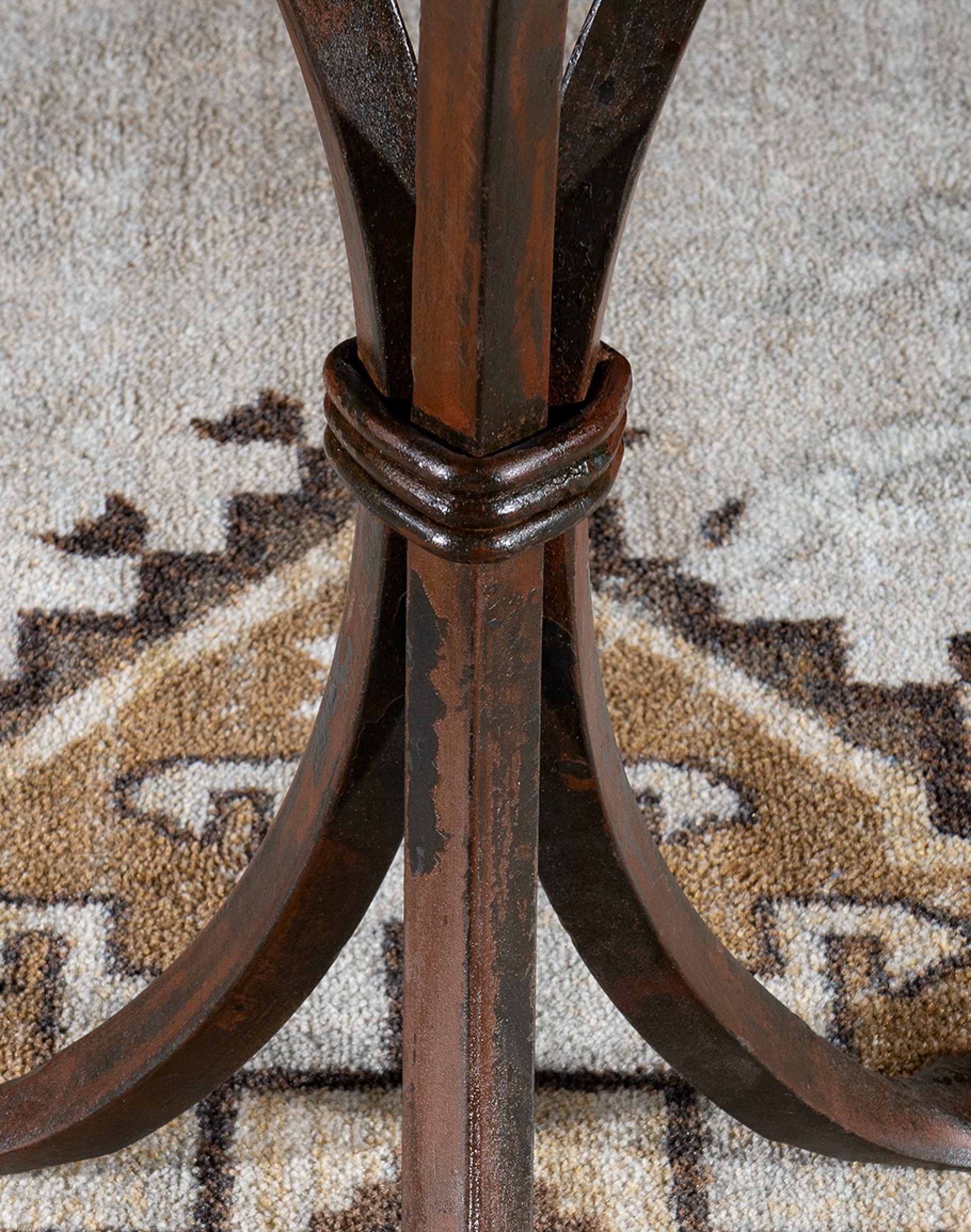 Our Ash Onyx End Table is the perfect addition to your living room decor. Crafted from premium materials, this end table boasts a beautiful design that will complement any western or rustic style. The tabletop is made from high-quality ash colored onyx, giving it a unique and elegant look that will impress your guests. The base of the table is made from sturdy hand forged iron, providing excellent stability and support. The iron frame features a beautiful onyx top that perfectly complements the base. The table's legs are crafted in a sleek, contemporary style that adds a modern touch to the classic western design. The Ash Onyx End Table is the perfect size for holding your favorite books, magazines, or decorative items. Its compact size makes it an excellent choice for small living spaces, while its durable construction ensures that it will last for years to come. Whether you're looking to create a cozy reading nook or add a touch of western flair to your living room, the Ash Onyx End Table is the perfect choice. Its high-quality materials, expert craftsmanship, and timeless design make it an excellent addition to any home. Invest in the best by choosing Adobe Interiors. Experience the perfect blend of rustic western charm and modern elegance with this stunning end table.