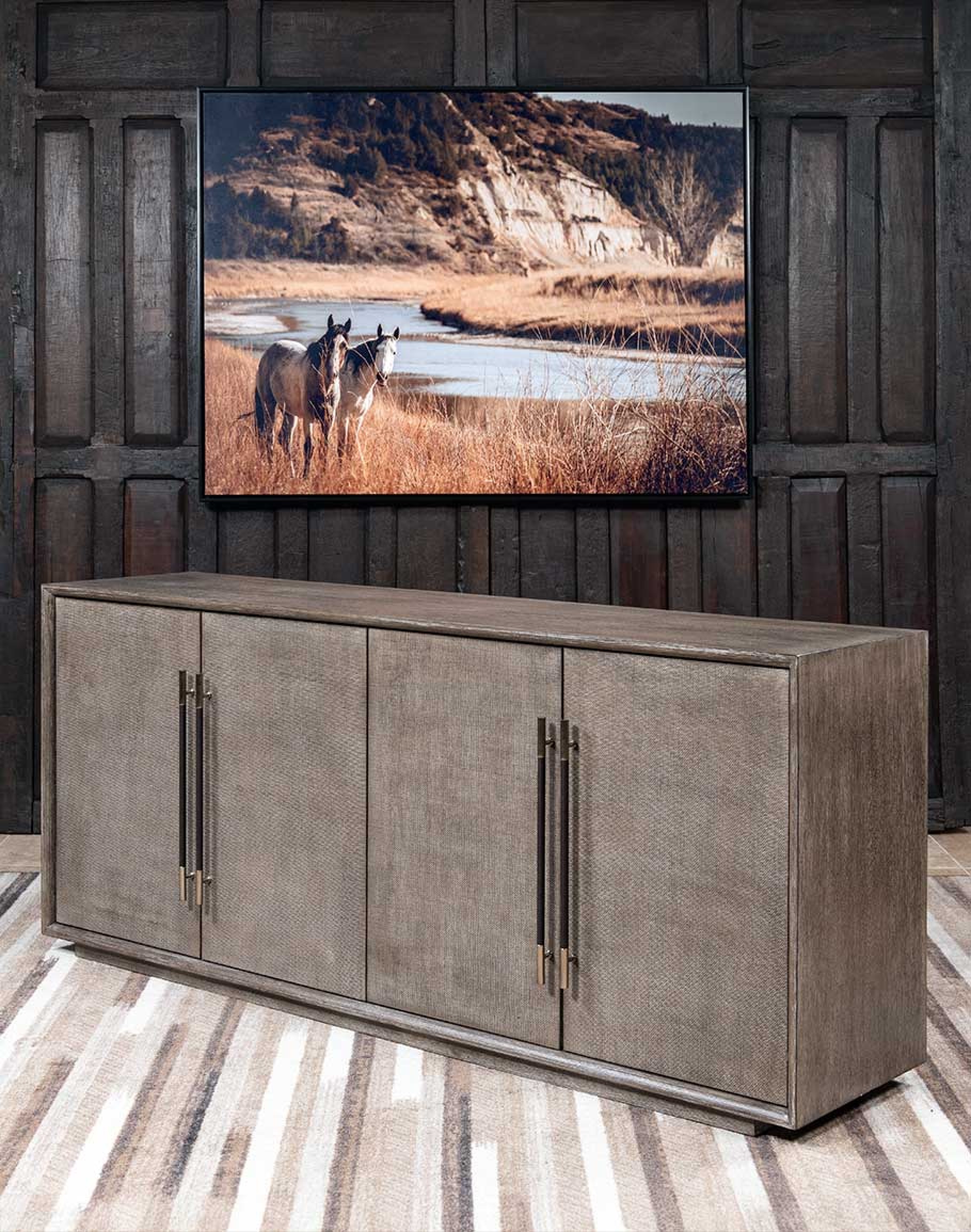 Elegant bar pulls wrapped in leather with a warm pewter finish perfectly complement the console's sophisticated design. Designed to accommodate up to an 80" flat-screen TV, this piece blends style and utility, making it an ideal addition to your media or living room.