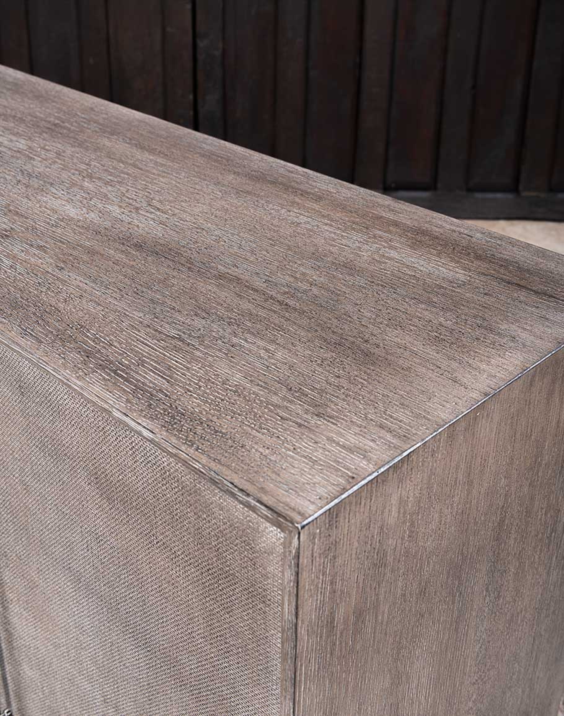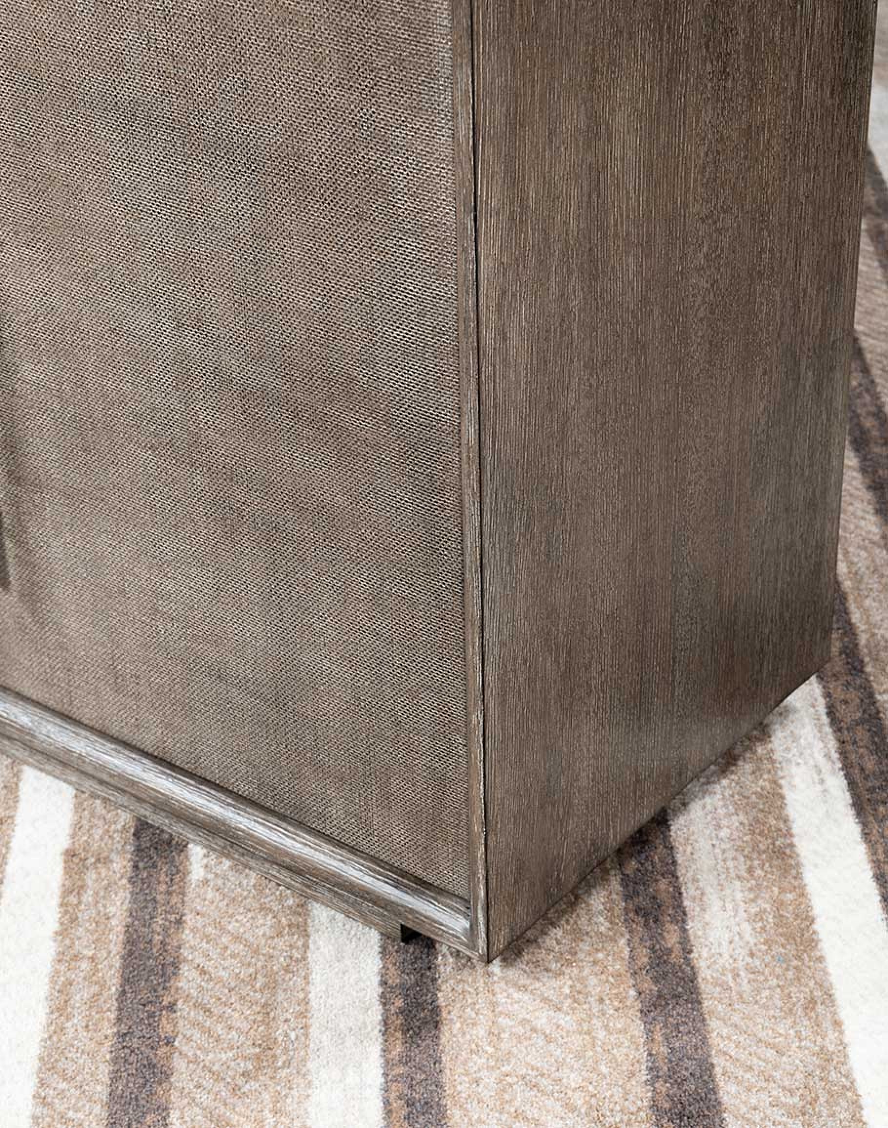 Elevate your living space with the Ashford Entertainment Console, where modern-rustic charm meets refined functionality. Crafted from oak veneers and intricately wrapped in raffia, this console is a testament to superior craftsmanship and thoughtful design. Finished in a rich Mink tone, the flat-cut quartered oak veneers feature wire-brush detailing that adds texture and depth, enhanced by earthy brown hues with subtle black undertones for a timeless aesthetic.