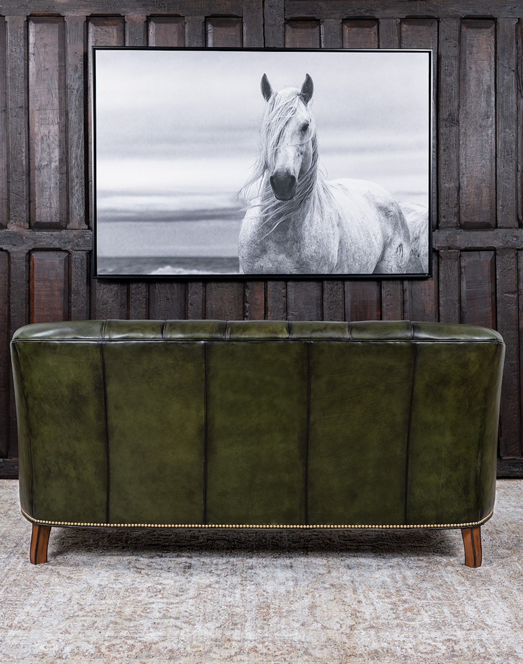 The Audrey Olive Tufted Leather Settee is a refined statement of timeless craftsmanship and Western-inspired luxury. Handcrafted in the USA to the highest standards, this piece showcases meticulous button tufting across the gently curved backrest, creating an elegant interplay of depth and dimension. Upholstered in full-grain leather with a rich olive green patina, the surface reveals tonal variations that highlight the supple texture and artisanal burnishing. Its tailored silhouette is accented with a line of antique brass nail tacks along the base, while tapered wooden legs provide a sturdy yet graceful foundation.
