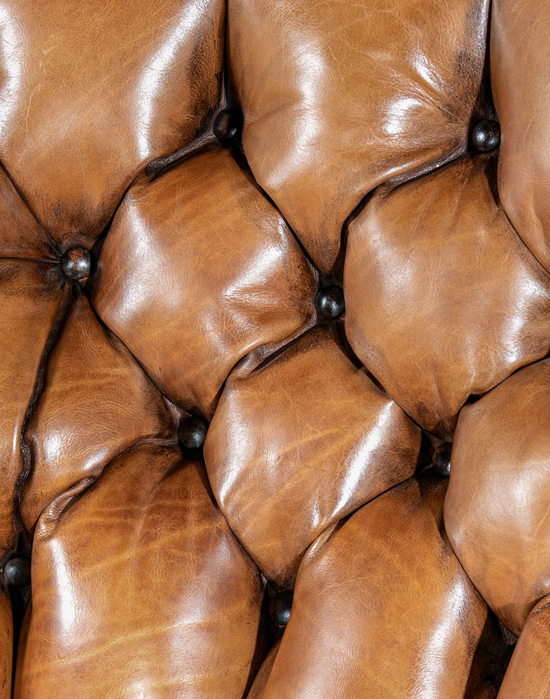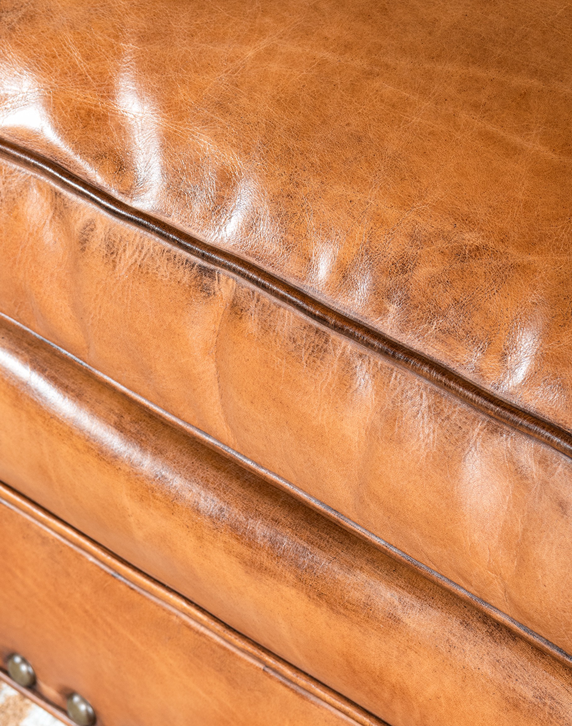 Leather Description: This is a full grain aniline leather tanned in a historic leather producing region of Italy using English hides. The century old tannery prepares this leather article by applying a hot wax, then turning the hides in old wooden tanning drums overnight to soften the natural fibers and impart it with a remarkable suppleness. The leather is then upholstered in its "crust form" on the furniture in North Carolina, After the furniture is made our leather artisans apply a multi step hand rubbed Patina using the same waxes and pigments used in Italy. Performing this process on the actual finished piece allows our artisans to develop a unique Patina, composition, and overall essence that creates a piece of furniture that has uniqueness, character and style that matches the individual who's selecting it. This leather imparts the feeling of a softer, well broken in leather one might find on a decades old chair discovered in a French country estate or the Parisian flea market. The leather is brand new from our Artisans hands... without the aging issues that sometimes come from the hands of time. Truly a unique, hand-made article in an era when only companies committed to the highest standards lavish this sort of attention and time to unique American made furniture.
