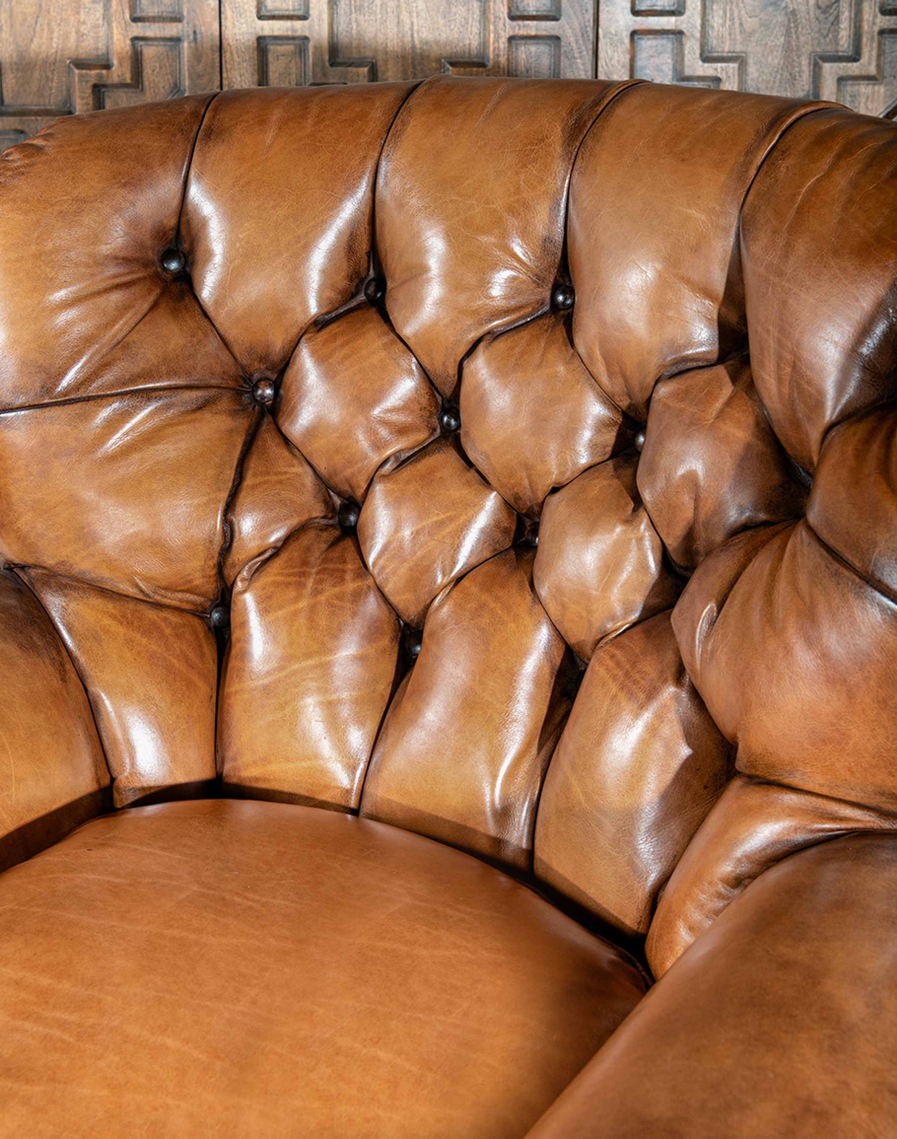 Discover the exquisite craftsmanship of the American-made Author Tufted Leather Chair, a signature piece in both the Classic Ranch and Refined Ranch collections. This masterpiece in furniture design is expertly crafted using the age-old, revered 8-way hand-tied construction method, standing as a testament to enduring quality. Upholstered in luxurious full-grain leather with meticulously hand-burnished details, this chair showcases unparalleled artistry. Experience the perfect blend of traditional elegance and modern comfort with the Author Tufted Leather Chair. The deep button tufts on the inside seat back not only add to its aesthetic appeal but also ensure a blissfully comfortable seating experience. Moreover, the chair features a spring-down seat cushion, offering an unmatched level of comfort and support. To complete the look, a matching ottoman is available upon request, designed to complement the chair's sophisticated style. Whether for a cozy reading nook or as a statement piece in your living space, the Author Tufted Leather Chair embodies luxury and timeless design. This chair is a highly desirable addition to any discerning homeowner's furniture collection, bringing a touch of elegance and sophistication to any space. Experience the blend of tradition, quality, and design. At Adobe Interiors, we create the furniture, and you create the memories.