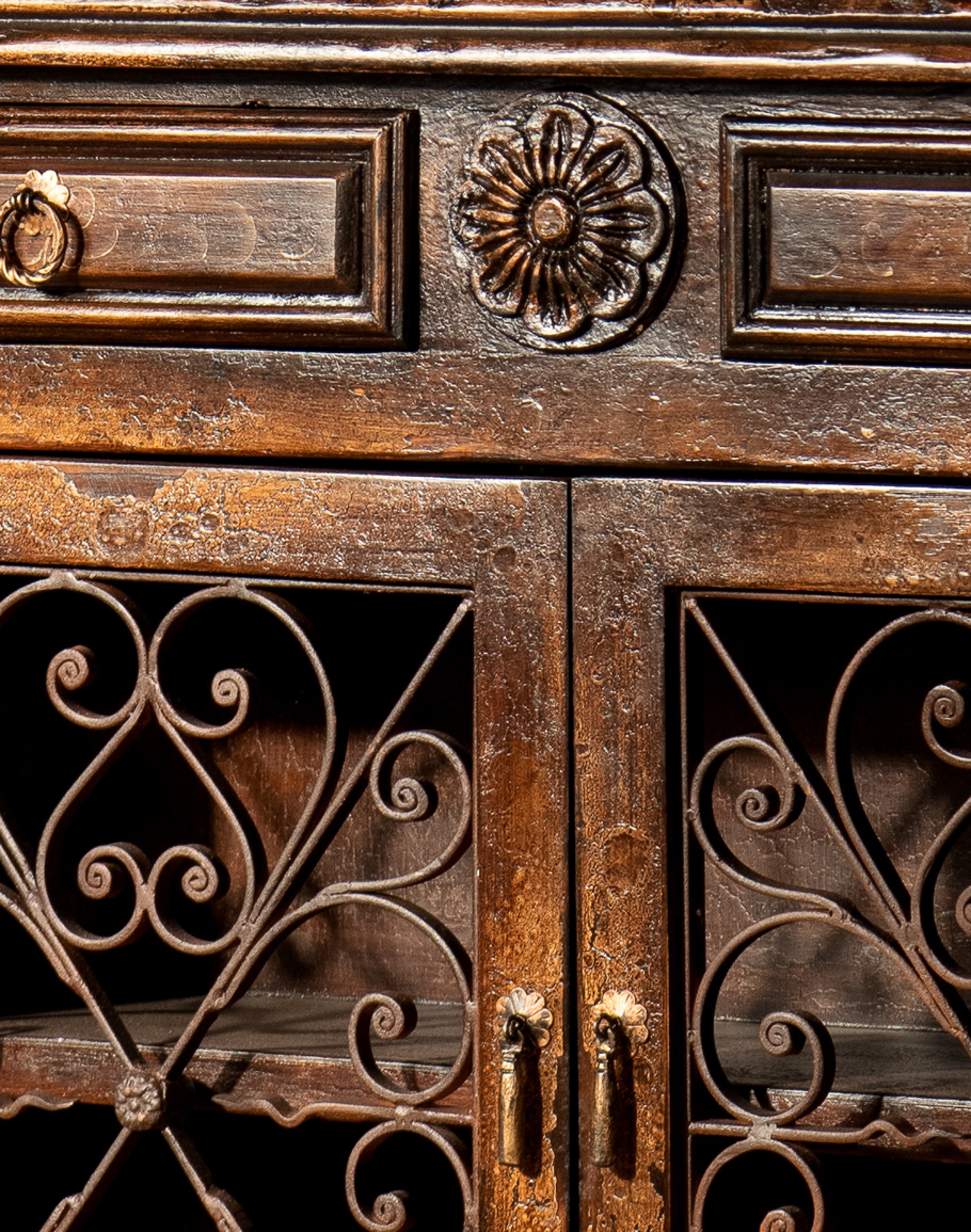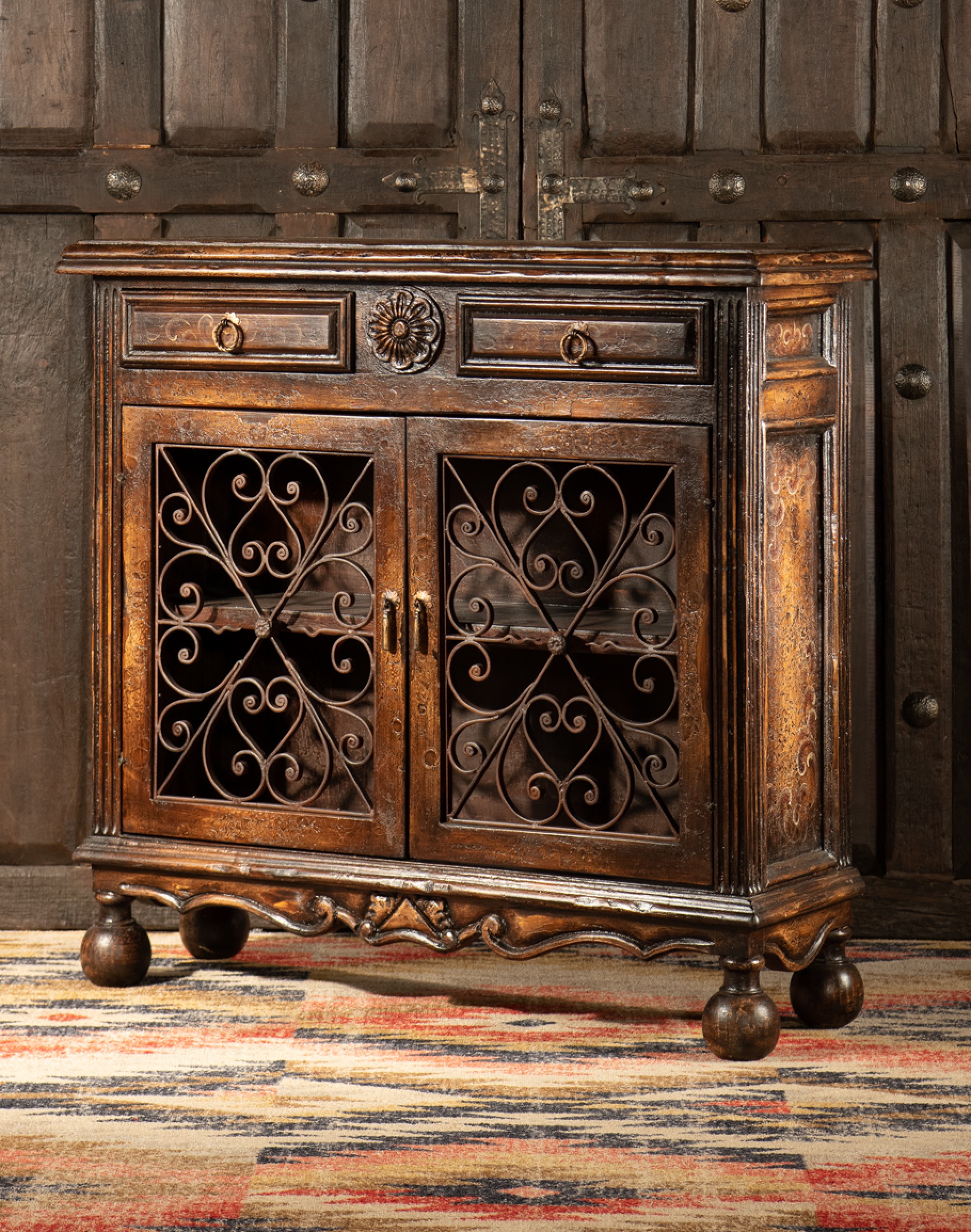 This quality southwest chest features a deep rich chocolate coloring that includes subtle lighter tones throughout the piece for a distressed, elegant look. The technique used to paint this piece gives it an aged, speckled appearance. The two doors frame the curves and spirals within the door faces. The metalwork forms a mirror image that centers on a small circular detail in the middle. There’s a nice variation between curves and straight lines within the door fronts. Small pulls that are anchored on a floral shaped feature make up the door handles, while the drawers have elegant spiraled pulls along the front. The deep coloring of the inside of this western style hutch will nicely showcase the items on display. The rounded feet are a nice complement to the curved features along the bottom edge of this piece. There is subtle beveling within the drawer fronts and along the edges that creates cohesiveness throughout.