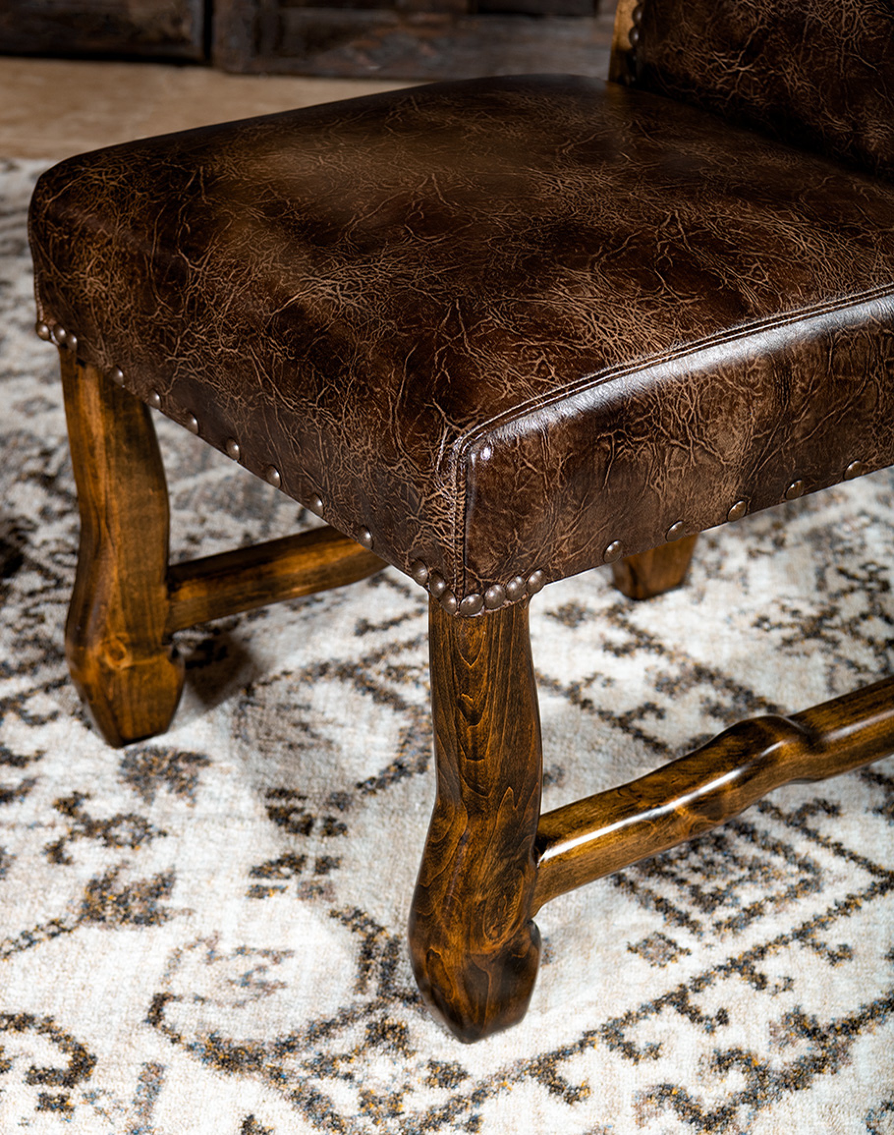 Step into a unique dining experience with the classic ranch Axis Hide Dining Chair. Its outdoor appeal and crackled, waxy leather brings a touch of adventure to your dining space. The genuine axis deer hide adds an unmatched authenticity that cannot be replicated, making every meal a memorable journey. The Knotty Alder hardwood frame and premium high-density foam cushion core ensure lasting durability and comfort for everyday use. These dining chairs are hand-made classics—100% Texas Made! At Adobe Interiors, we create the furniture, and you create the memories.