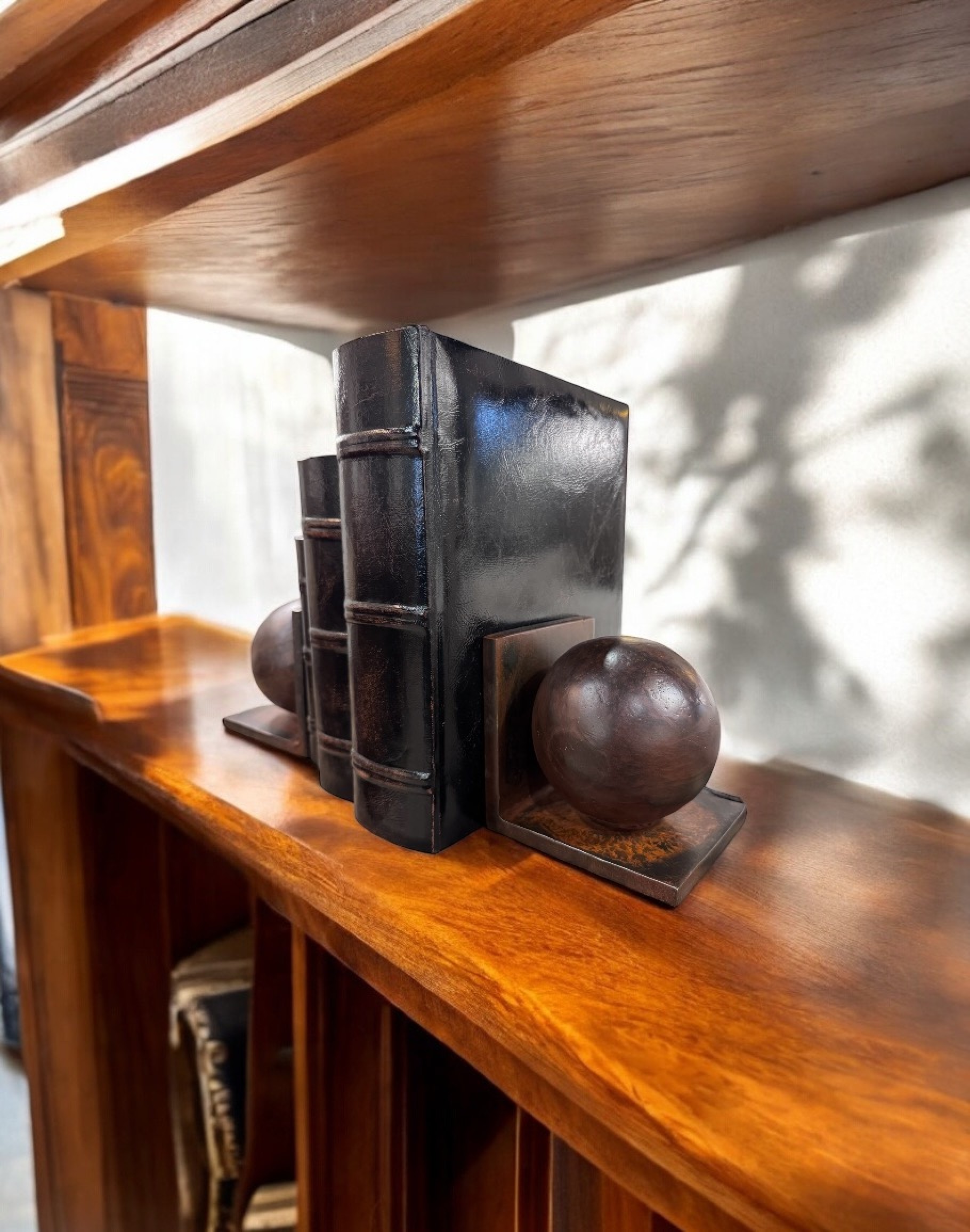 Natural Finish Wax cast iron ball bookends (pair). Can be used as door stops or paper weights.
