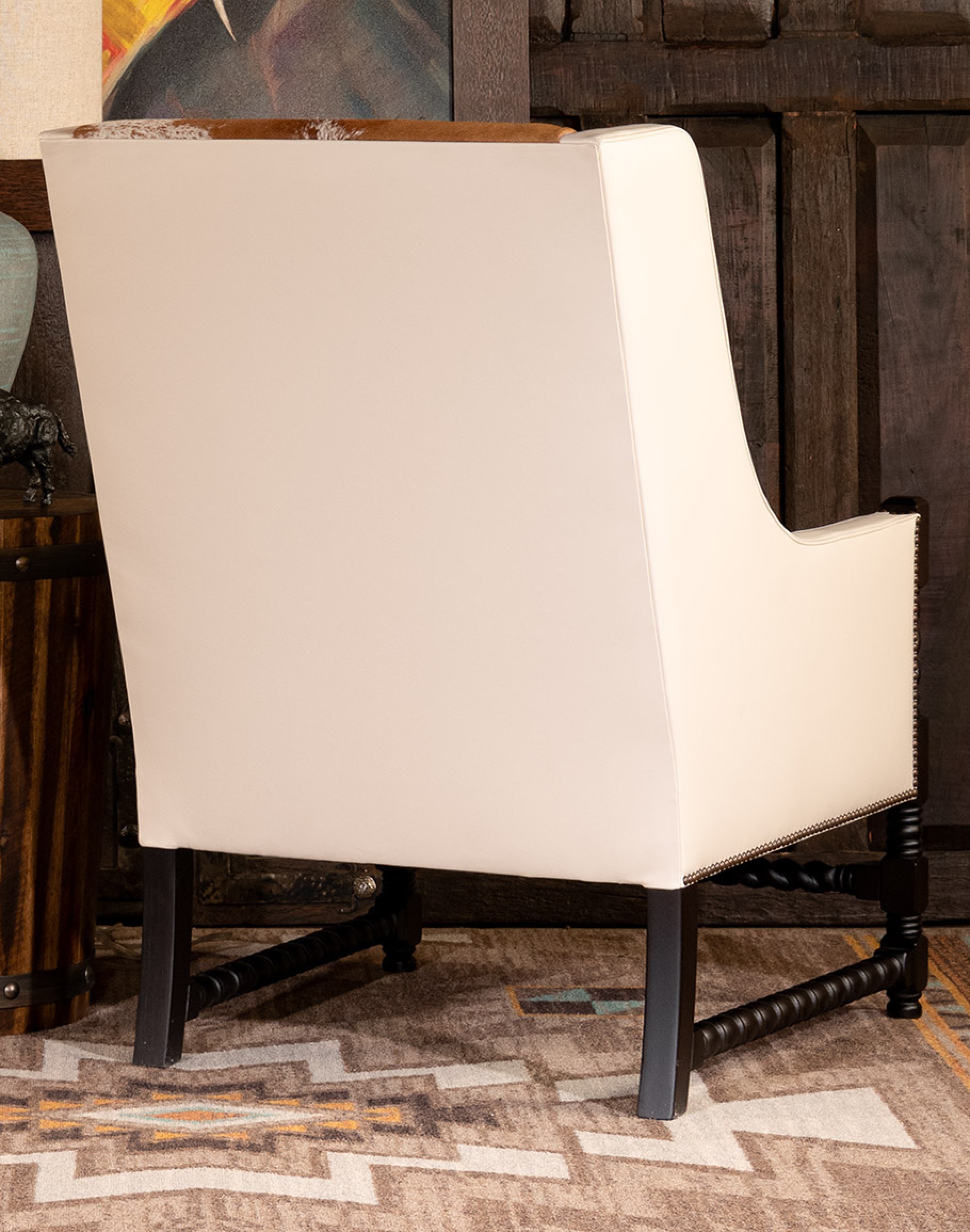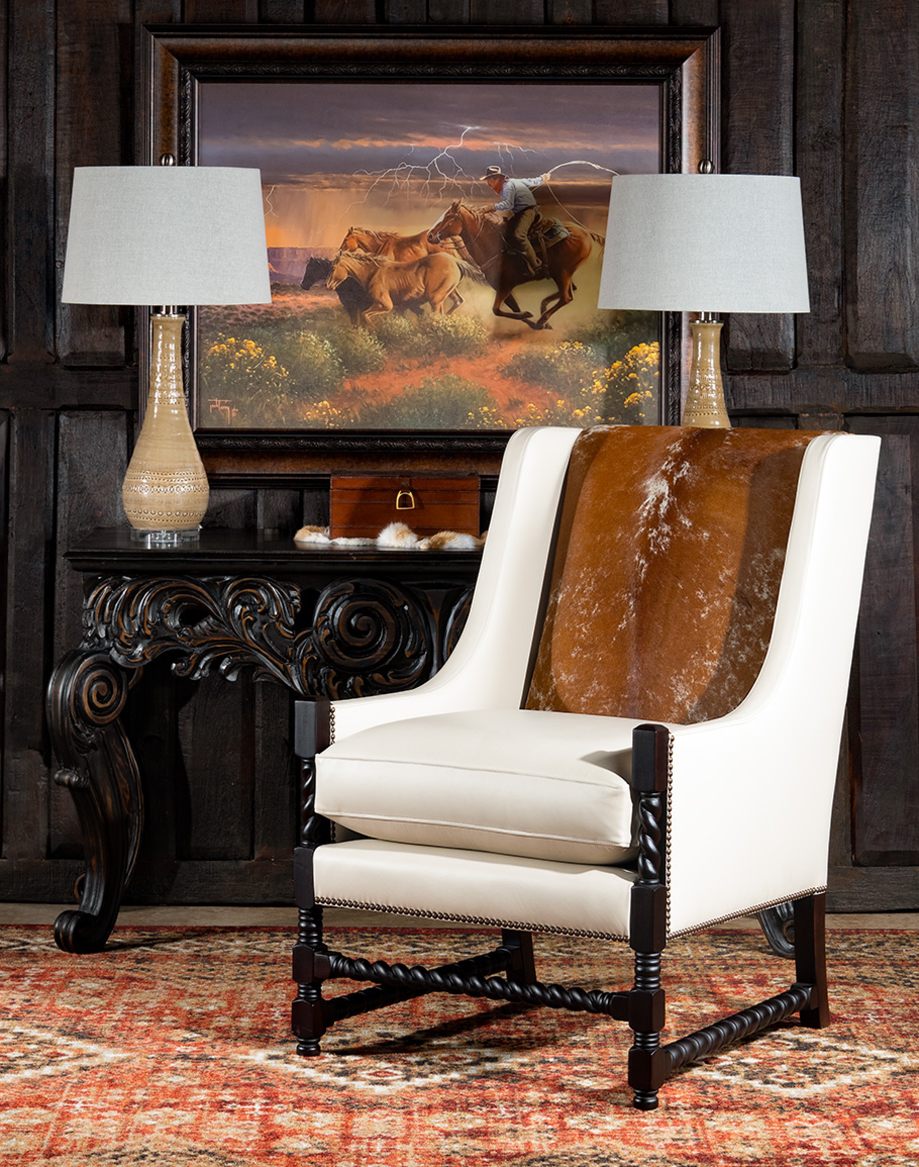 The Bandera Leather Chair not only boasts in beauty, but in comfort as well. Made with 100% top grain leather and premium cowhide accents. Our Bandera Leather Chair is perfect to brighten up your living space, office, or bedroom. The neutral and light color tones of the Bandera Leather Chair allow you to easily contrast darker furniture and decor pieces. This fine leather chair is 100% American Made to the highest standards of quality!