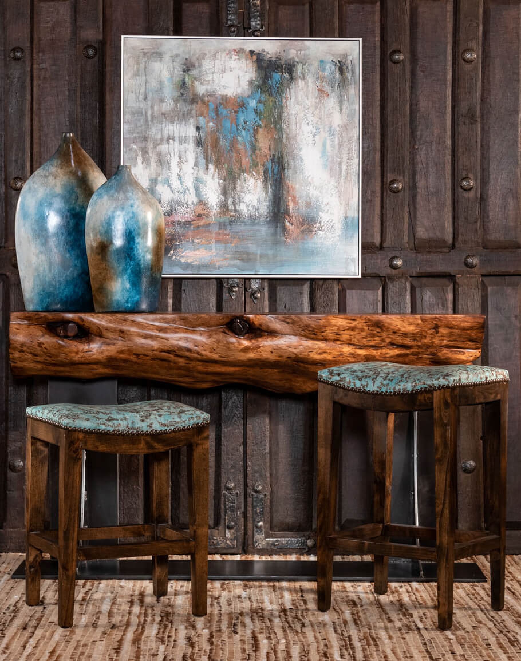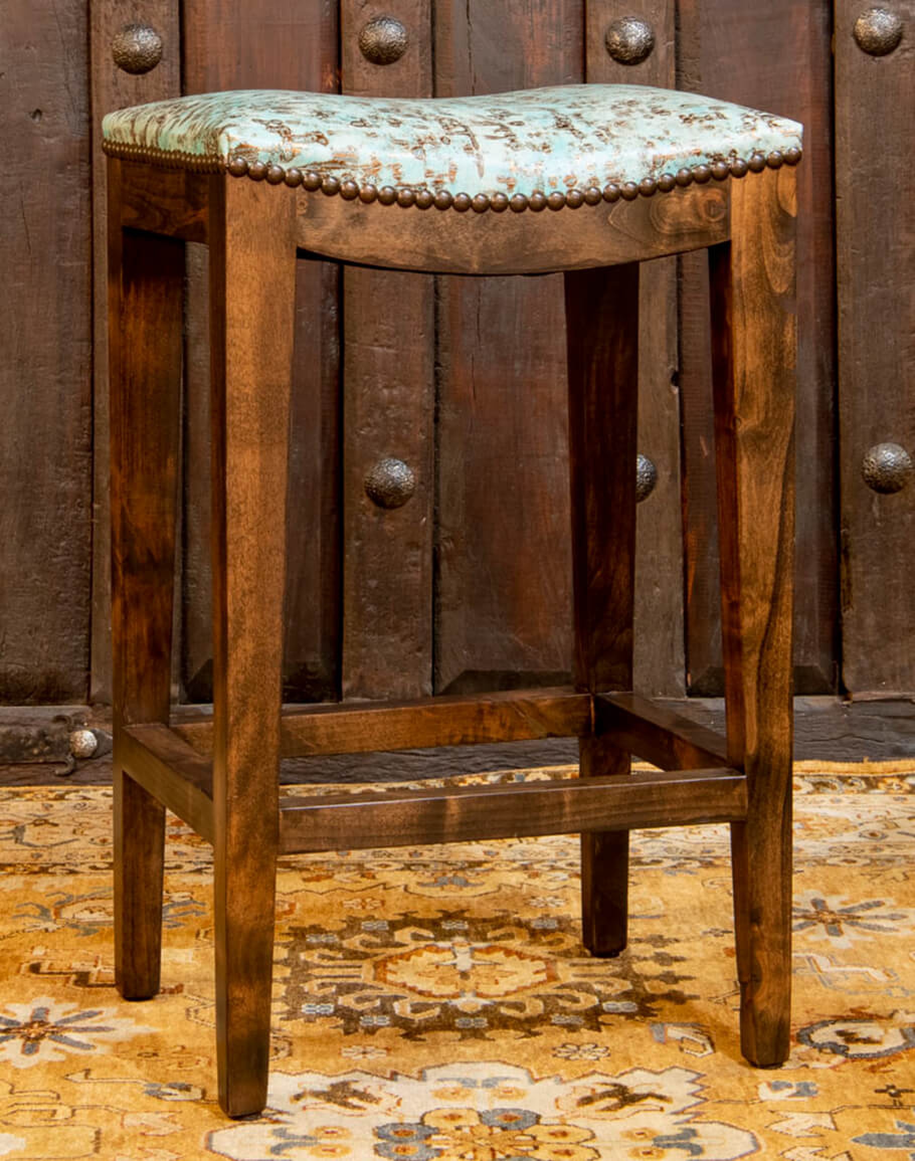 Add a touch of rustic charm and timeless beauty to your home with our Barkley saddle stool. Cleaned-lined and rustic appeal give this stool the perfect balance to be pulled up to kitchen islands, breakfast bars, and pub tables. This barstool is available in both bar and counter height, meaning you can use it to elevate any space! 100% top grain embossed leather features a contrasting colored, abstract bark-like design that encompasses a premium high-density foam cushion, complimented by a row of consecutively placed brass nail heads, while a solid Knotty Alder hardwood frame features a foot rest below for comfort and support. Additionally, the backless saddle seat easily conceals itself beneath counters and bar tops to save space. If your bar or kitchen area is in need of a superior statement piece guaranteed to bring comfort and style, look no further than the luxurious Barkley Saddle Saddle Stool. 100% Texas Made!