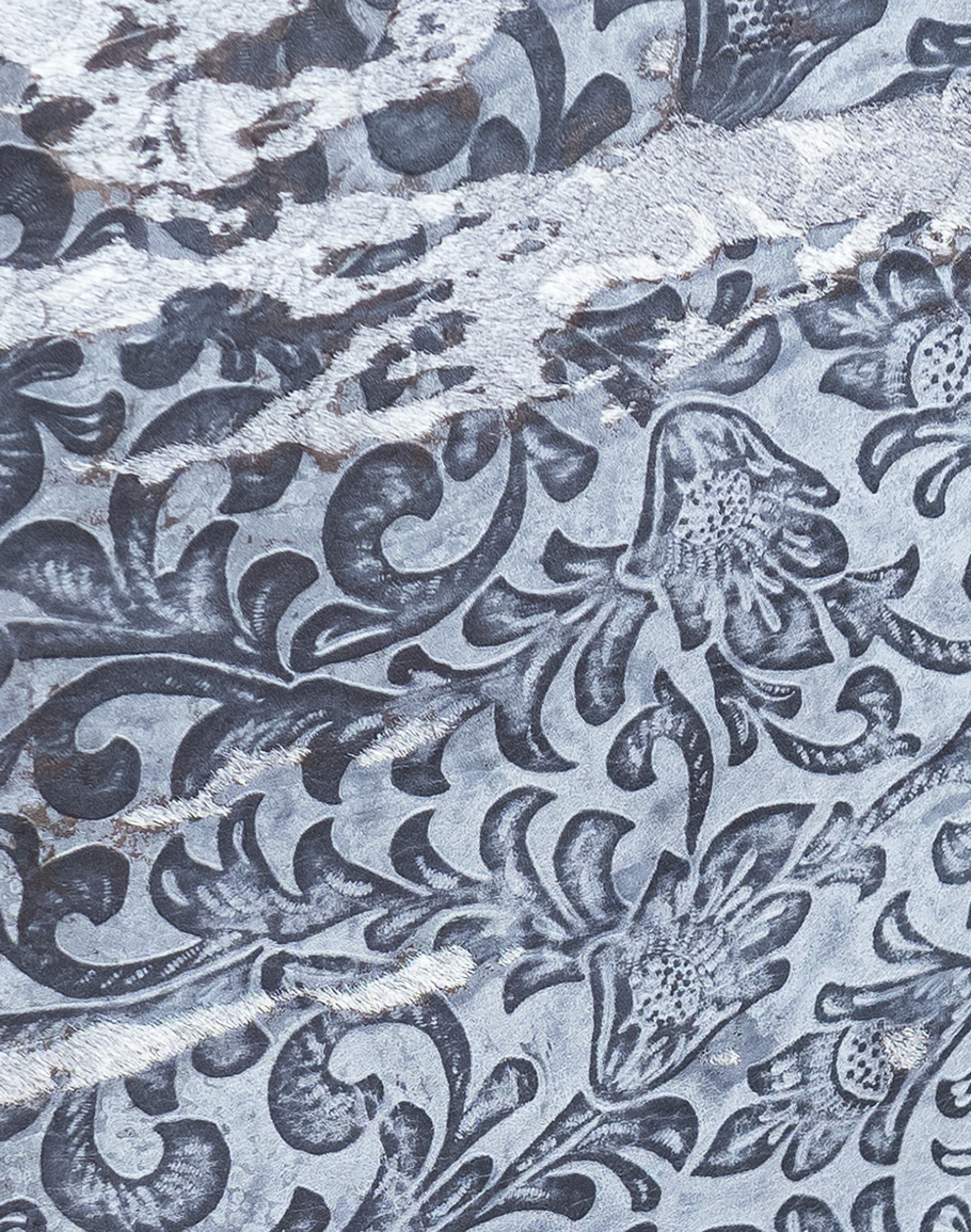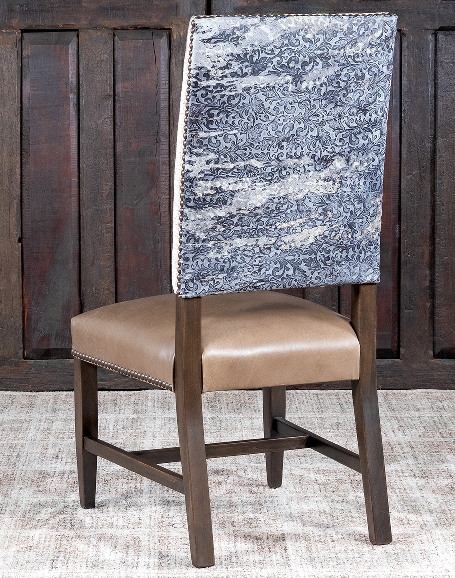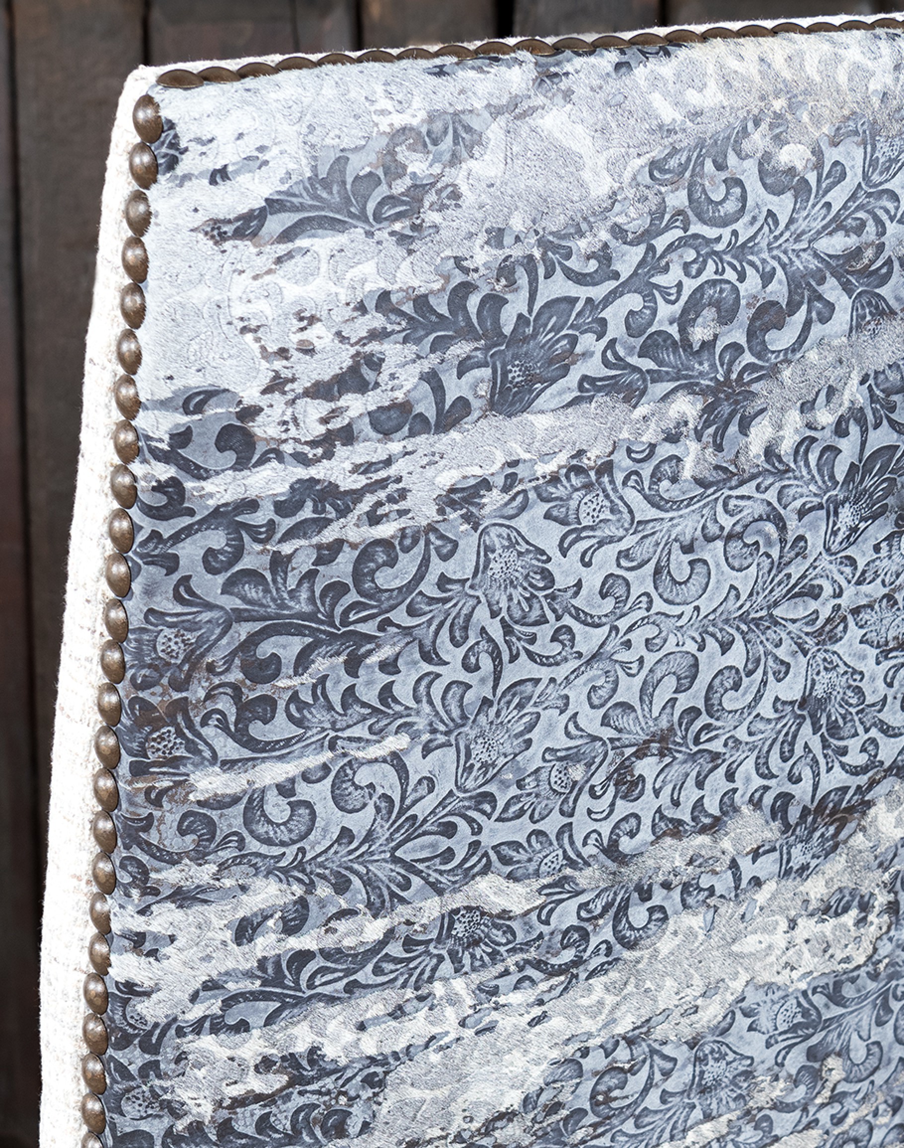Specialty Cowhide Description: Intricate floral patterns and luxurious upholstery grade cow hair-on-hide detailing. This unique stamped cowhide adds a rich, textured element to the chair, showcasing exceptional craftsmanship and design.