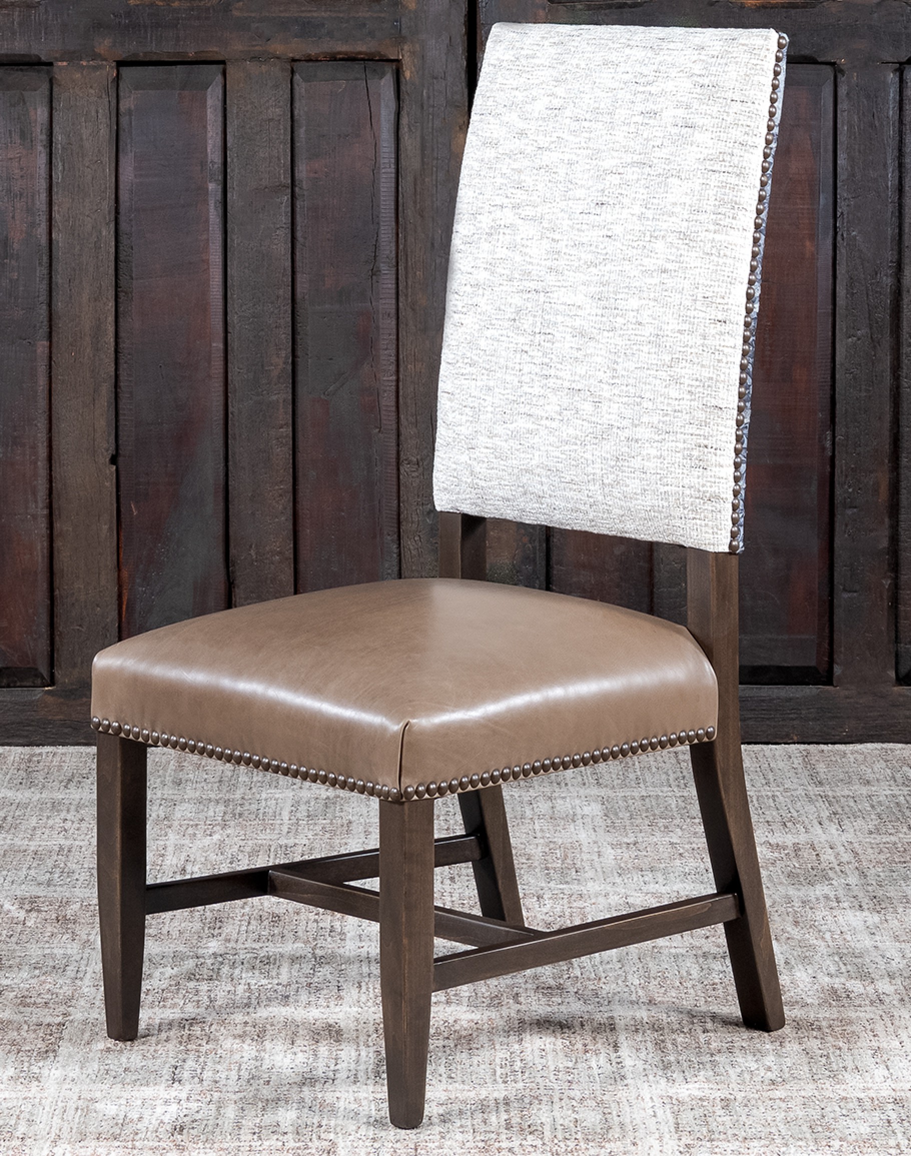 The chair's inside back is adorned with tweed textured fabric, enhancing the visual appeal with a refined contrast to the leather seat. The specialty stamped cowhide on the chair's outer back features intricate floral patterns and hair-on-hide detailing, adding a unique and luxurious element to the design. This distinctive combination of materials and textures makes the Belmont Baltic Blue Dining Chair a true statement piece.