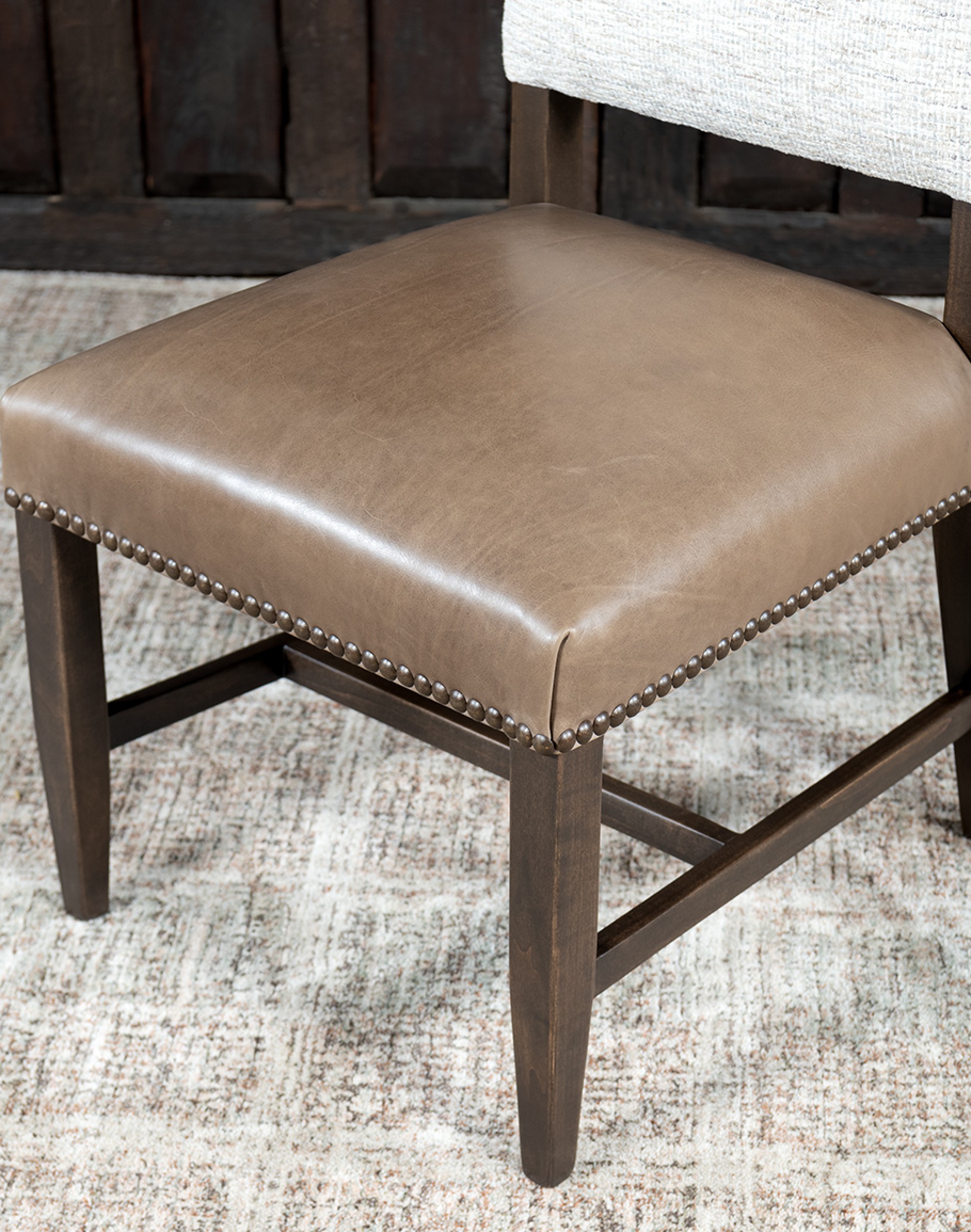 Brass nail tacks embellish the base of the seat cushion and the sides of the seat back, offering a touch of vintage elegance. These fine details reflect the meticulous attention to craftsmanship and design that Adobe Interiors is known for.