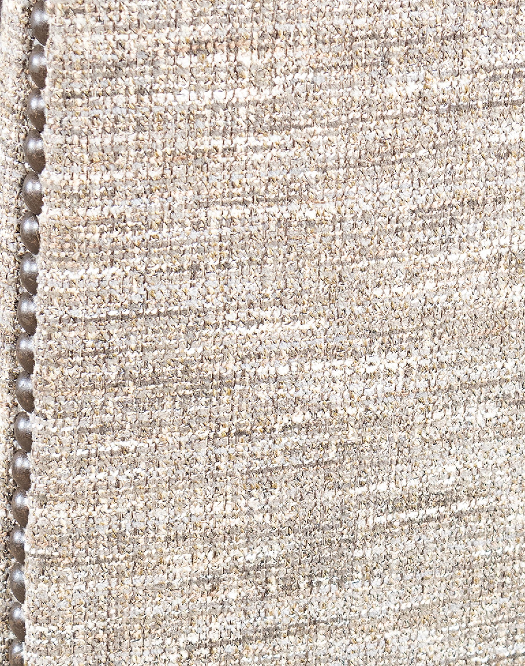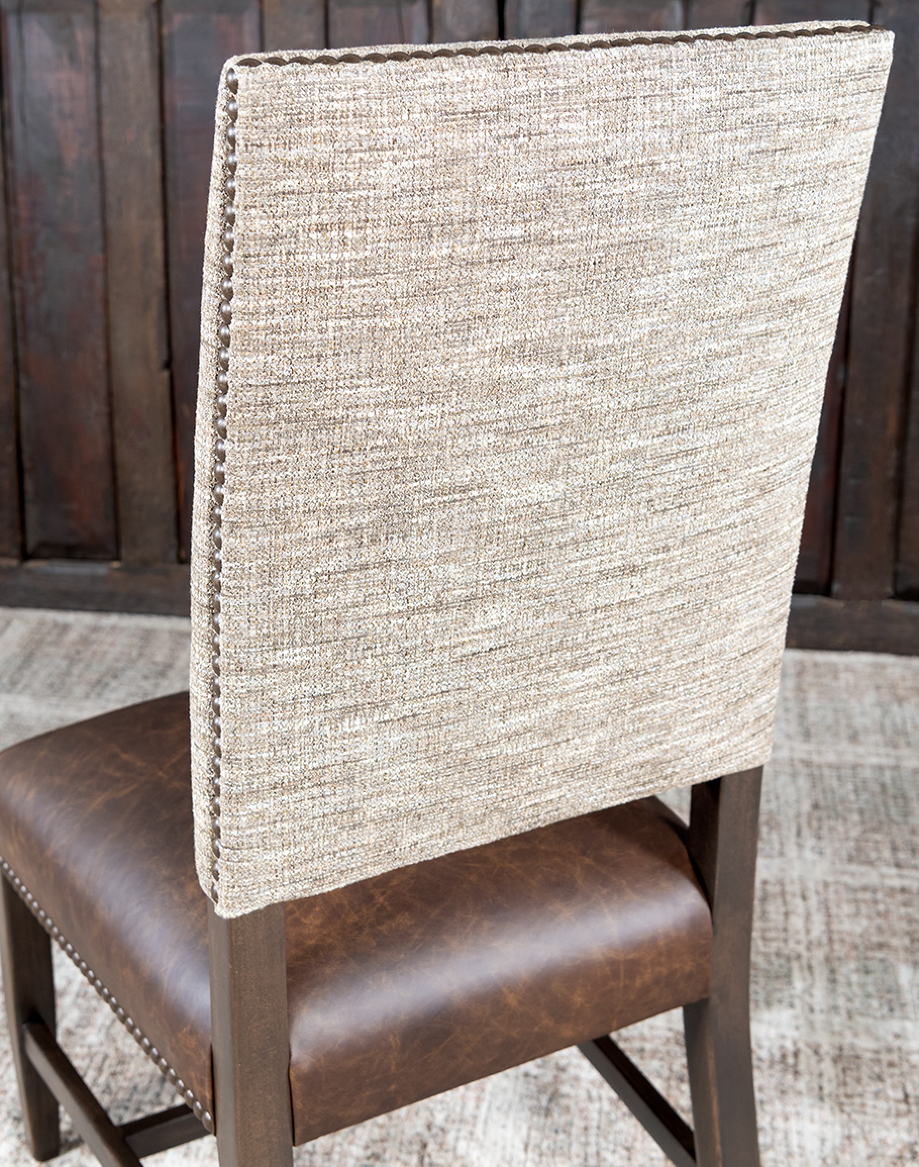 The inside and outside back of the chair are adorned with a tweed textured fabric, offering a refined contrast to the leather seat. This fabric not only enhances the visual appeal but also adds to the chair's tactile charm. Delicate brass nail tacks embellish the base of the seat cushion and the sides of the seat back, adding a touch of vintage elegance. These details reflect the meticulous attention to craftsmanship and design.