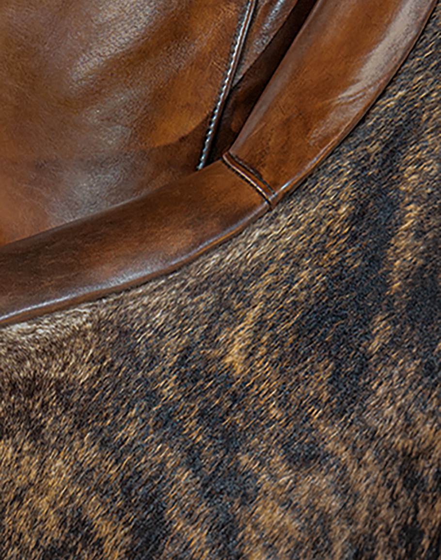 The Belton Brindle is not just any chair; it’s a showcase of the finest materials. The interior is upholstered in premium full-grain leather, enriched with hand-burnished details that exude a sense of refined elegance. Complementing the plush leather, the sides and outside back are wrapped in upholstery-grade cowhide, featuring a distinctive brindle pattern that adds a unique visual texture and a touch of rustic charm to its appearance.