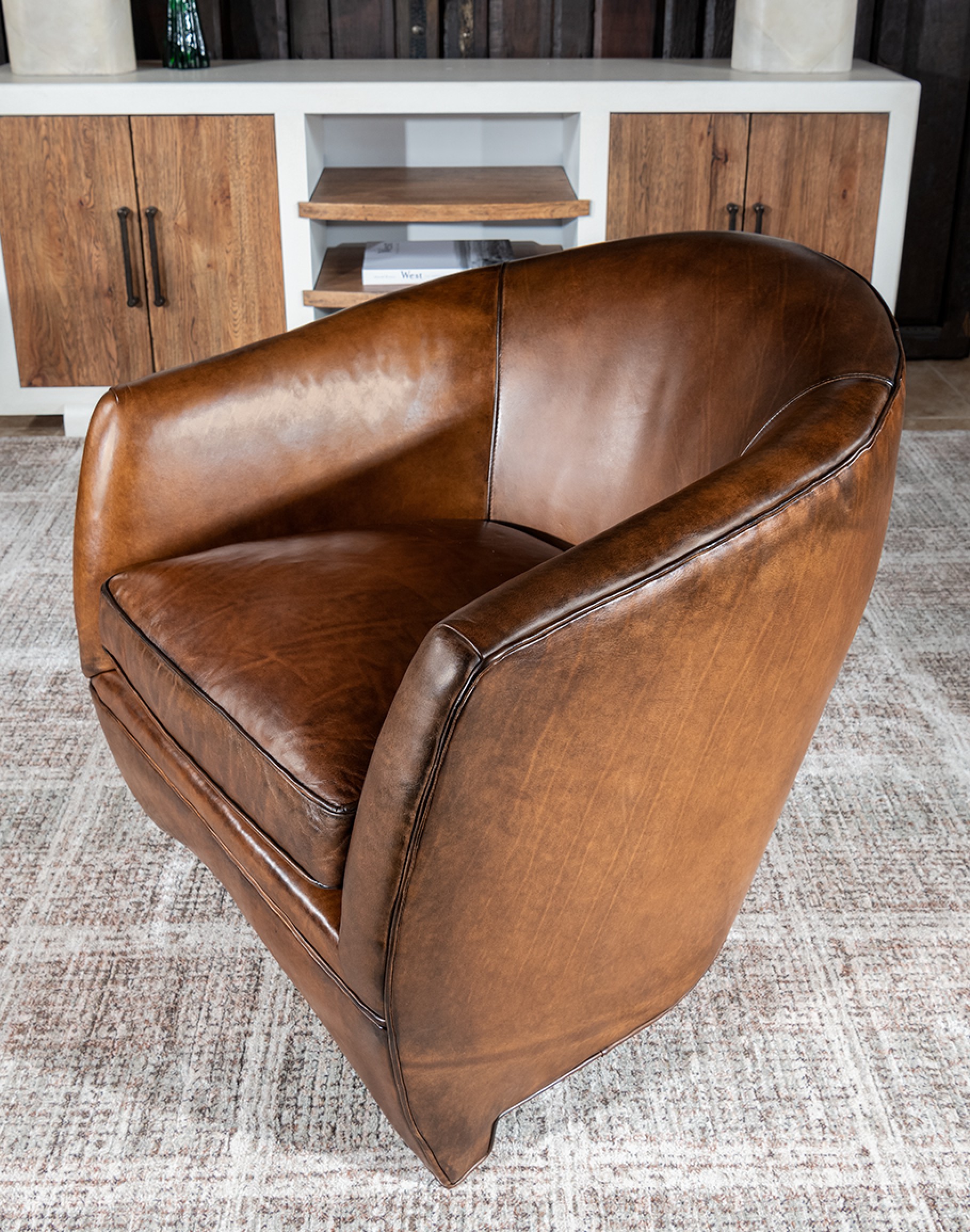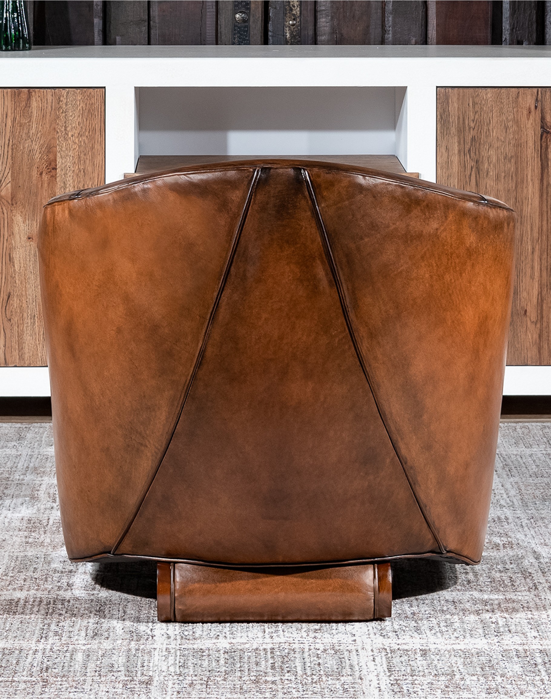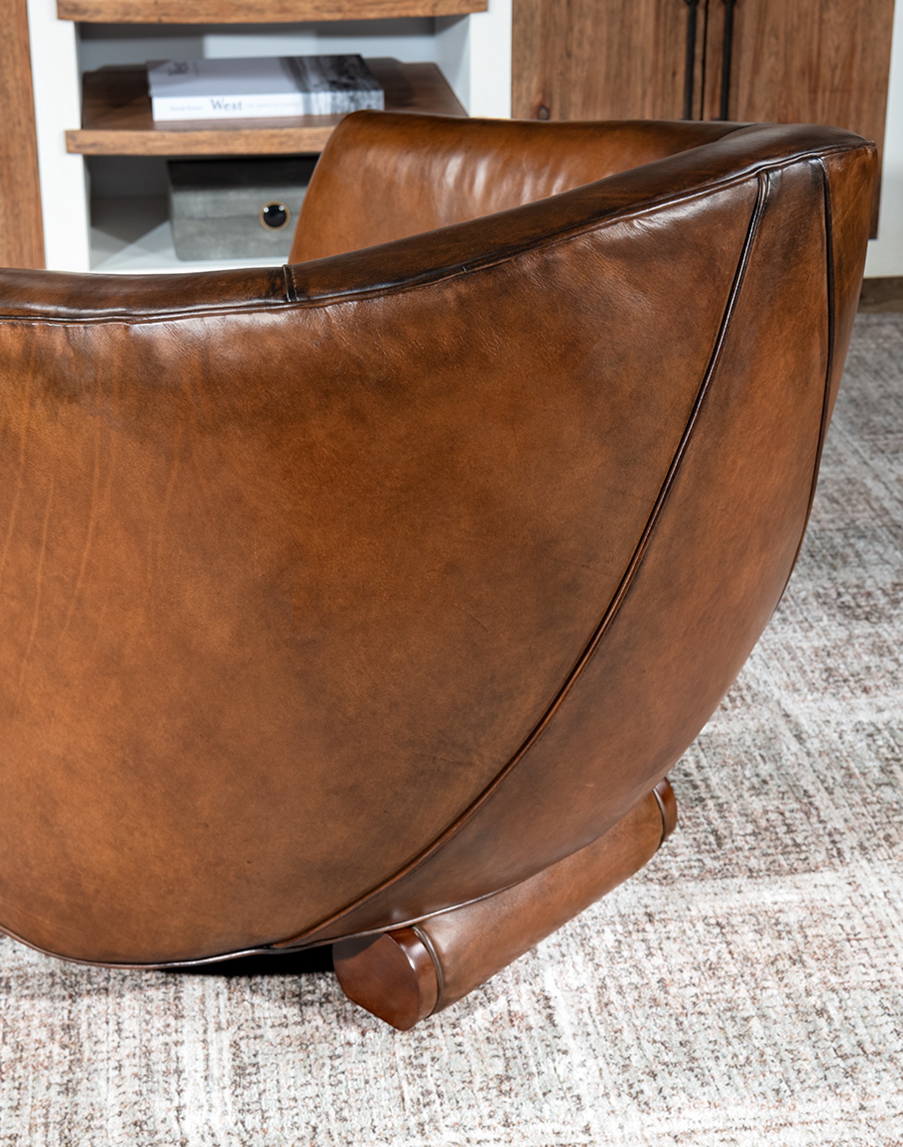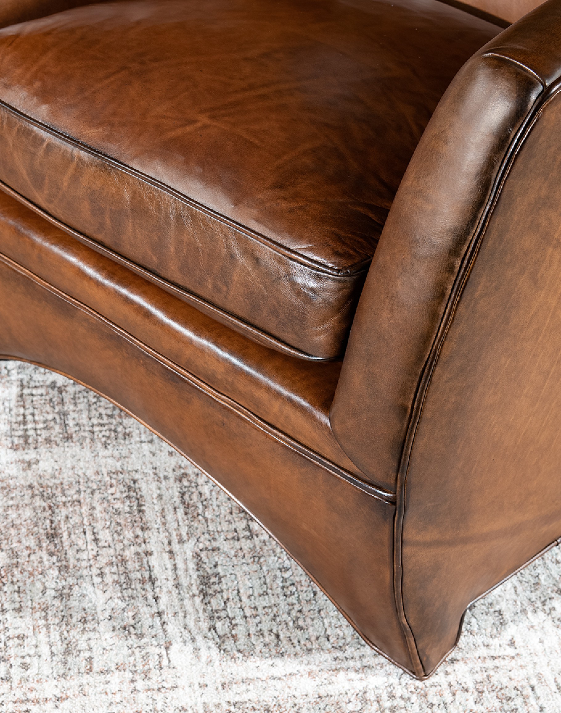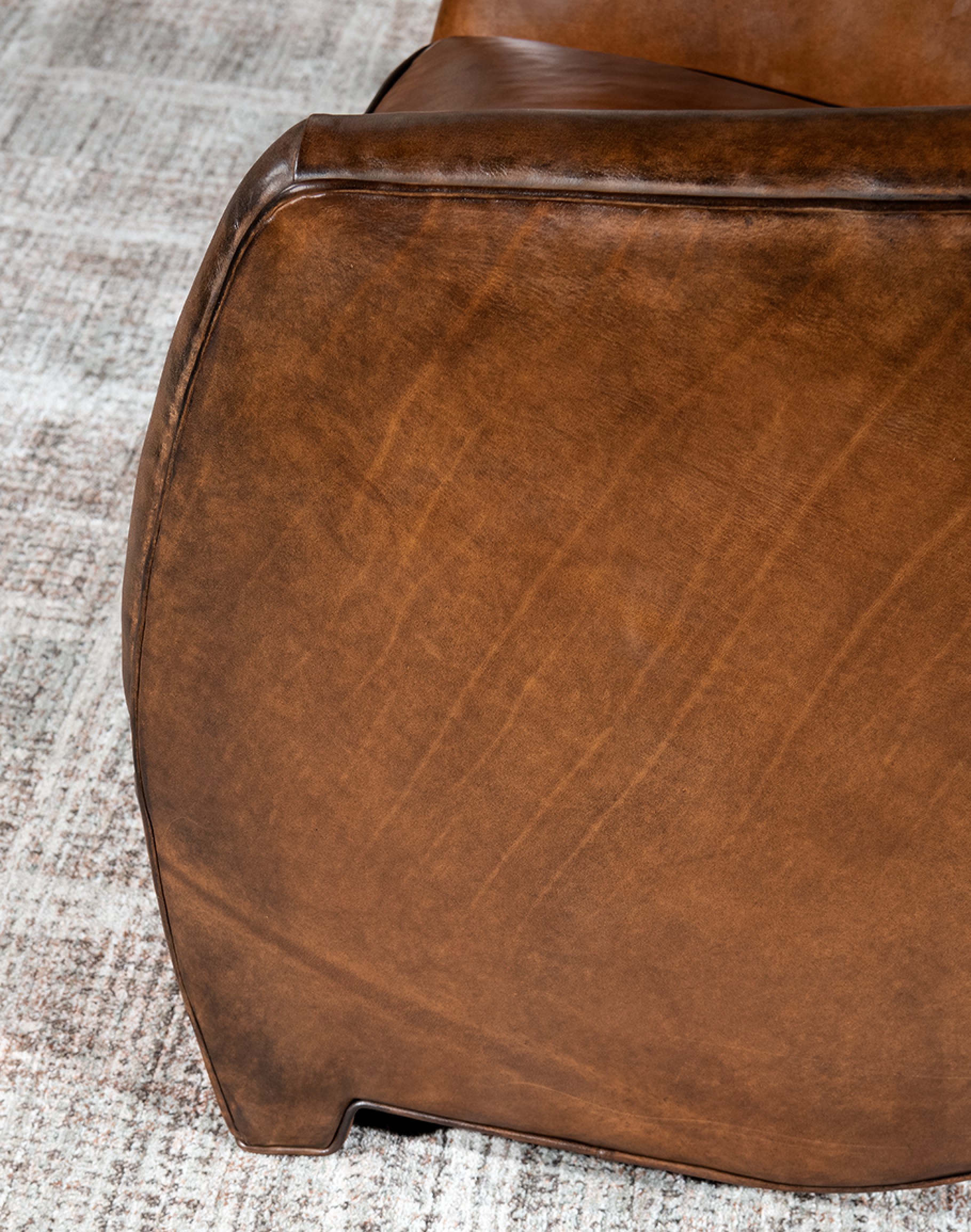 Leather Description: This is a full grain aniline leather tanned in a historic leather producing region of Italy using English hides. The century old tannery prepares this leather article by applying a hot wax, then turning the hides in old wooden tanning drums overnight to soften the natural fibers and impart it with a remarkable suppleness. The leather is then upholstered in its "crust form" on the furniture in North Carolina, After the furniture is made our leather artisans apply a multi step hand rubbed Patina using the same waxes and pigments used in Italy. Performing this process on the actual finished piece allows our artisans to develop a unique Patina, composition, and overall essence that creates a piece of furniture that has uniqueness, character and style that matches the individual who's selecting it. This leather imparts the feeling of a softer, well broken in leather one might find on a decades old chair discovered in a French country estate or the Parisian flea market. The leather is brand new from our Artisans hands... without the aging issues that sometimes come from the hands of time. Truly a unique, hand-made article in an era when only companies committed to the highest standards lavish this sort of attention and time to unique American made furniture.