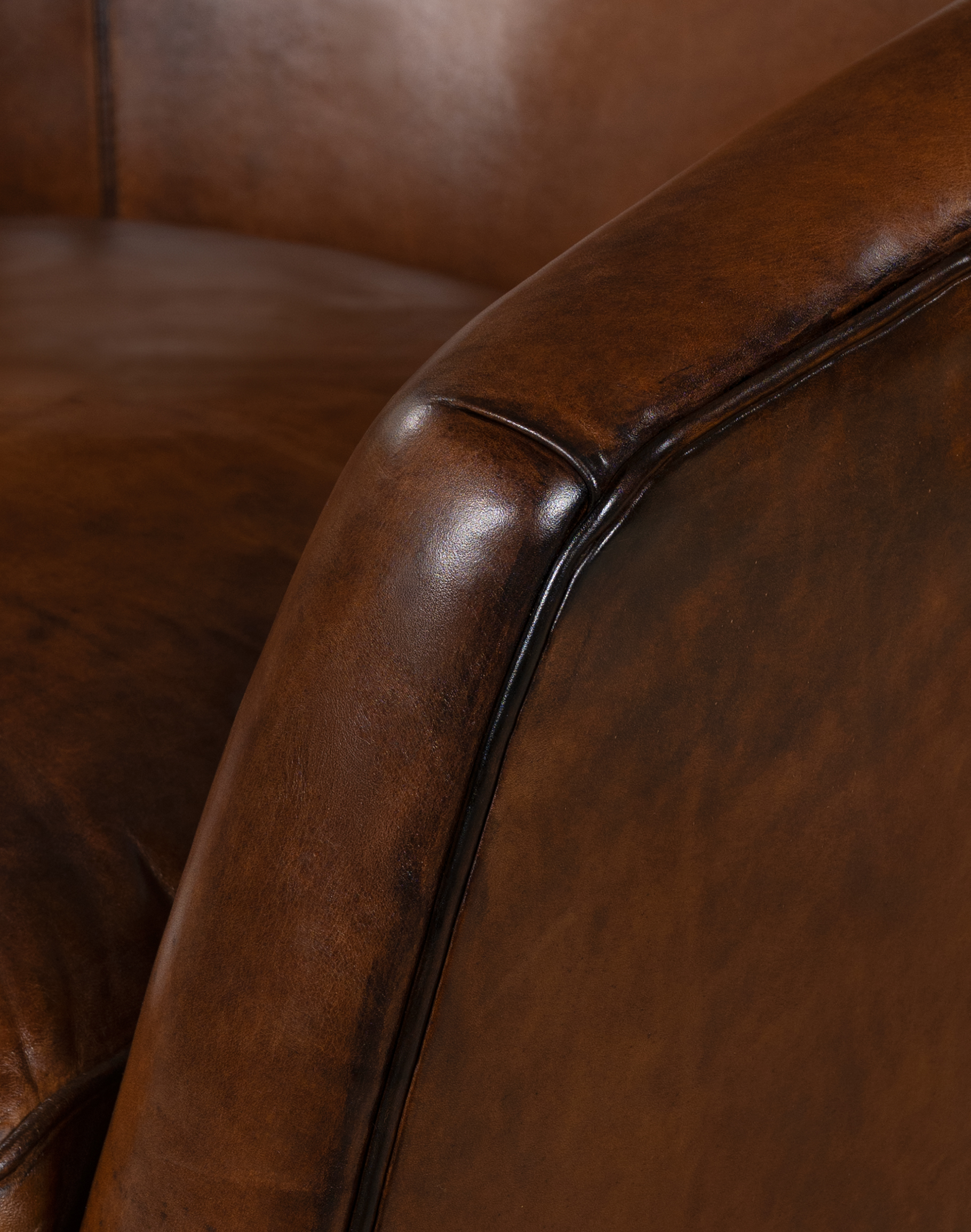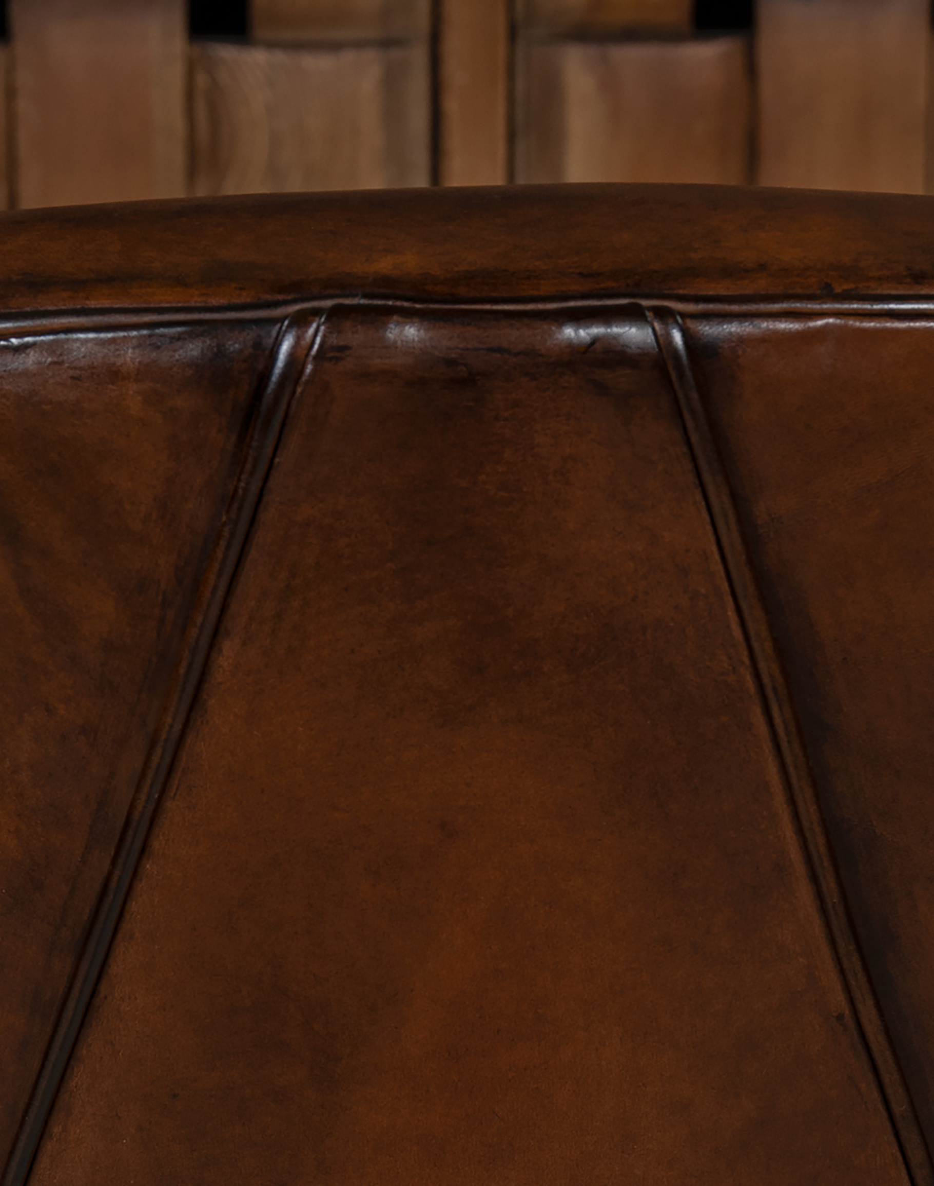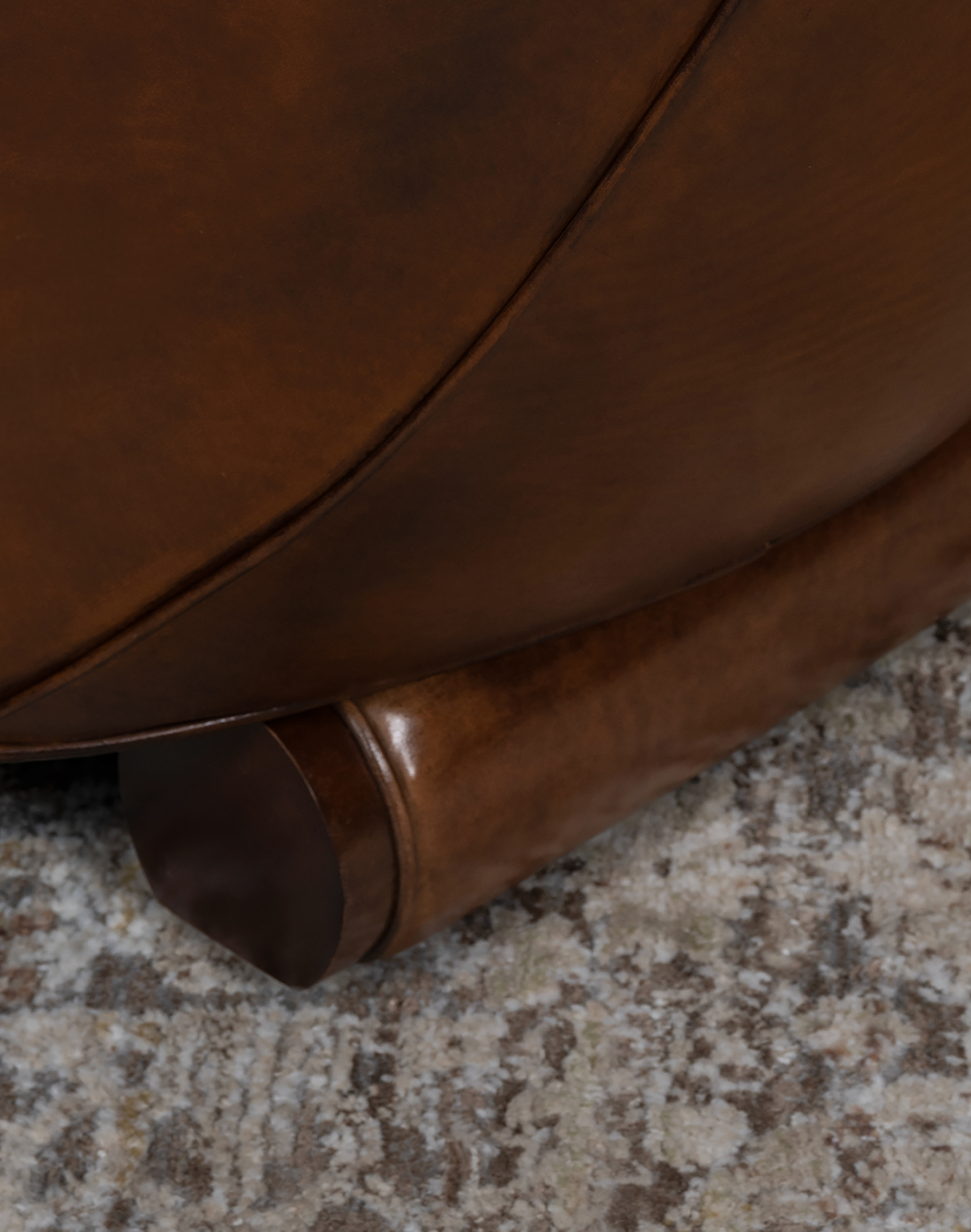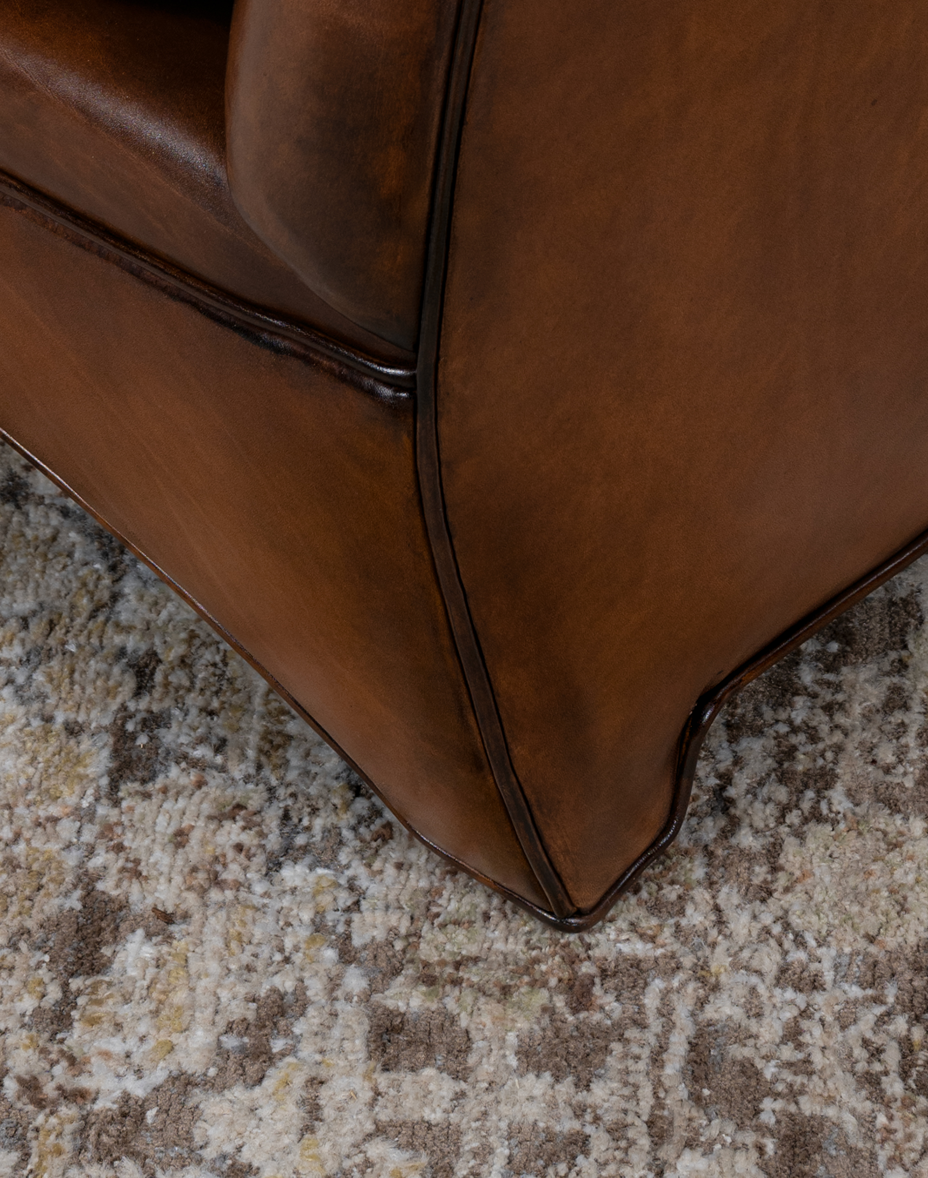 Leather Description: This is a full grain aniline leather tanned in a historic leather producing region of Italy using English hides. The century old tannery prepares this leather article by applying a hot wax, then turning the hides in old wooden tanning drums overnight to soften the natural fibers and impart it with a remarkable suppleness. The leather is then upholstered in its "crust form" on the furniture in North Carolina, After the furniture is made our leather artisans apply a multi step hand rubbed Patina using the same waxes and pigments used in Italy. Performing this process on the actual finished piece allows our artisans to develop a unique Patina, composition, and overall essence that creates a piece of furniture that has uniqueness, character and style that matches the individual who's selecting it. This leather imparts the feeling of a softer, well broken in leather one might find on a decades old chair discovered in a French country estate or the Parisian flea market. The leather is brand new from our Artisans hands... without the aging issues that sometimes come from the hands of time. Truly a unique, hand-made article in an era when only companies committed to the highest standards lavish this sort of attention and time to unique American made furniture.