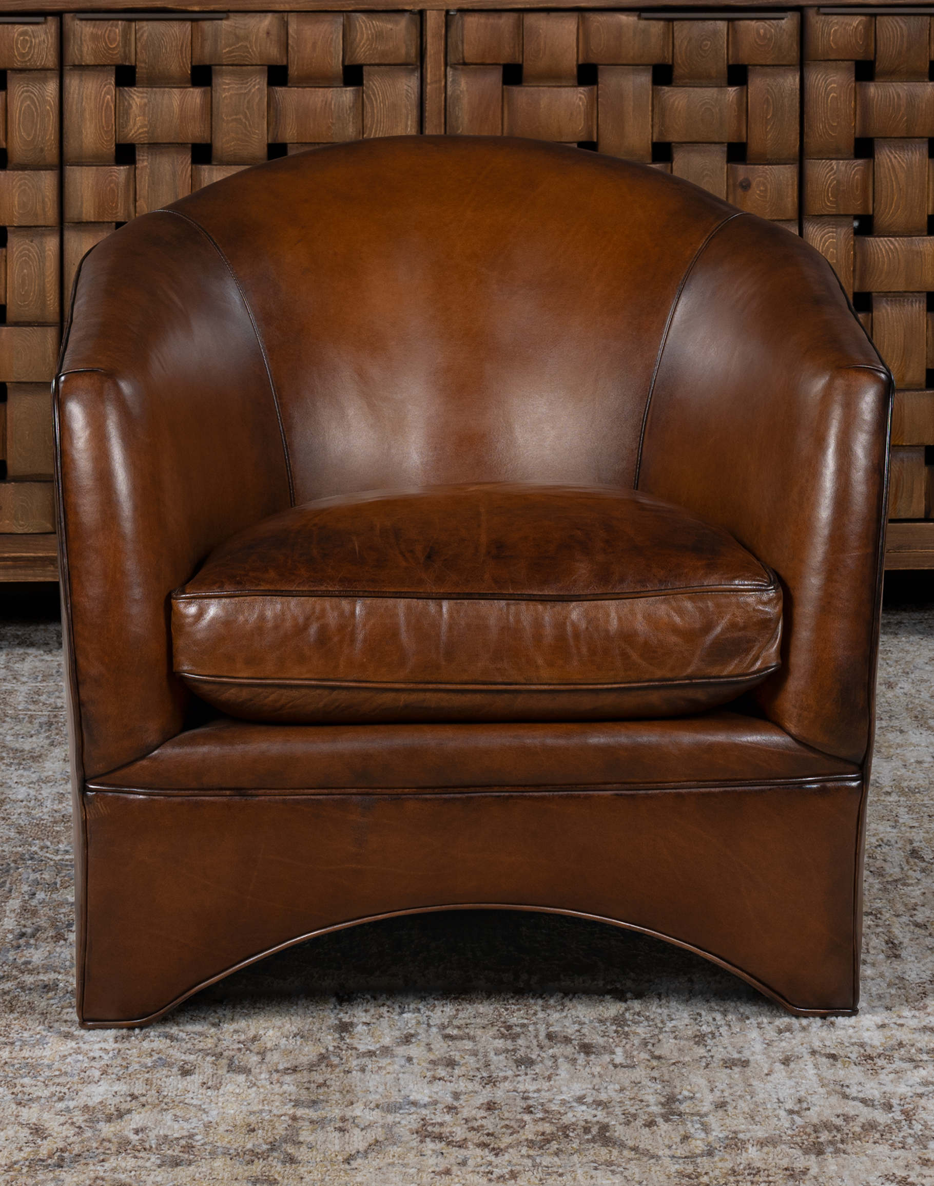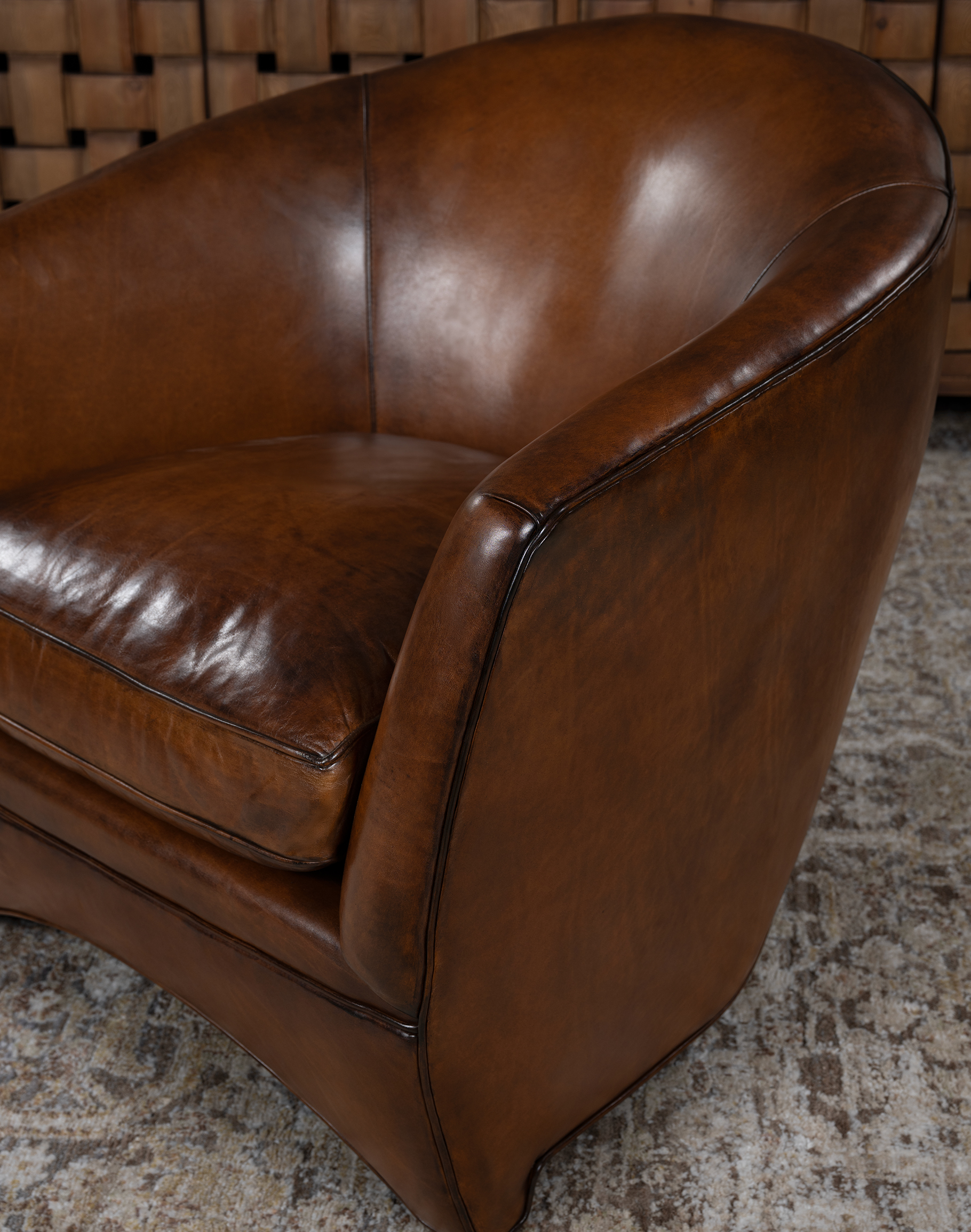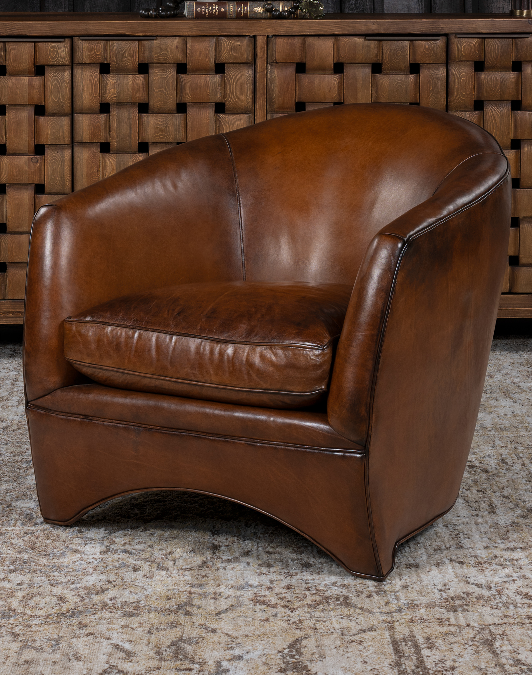 Shop Our Benson Barrel Accent Chair in Rich Brown color. Crafted with Full Grain Leather and featuring an 8 Way Hand Tied construction for durability. A perfect addition to any Modern Ranch space, brought to you by Adobe Interiors.