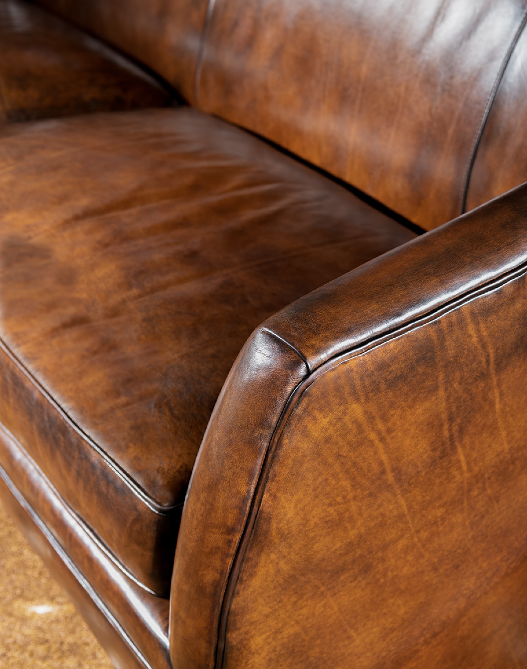 Leather Description: Artisan Leathers beautifully evoke this time worn quality, unique to every individual piece, like the originals. To pure aniline leather crusts, already fully and carefully upholstered to the piece, a base color is created with multiple applications of waxes and oils, hand-worked by the leather Artisan. After drying, this craftsman then carefully builds-up the finish with an expert's eye, and touch, to achieve an aged patina in just the right places to reflect the aged qualities only time, wear, and frequent care could have accomplished naturally. Every individual piece upholstered with Artisan Leather finishing methods is first beautifully built to the highest standards of quality. The leather is then hand-colored and aged to bespeak the loving touch of time, providing a quality antique appearance to a beautiful new piece of quality leather furniture. Every chair, sofa, or bench has its very own unique identity only these hand-crafted methods can provide, reflecting the presence of a time honored past.