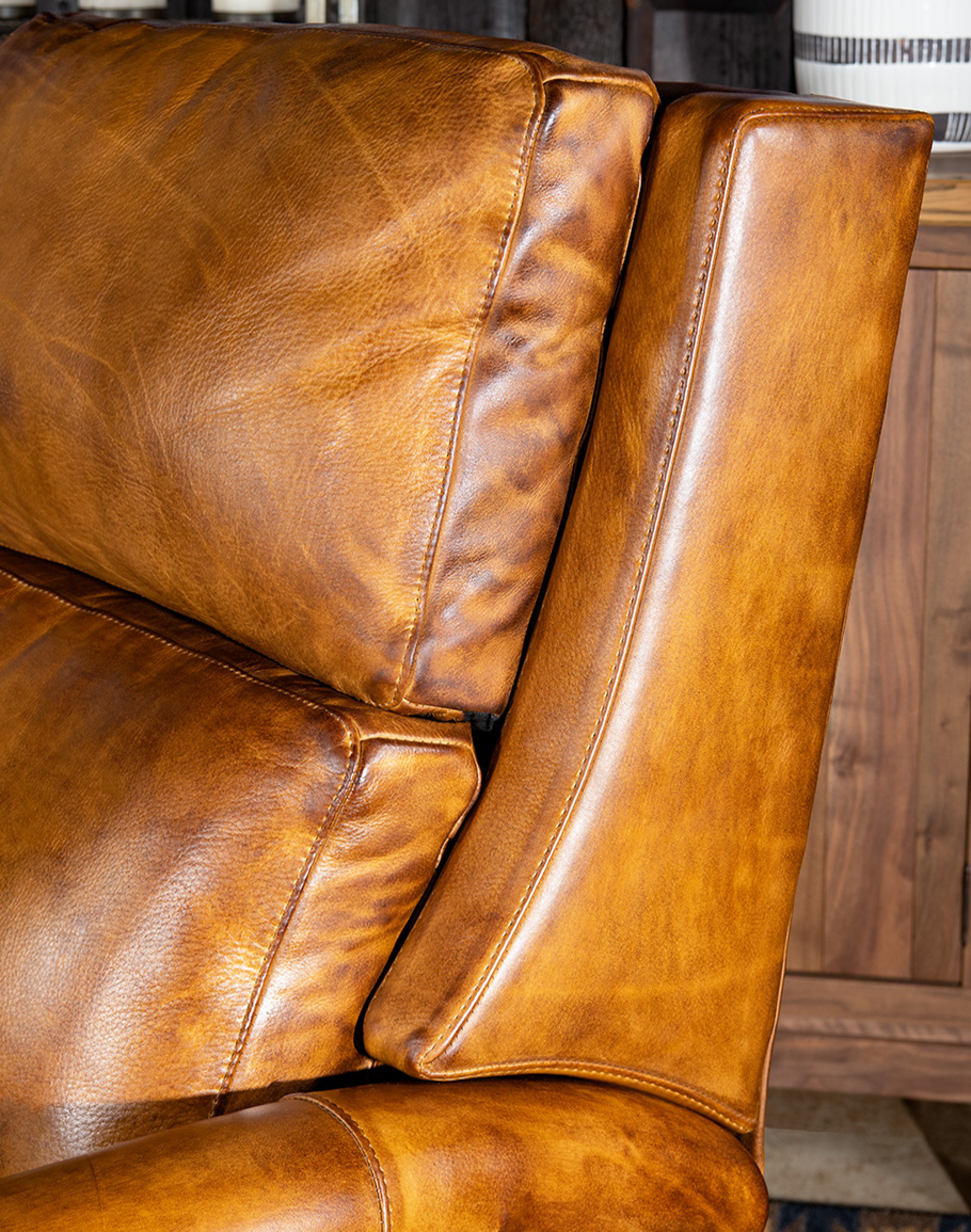 Leather Description: Artisan Leathers beautifully evoke this time worn quality, unique to every individual piece, like the originals. To pure aniline leather crusts, already fully and carefully upholstered to the piece, a base color is created with multiple applications of waxes and oils, hand-worked by the leather Artisan. After drying, this craftsman then carefully builds-up the finish with an expert’s eye, and touch, to achieve an aged patina in just the right places to reflect the aged qualities only time, wear, and frequent care could have accomplished naturally. Every individual piece upholstered with Artisan Leather finishing methods is first beautifully built to the highest standards of quality. The leather is then hand-colored and aged to bespeak the loving touch of time, providing a quality antique appearance to a beautiful new piece of quality leather furniture. Every chair, sofa, or bench has its very own unique identity only these hand-crafted methods can provide, reflecting the presence of a time honored past.