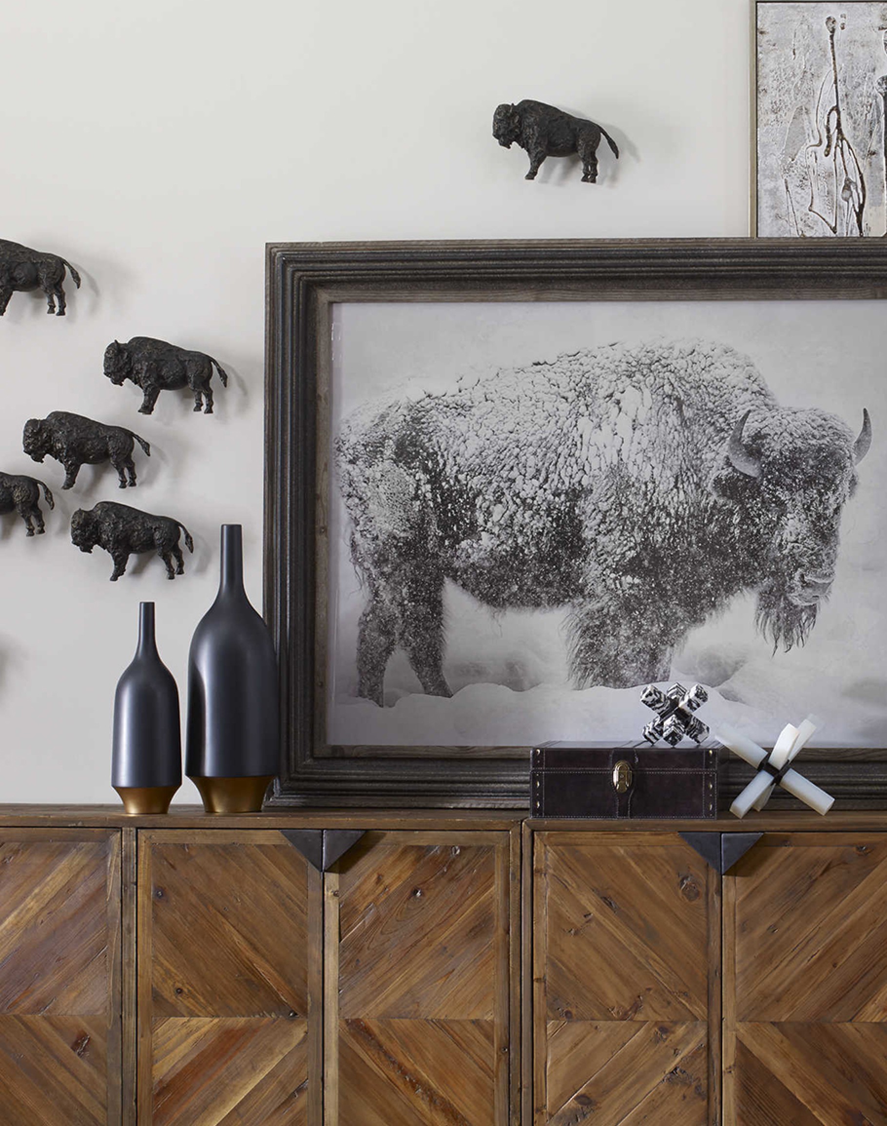 This American icon is sculpted in iron and finished in rich bronze. Create a home on the range with a herd of multiple Bison wall sculptures. Hangs easily with an included hanger.
