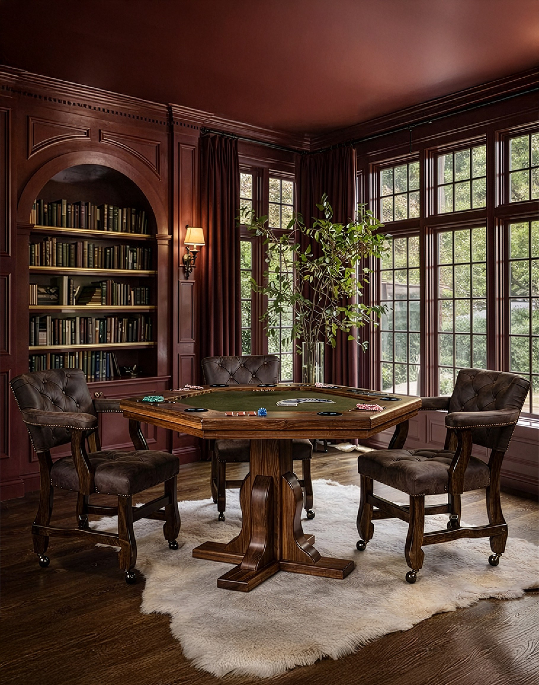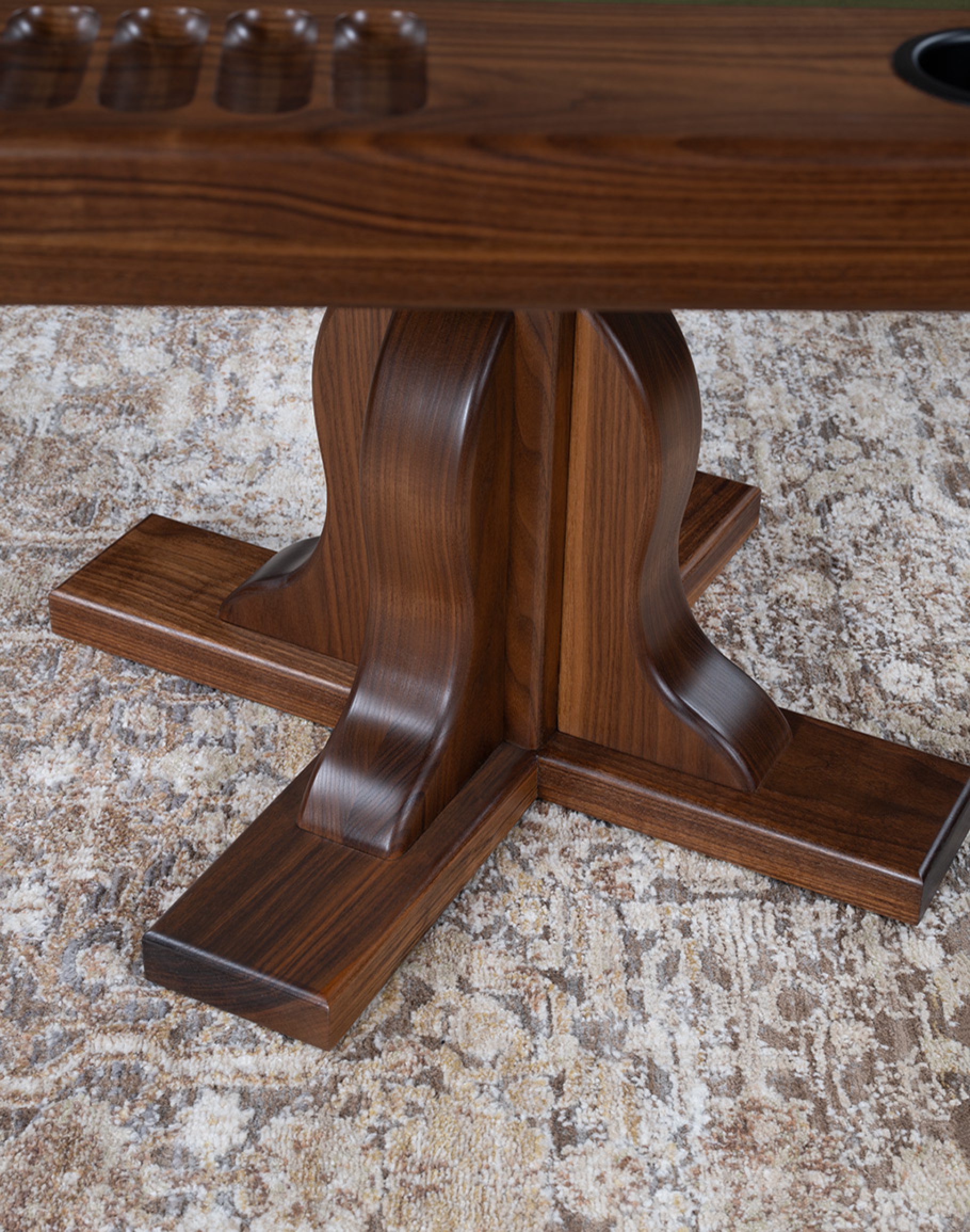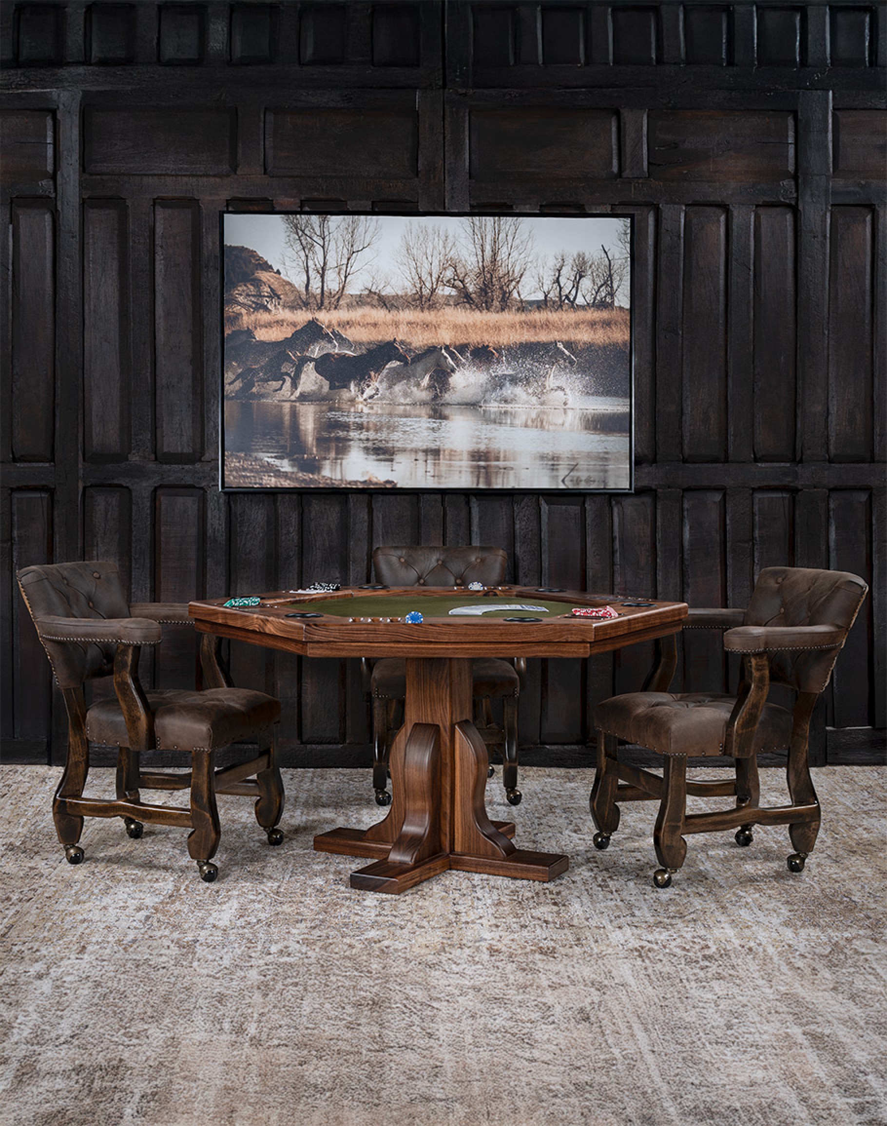 The Black Walnut Poker Game Table delivers true, heirloom-level craftsmanship—100% American made to the highest standards of quality and build. Designed as a statement piece for a game room, study, or refined “man cave,” this table blends architectural woodworking with tailored, designer-grade detail.