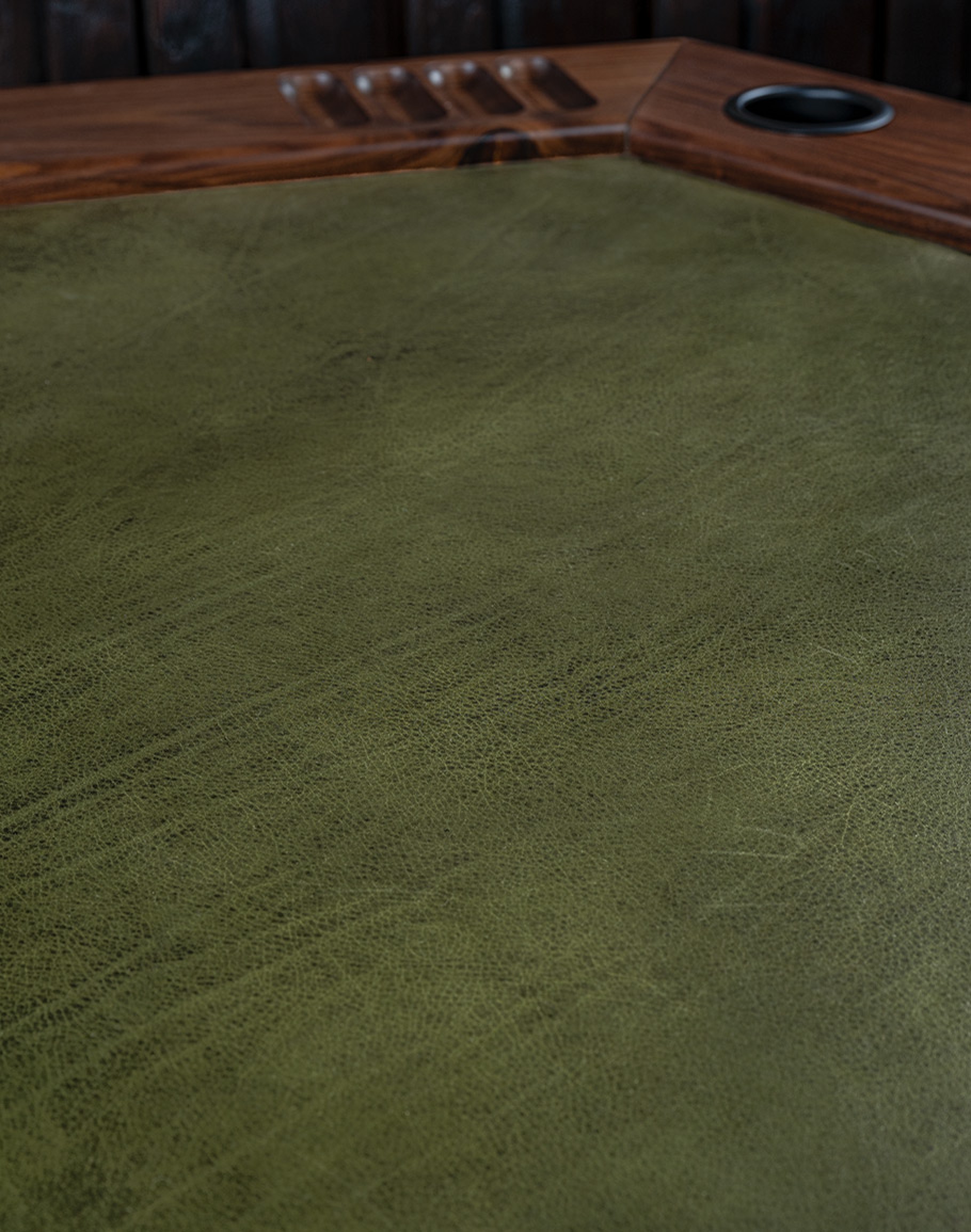 Crafted in rich Black Walnut with a warm espresso-brown tone and natural grain movement, the hexagonal top features a sleek, mitered rail that reads clean and custom from every angle. At the center, an inset deep olive / forest-olive leather playing surface adds a sophisticated, club-inspired look while providing a smooth, controlled feel for dealing and play. Each player station is thoughtfully engineered with intergrated chip holders—hand-carved recessed channels that keep stacks organized and within easy reach— and matte black cup holders seamlessly set into the rail for effortless hosting.