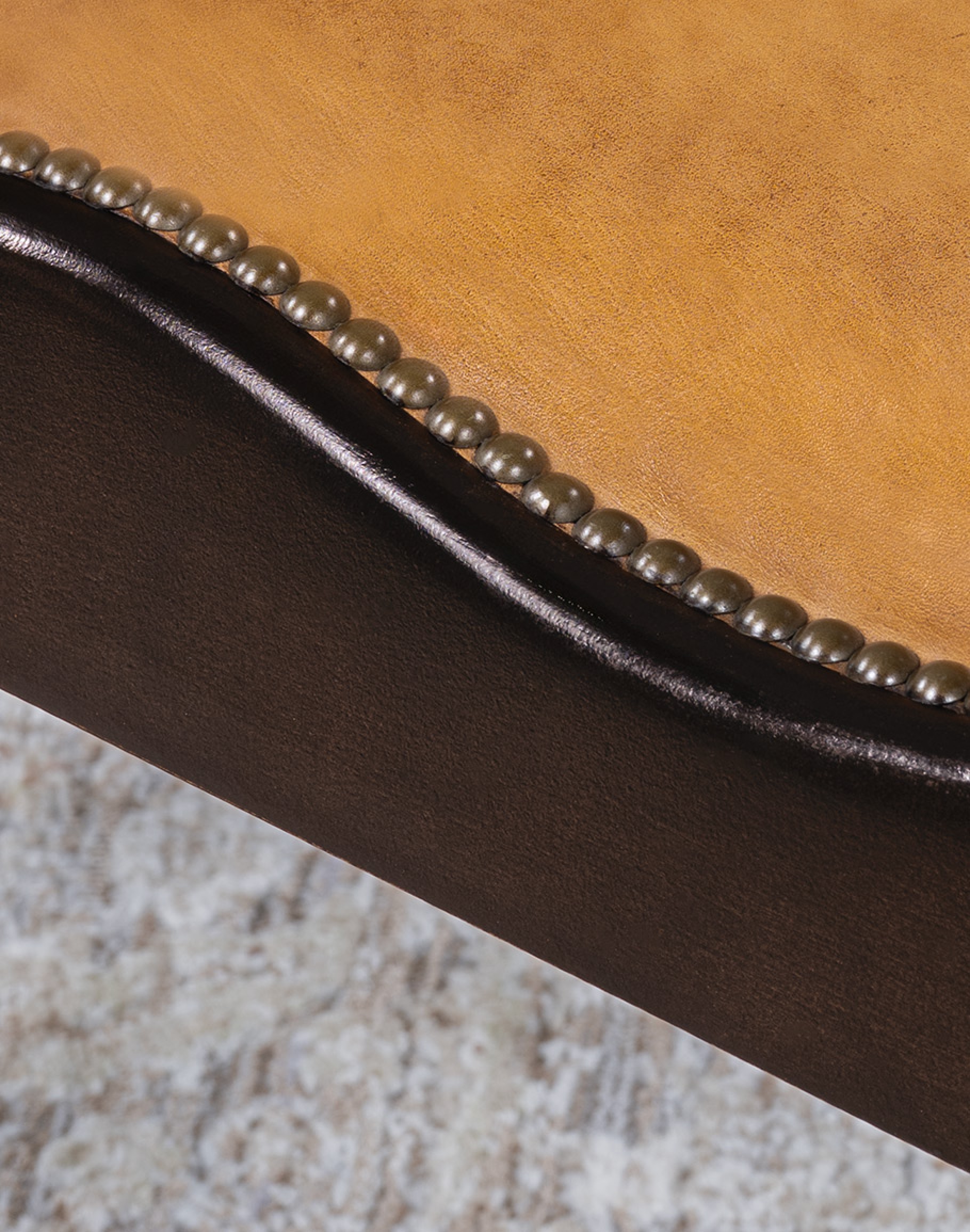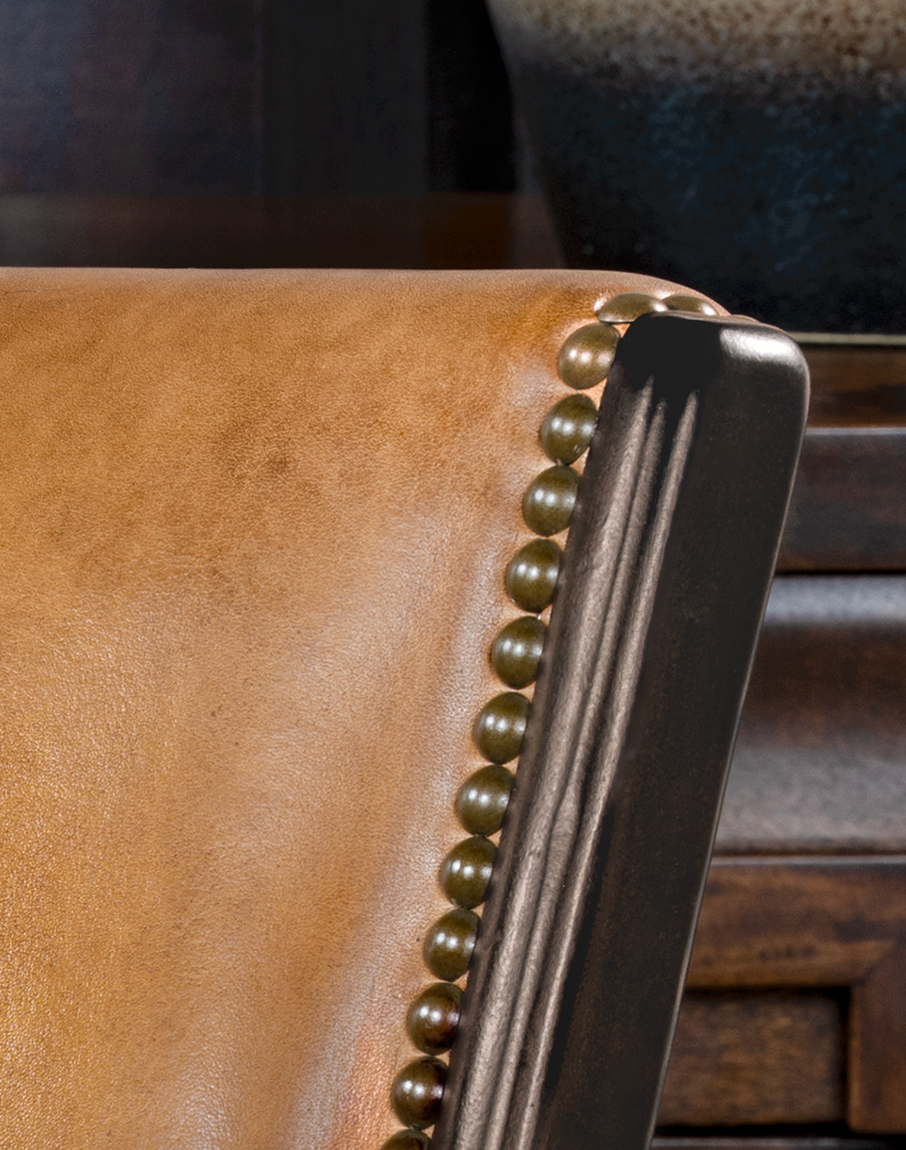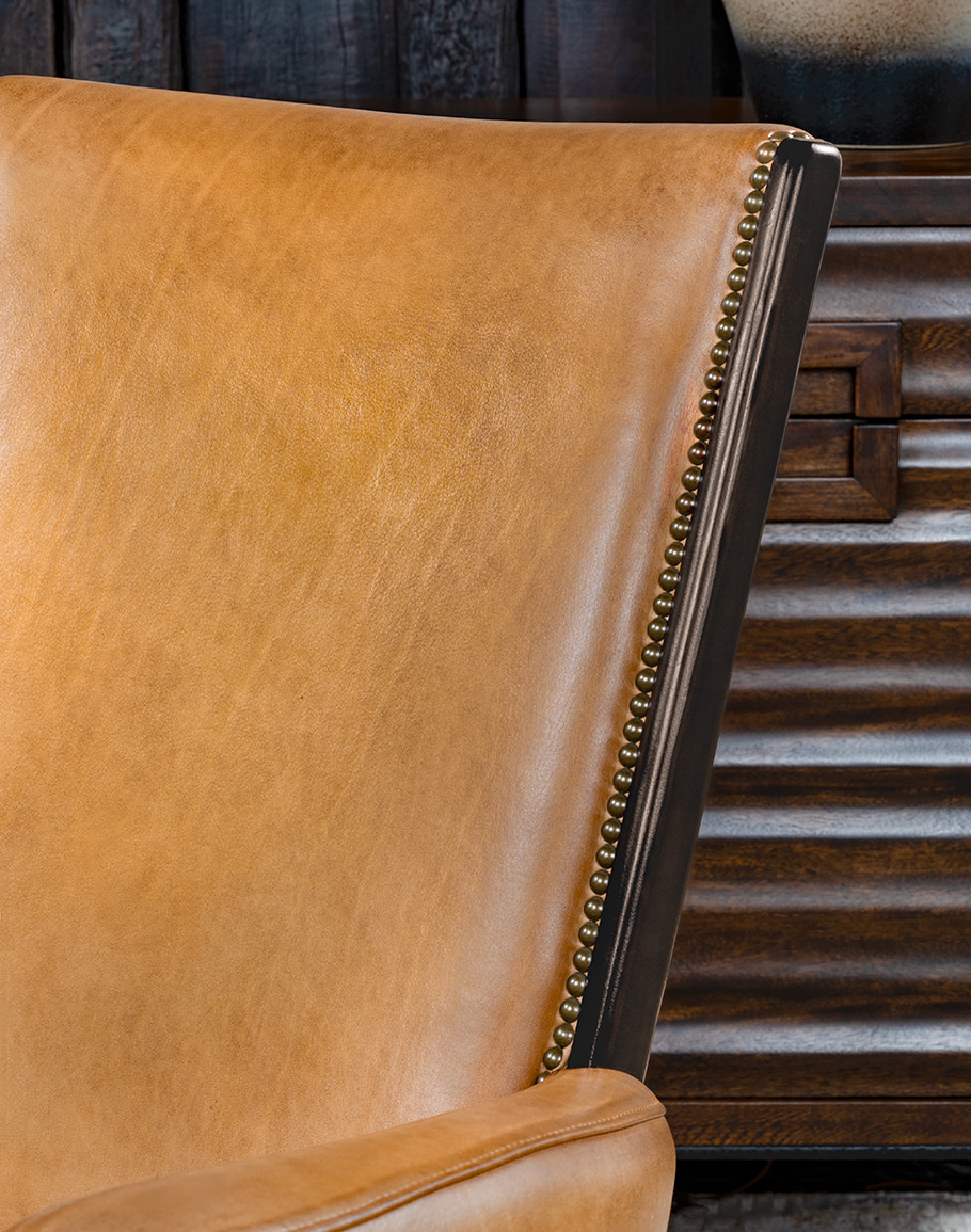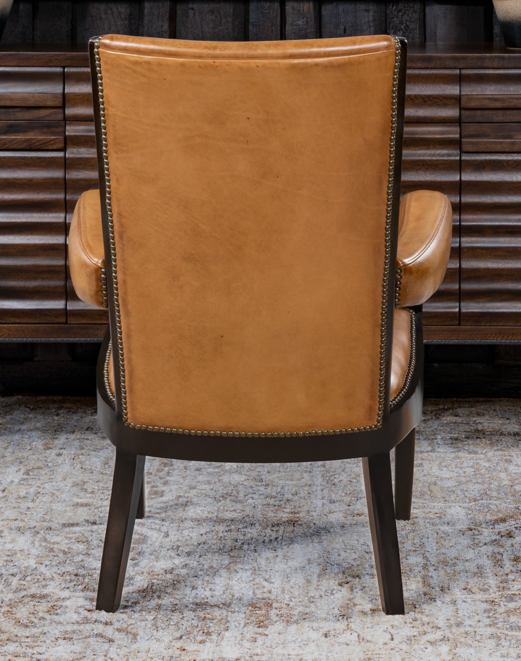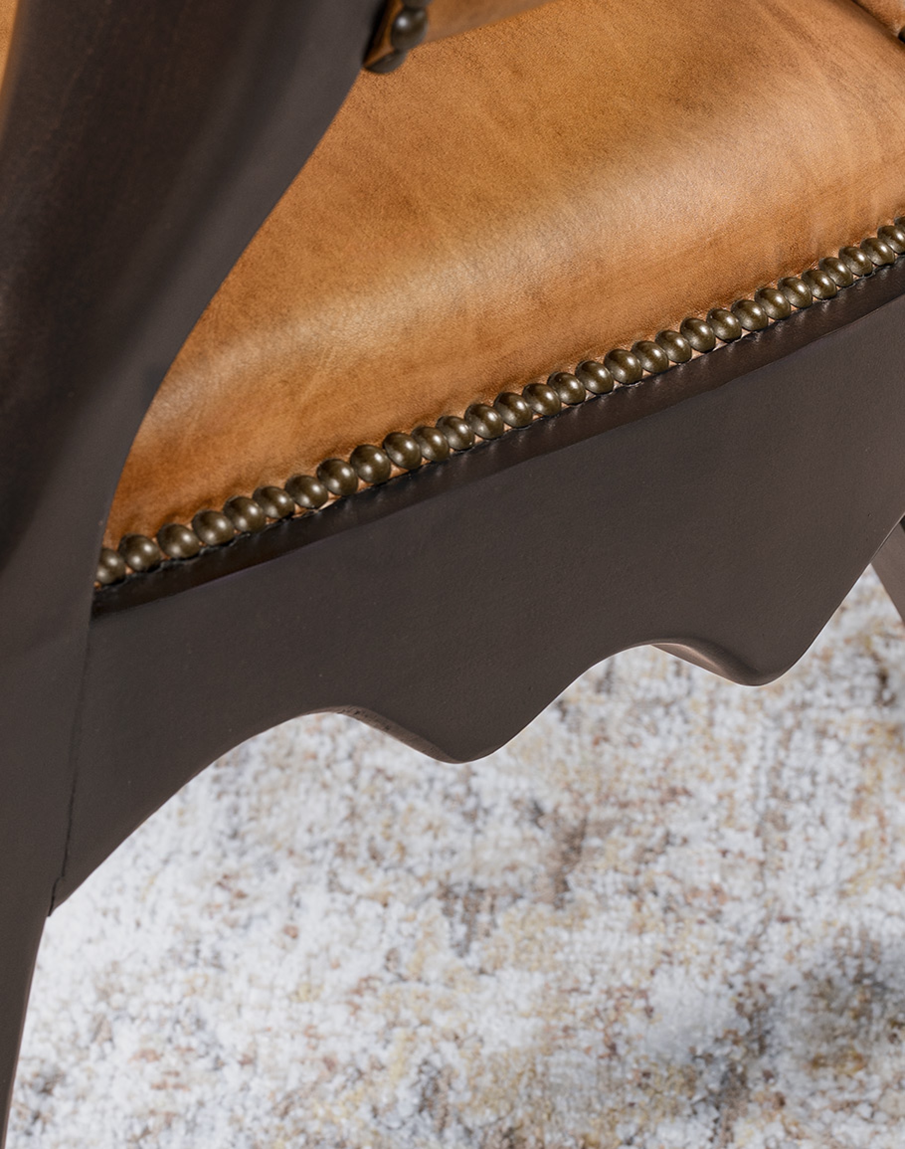 The Boland Leather Chair is a masterclass in refined Western design and heirloom craftsmanship. The Boland showcases a sophisticated silhouette with sculpted hardwood arms and legs in a rich Espresso Brown finish. The frame is paired with full-grain saddle leather upholstery in a Palomino Tan color, offering a smooth, supple surface with natural depth and character. Antique brass nailhead trim outlines the profile, adding definition and timeless detailing.