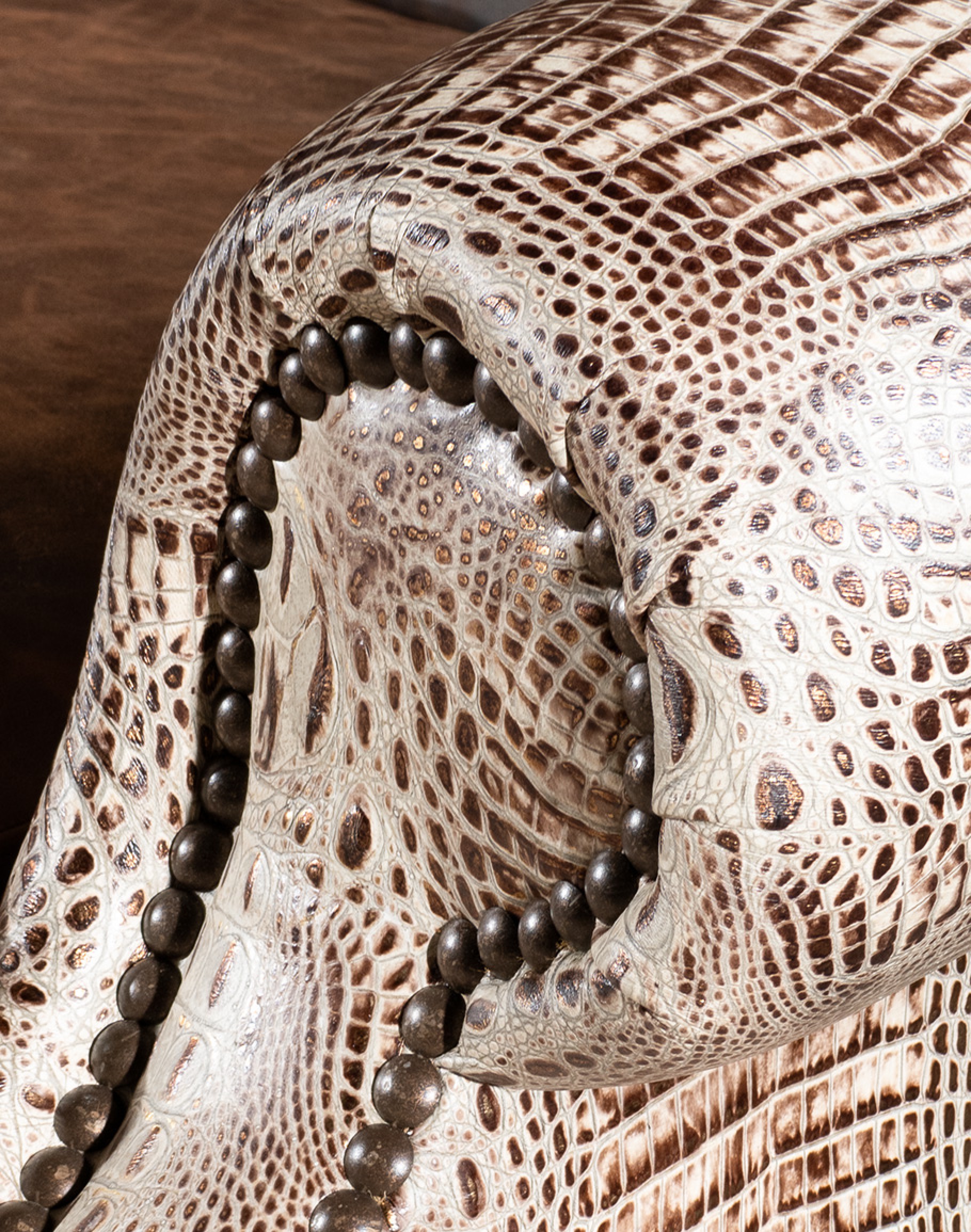 Embossed Leather Description: A leather used to accent many of today's home interiors. The leather hide is first embossed with a large crocodile grain and then colored by applying two base color coats of micro pigments. The leather is then wiped-off to give it a contrast of colors utilizing the base color combination. This color contrast is further accented by two additional top coat colors that are wiped-on by hand to give the leather a beautiful antique look. The last step is to slightly protect the hand work of the leather hide with a lacquer topcoat that provides great depth and warmth to the finished product.