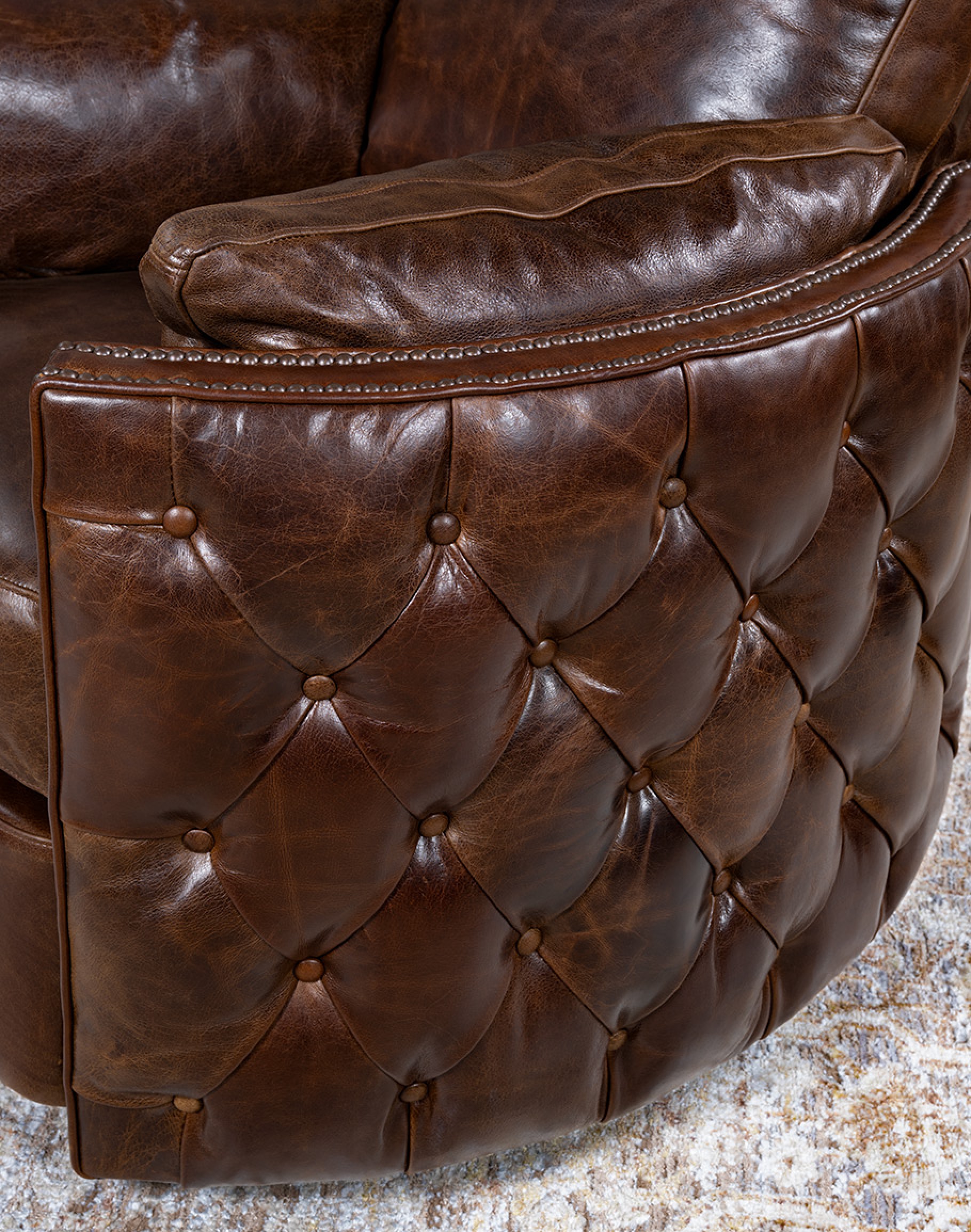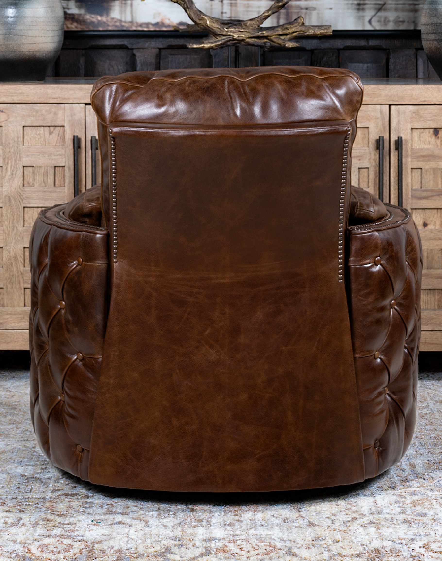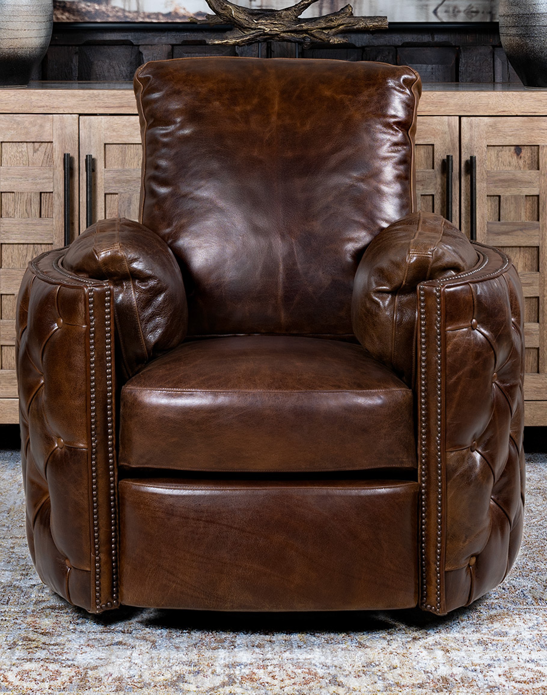 Its barrel-back silhouette is enhanced with diamond-tufted detailing along the sides, creating a tailored look that balances Western ruggedness with refined elegance. A nailhead trim border runs the length of the arms, highlighting its sculpted curvature and adding artisanal character. Plush pillow-top arms and a generously cushioned backrest provide uncompromising comfort, while the 360-degree swivel and smooth recline mechanism make this piece as functional as it is luxurious.