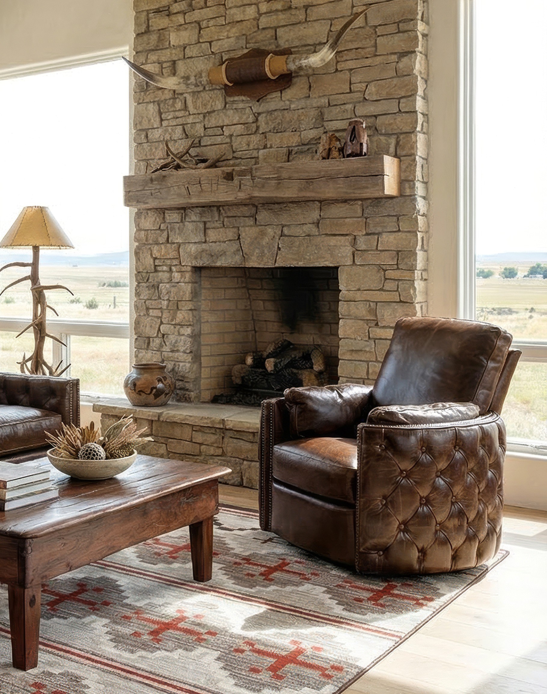 Perfectly suited for Adobe Interiors’ Classic Ranch and Mountain Ranch Collections, the Boulder Brown Leather Barrel Swivel Recliner is a versatile statement chair designed to complement Rustic ranch homes, Mountain lodges, or Refined Western interiors. A luxurious recliner with Western character and timeless appeal—the Boulder Brown Barrel Swivel Recliner elevates comfort. At Adobe Interiors, we craft the furniture, and you create the memories.