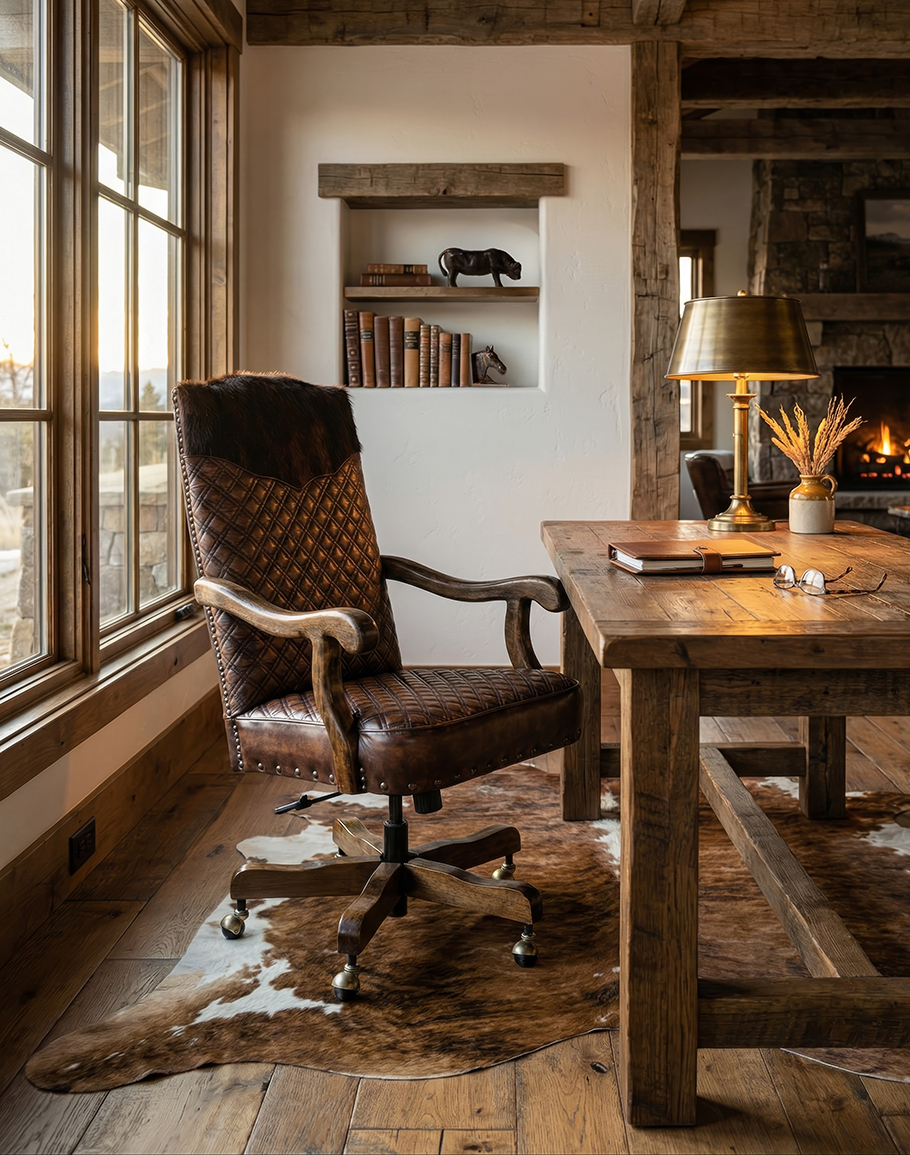 Our Bowie Diamondback Leather Desk Chair is upholstered in a hand antiqued brown leather a brindle hair on hide yoke. It’s a stand alone piece that begs attention from anyone who enters the room. This executive desk chair hearkens back to the stylish timelessness of decades past, while at the same time having a refreshingly modern spin. Its sturdy hardwood frame and eye catching leather hand-stitched and handmade with attention to detail are what set this piece apart and make it the perfect pick for your home office or hearth.