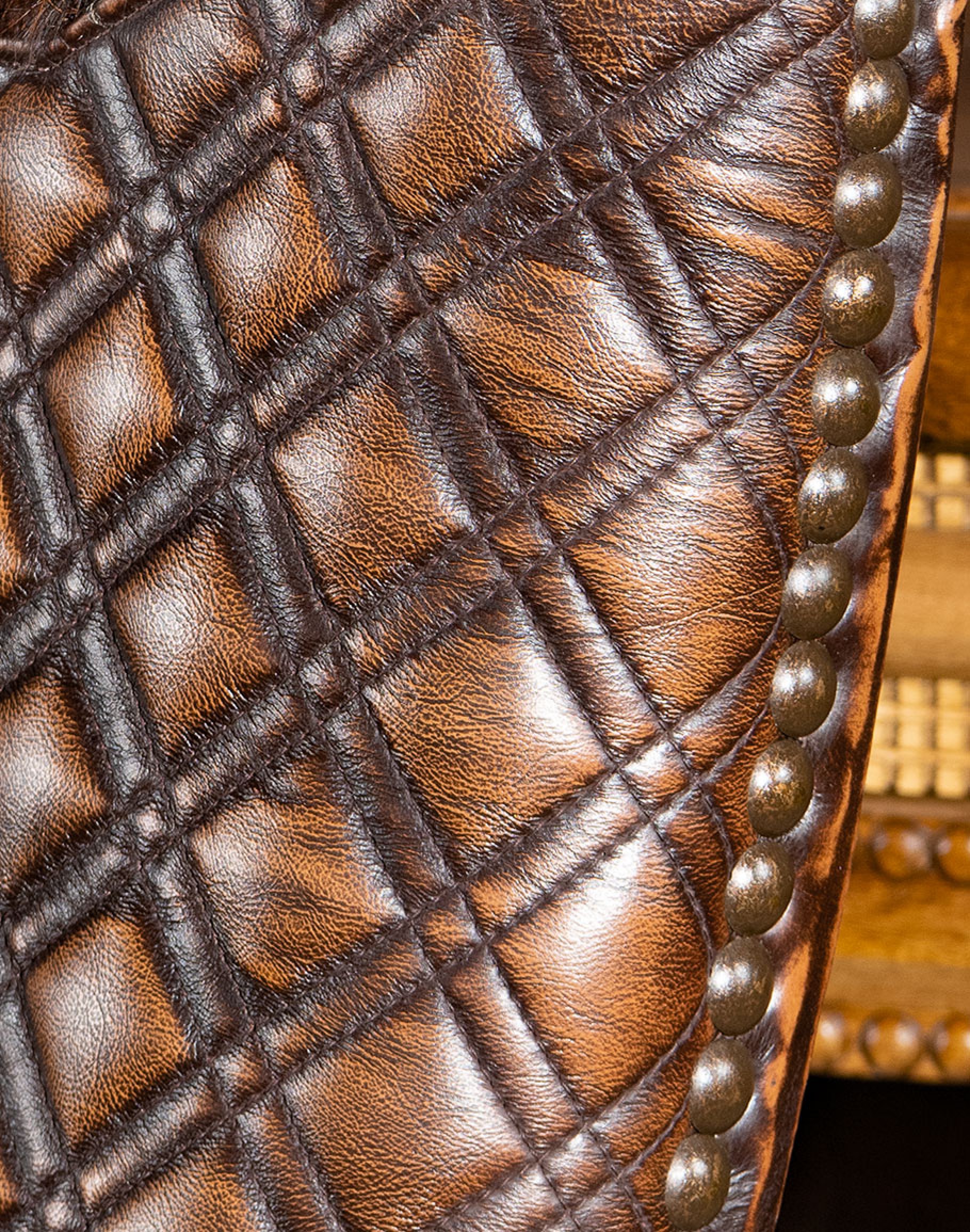 Our Bowie Diamondback Leather Desk Chair is upholstered in a hand antiqued brown leather a brindle hair on hide yoke. It’s a stand alone piece that begs attention from anyone who enters the room. This executive desk chair hearkens back to the stylish timelessness of decades past, while at the same time having a refreshingly modern spin. Its sturdy hardwood frame and eye catching leather hand-stitched and handmade with attention to detail are what set this piece apart and make it the perfect pick for your home office or hearth.