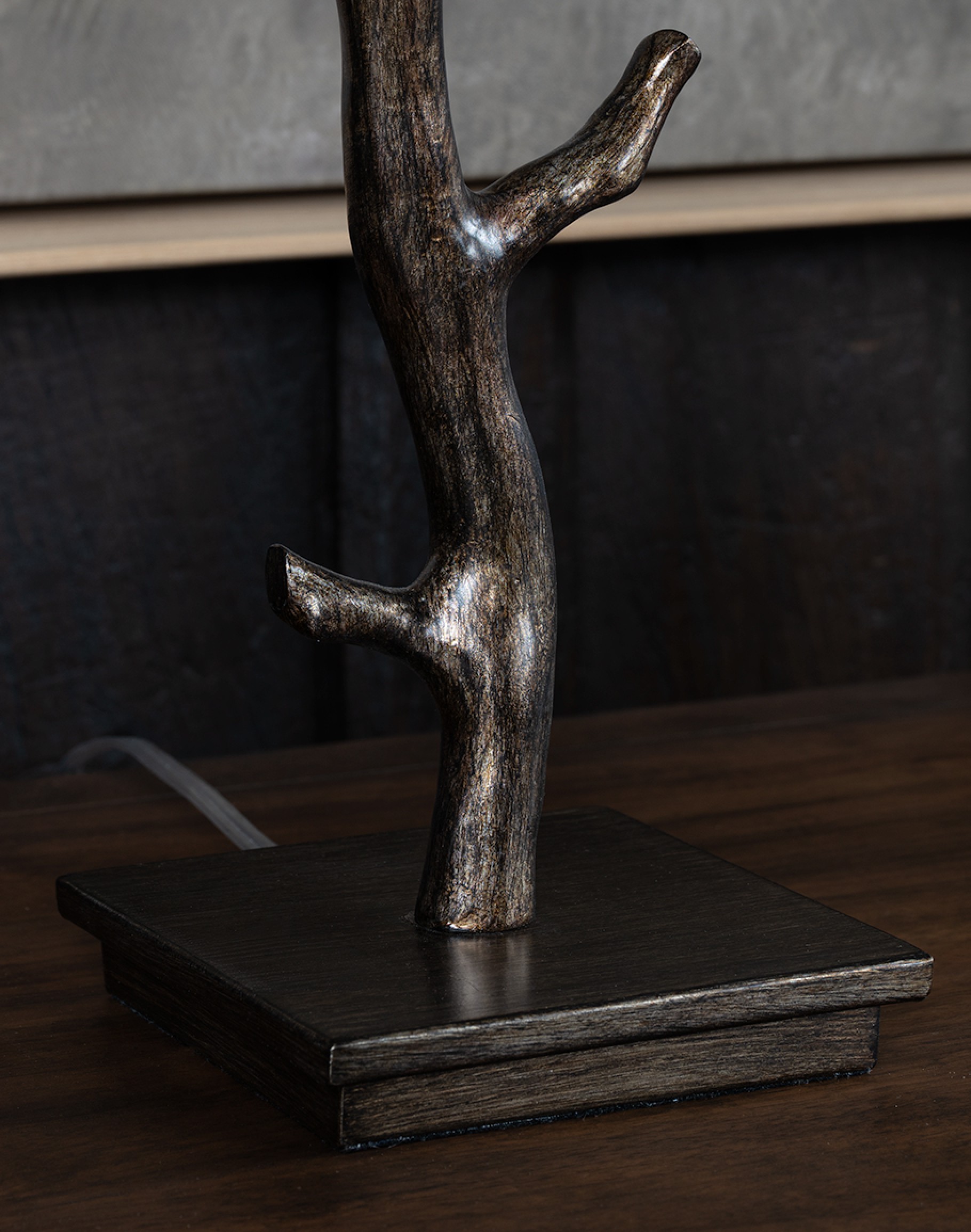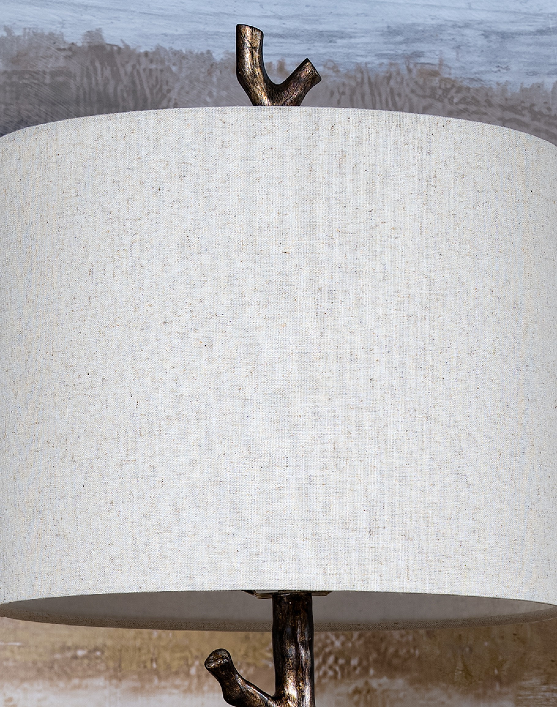 Resembling a tree branch, this rustic table lamp is finished in a dark bronze with gold undertones. The oatmeal linen shade has natural light slubbing.