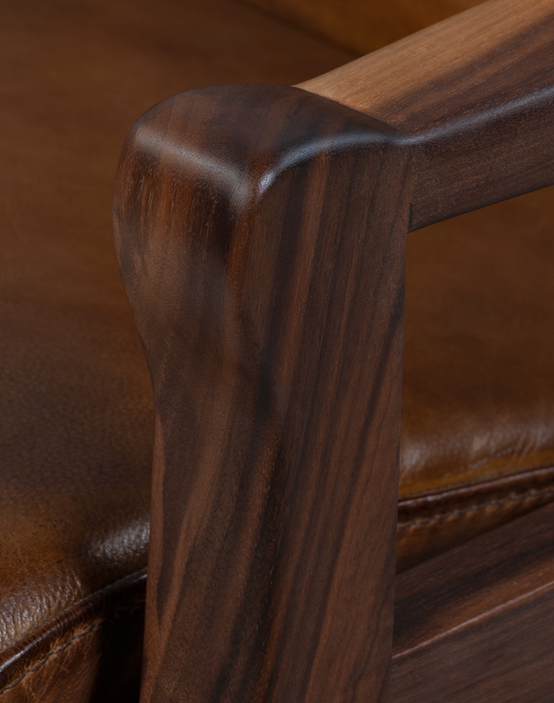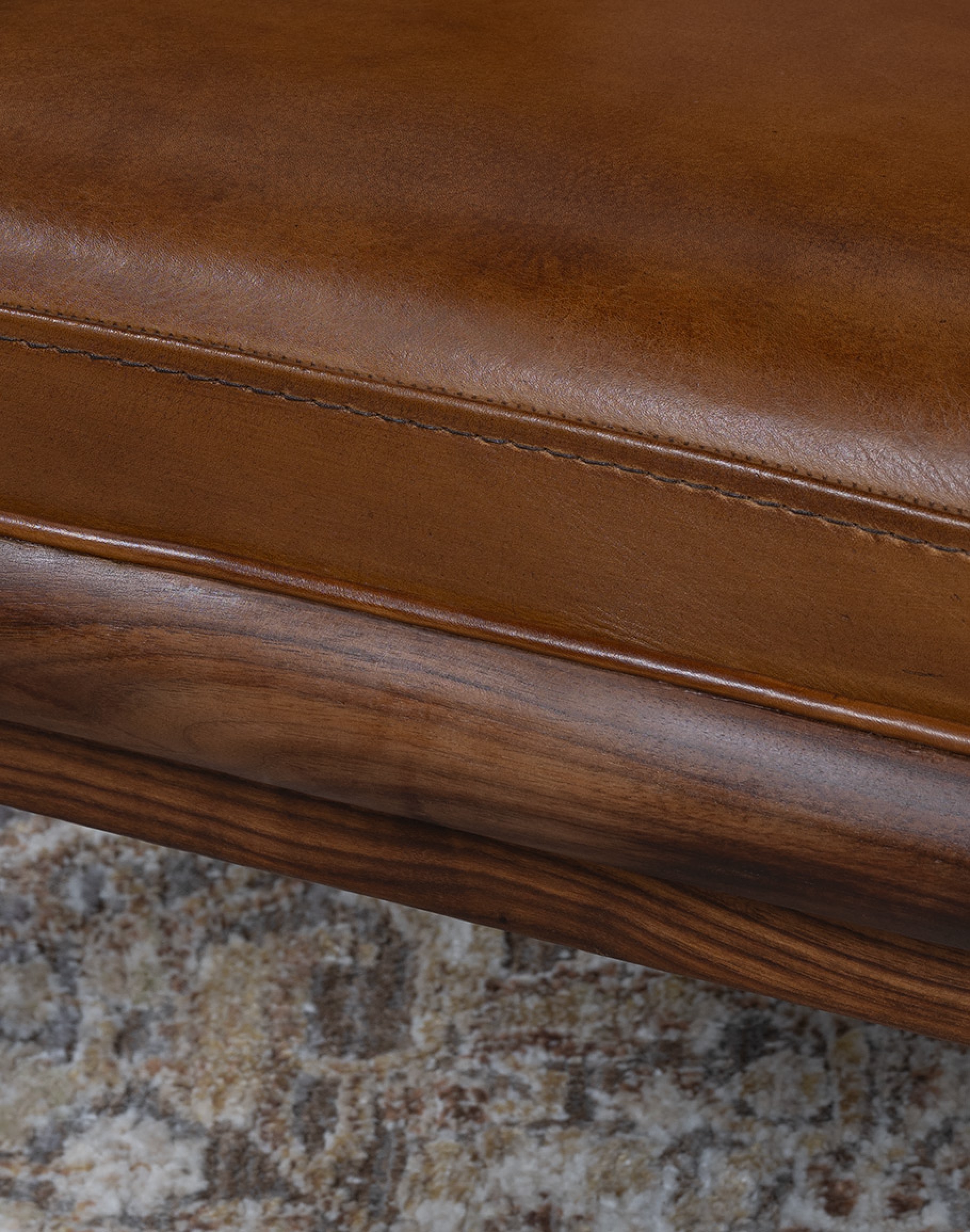 Leather Description: This is a full grain aniline leather tanned in a historic leather producing region of Italy using English hides. The century old tannery prepares this leather article by applying a hot wax, then turning the hides in old wooden tanning drums overnight to soften the natural fibers and impart it with a remarkable suppleness. The leather is then upholstered in its "crust form" on the furniture in North Carolina, After the furniture is made our leather artisans apply a multi step hand rubbed Patina using the same waxes and pigments used in Italy. Performing this process on the actual finished piece allows our artisans to develop a unique Patina, composition, and overall essence that creates a piece of furniture that has uniqueness, character and style that matches the individual who's selecting it. This leather imparts the feeling of a softer, well broken in leather one might find on a decades old chair discovered in a French country estate or the Parisian flea market. The leather is brand new from our Artisans hands... without the aging issues that sometimes come from the hands of time. Truly a unique, hand-made article in an era when only companies committed to the highest standards lavish this sort of attention and time to unique American made furniture.