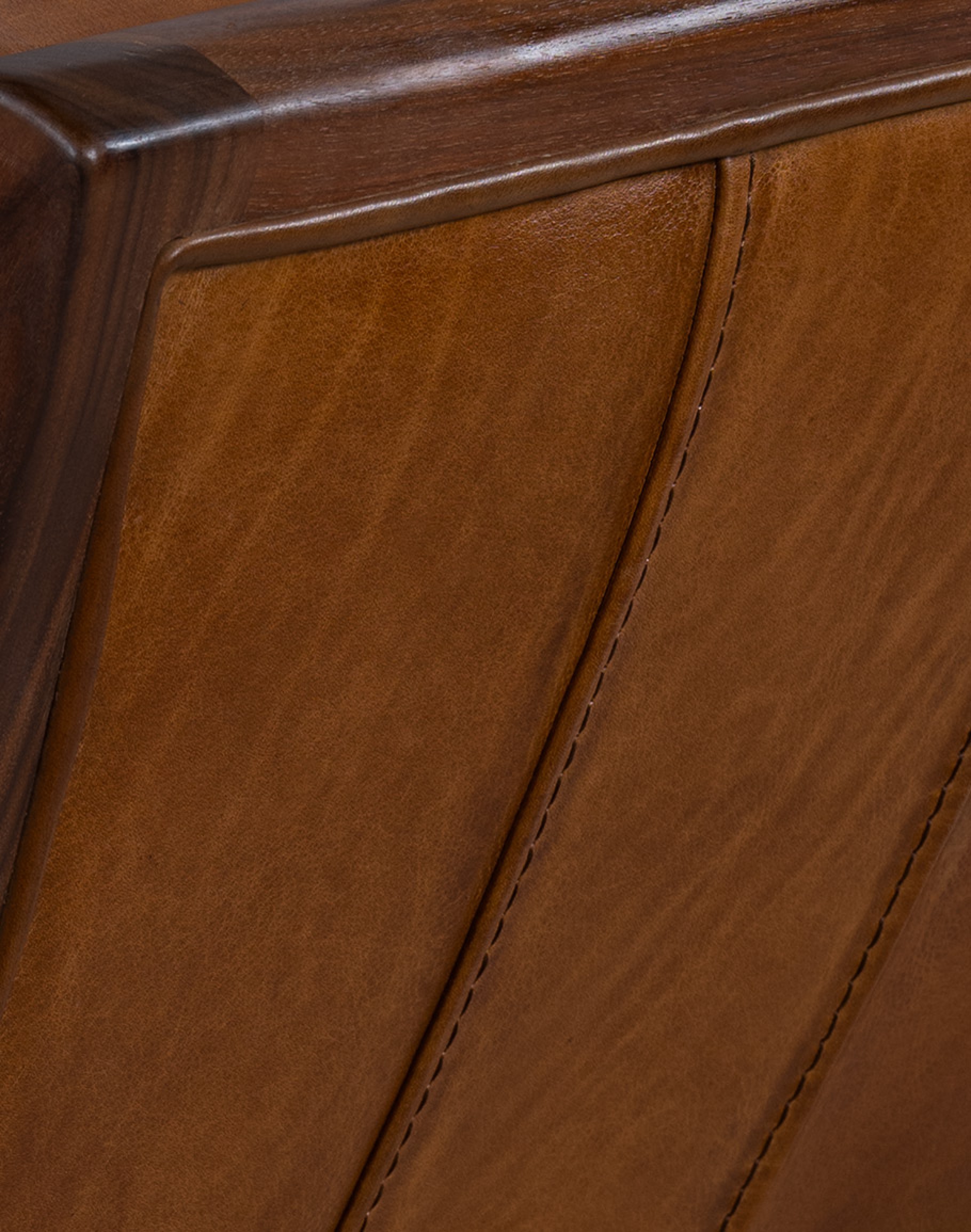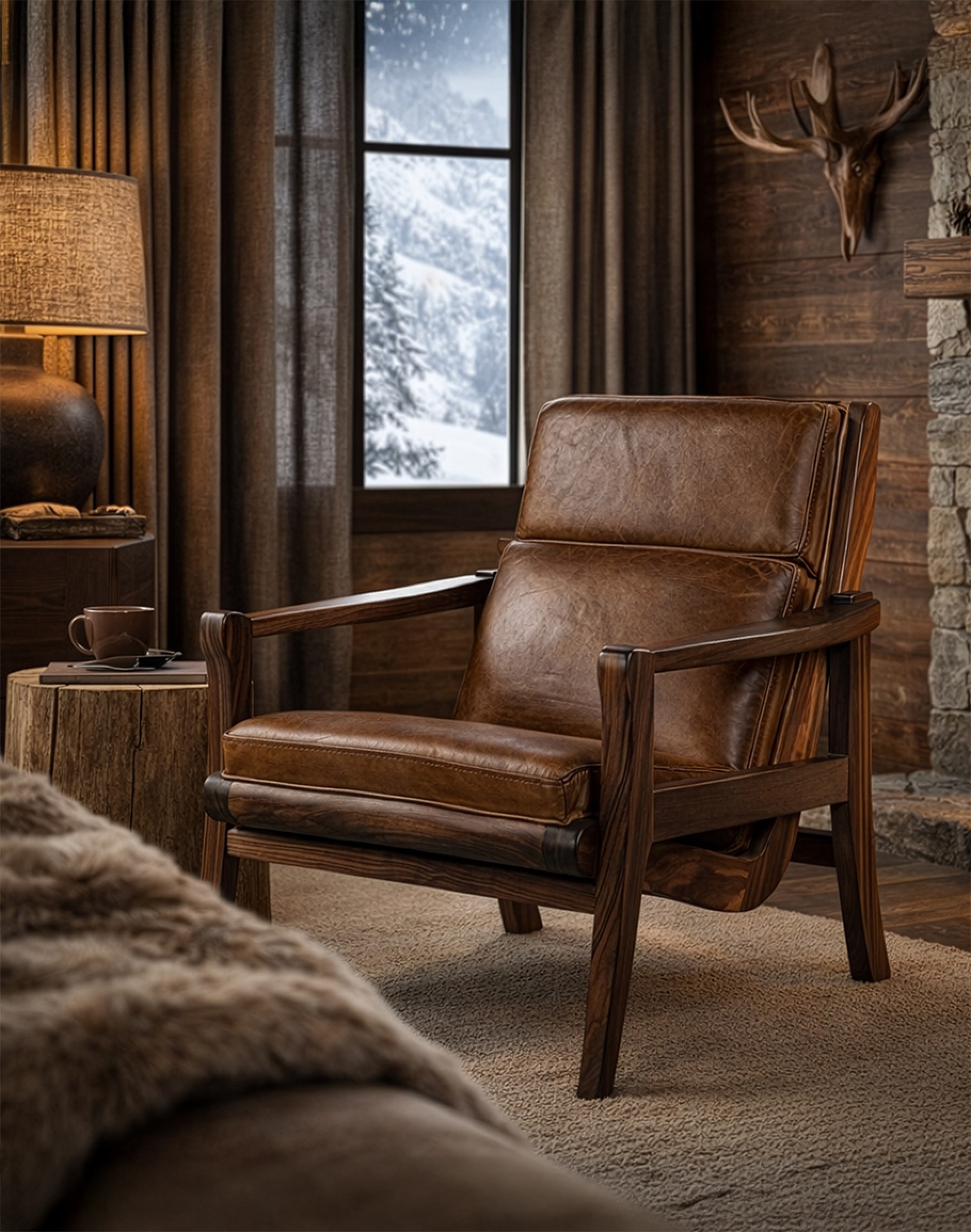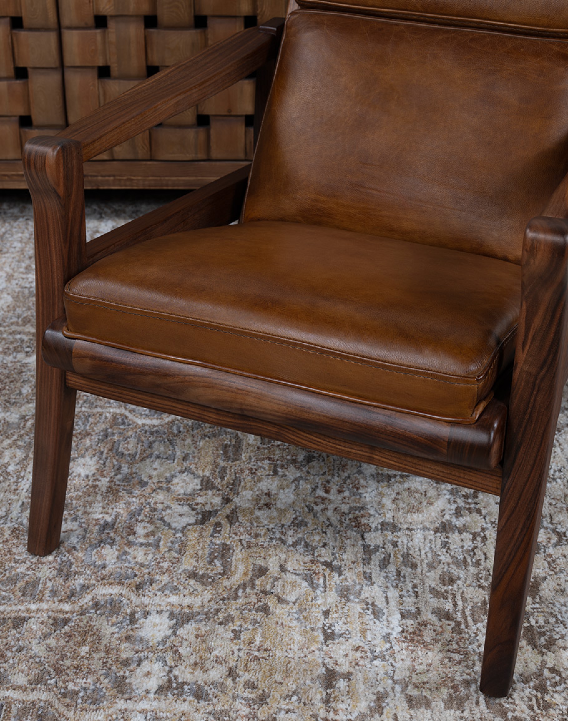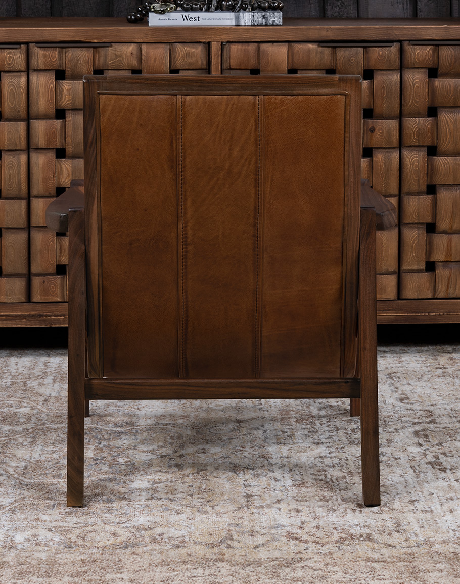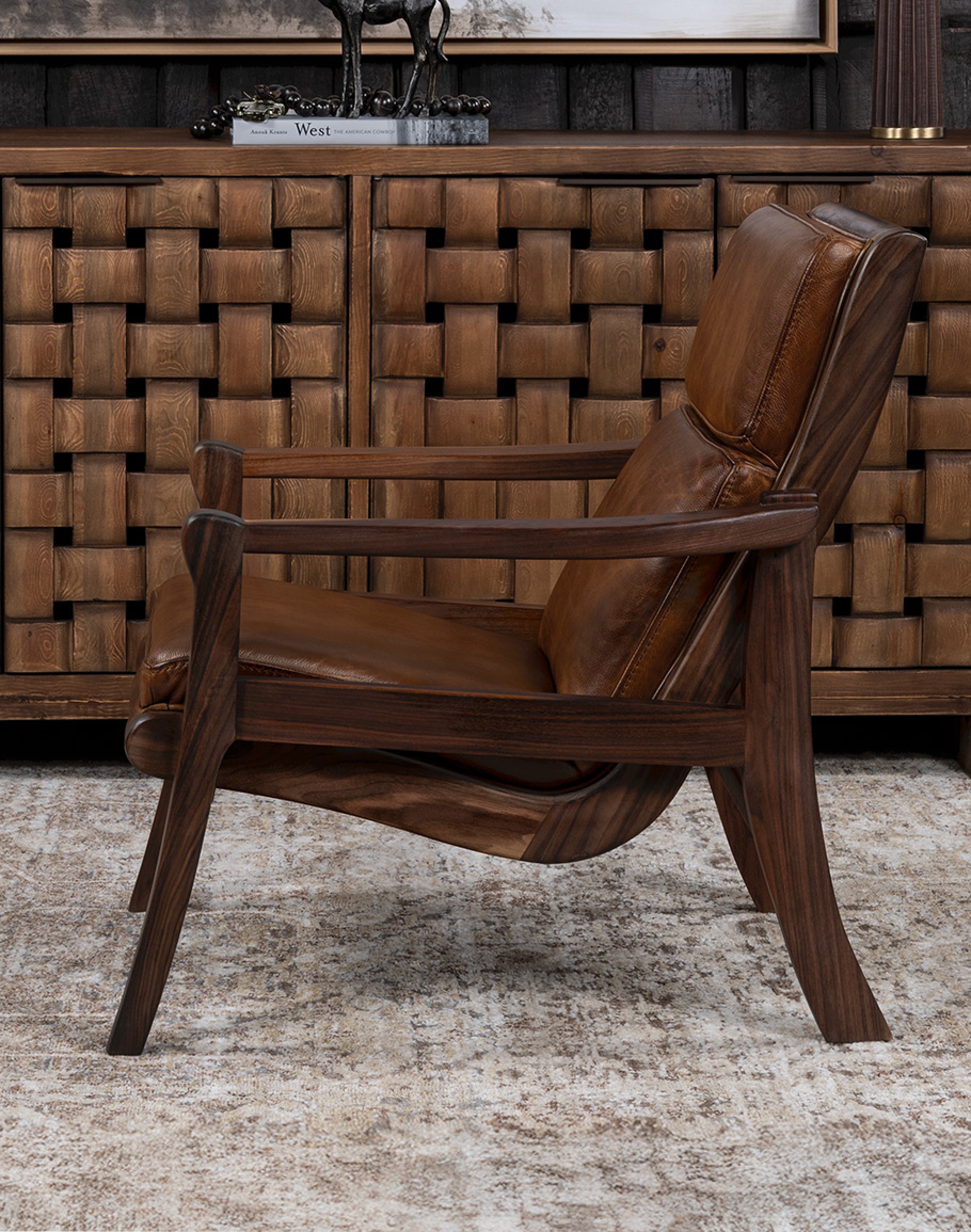 The Breckenridge Saddle Leather Chair is a statement-making American-made leather accent chair with a clean, architectural profile and the relaxed comfort of a true lounge seat. Built 100% in the USA to the highest standards of quality and craftsmanship, it’s the kind of heirloom piece designers use to anchor a reading corner, office, or living room vignette with warm, timeless materiality. In a rich whiskey saddle brown leather the Breckenridge delivers that classic, lived-in character from day one—only improving as it develops a soft patina. The silhouette is tailored and modern: a two-section back with an integrated headrest feel, boxed seat and back cushions, and clean seam detailing that keeps the look crisp and elevated. The exposed frame is finished in a dark walnut brown wood tone, showcasing an open, sculptural structure with gently angled legs and refined arm lines. The contrast between the deep wood and the saddle leather gives this chair a warm, tonal layering that reads sophisticated in both ranch and contemporary interiors. At Adobe Interiors, we create the furniture, and you create the memories.