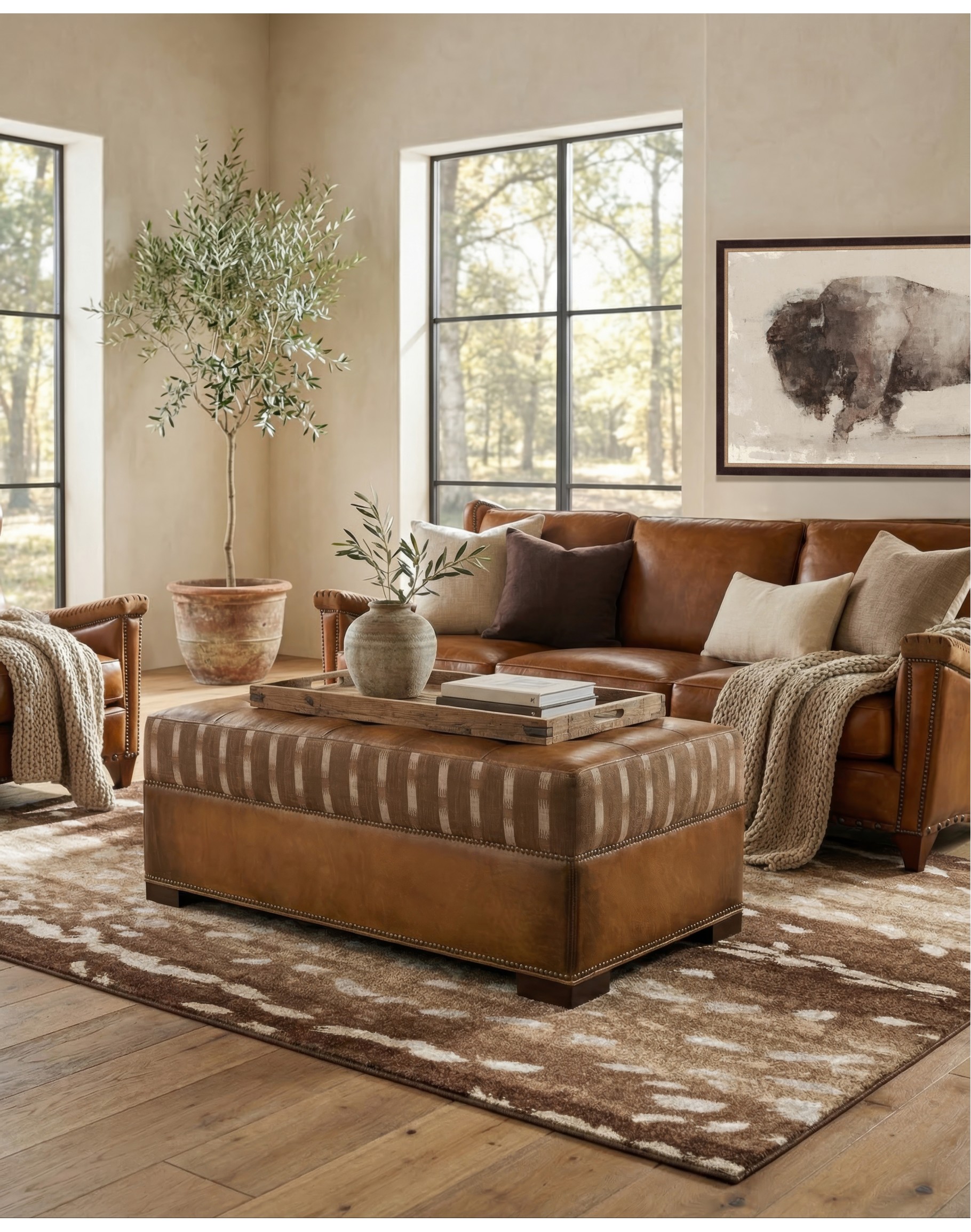 Shop Our Brixton Saddle Ottoman in Saddle Tan, crafted with Full Grain Leather and featuring Solid Wood Frame for Top Quality. A perfect addition to any Western space, brought to you by Adobe Interiors.
