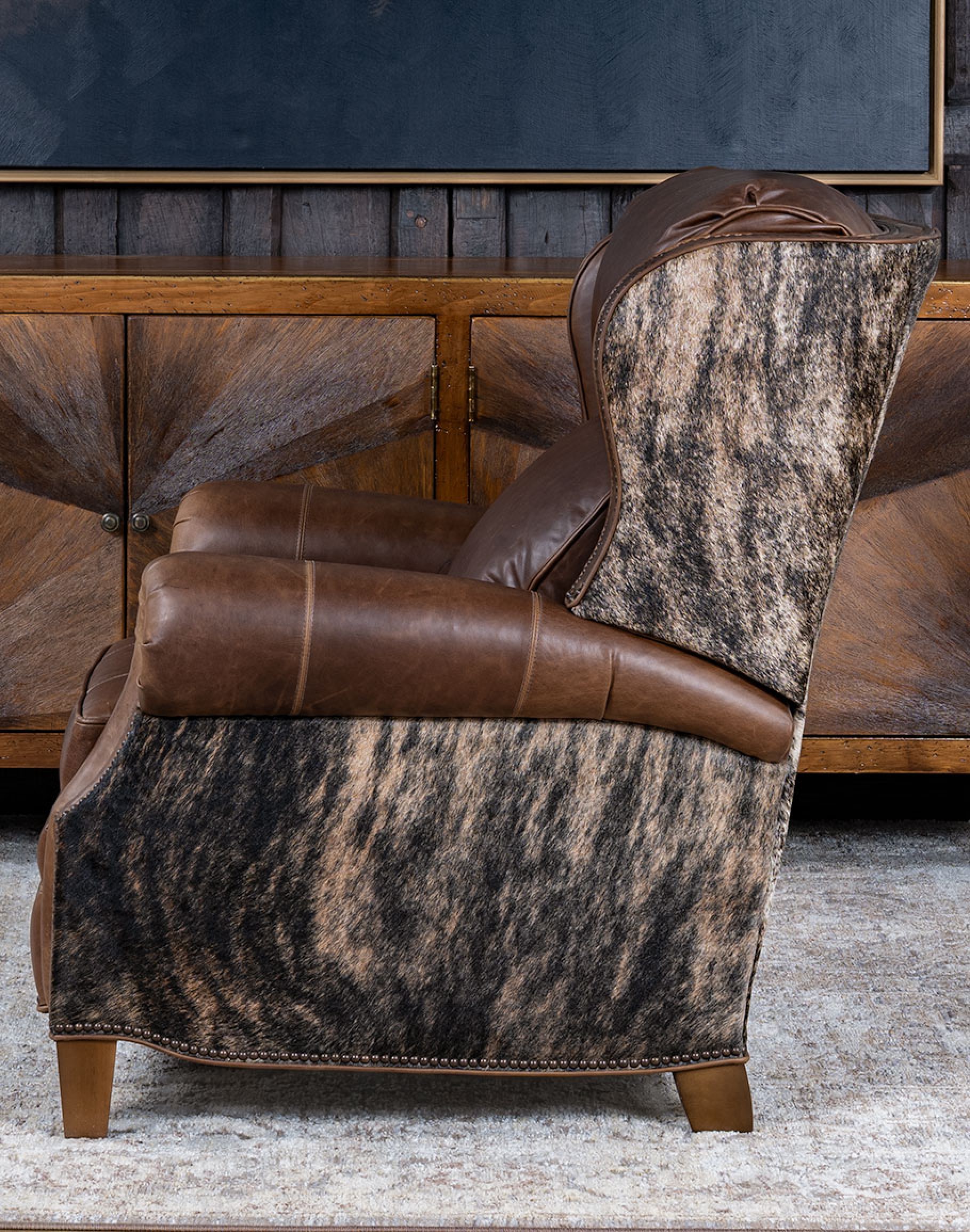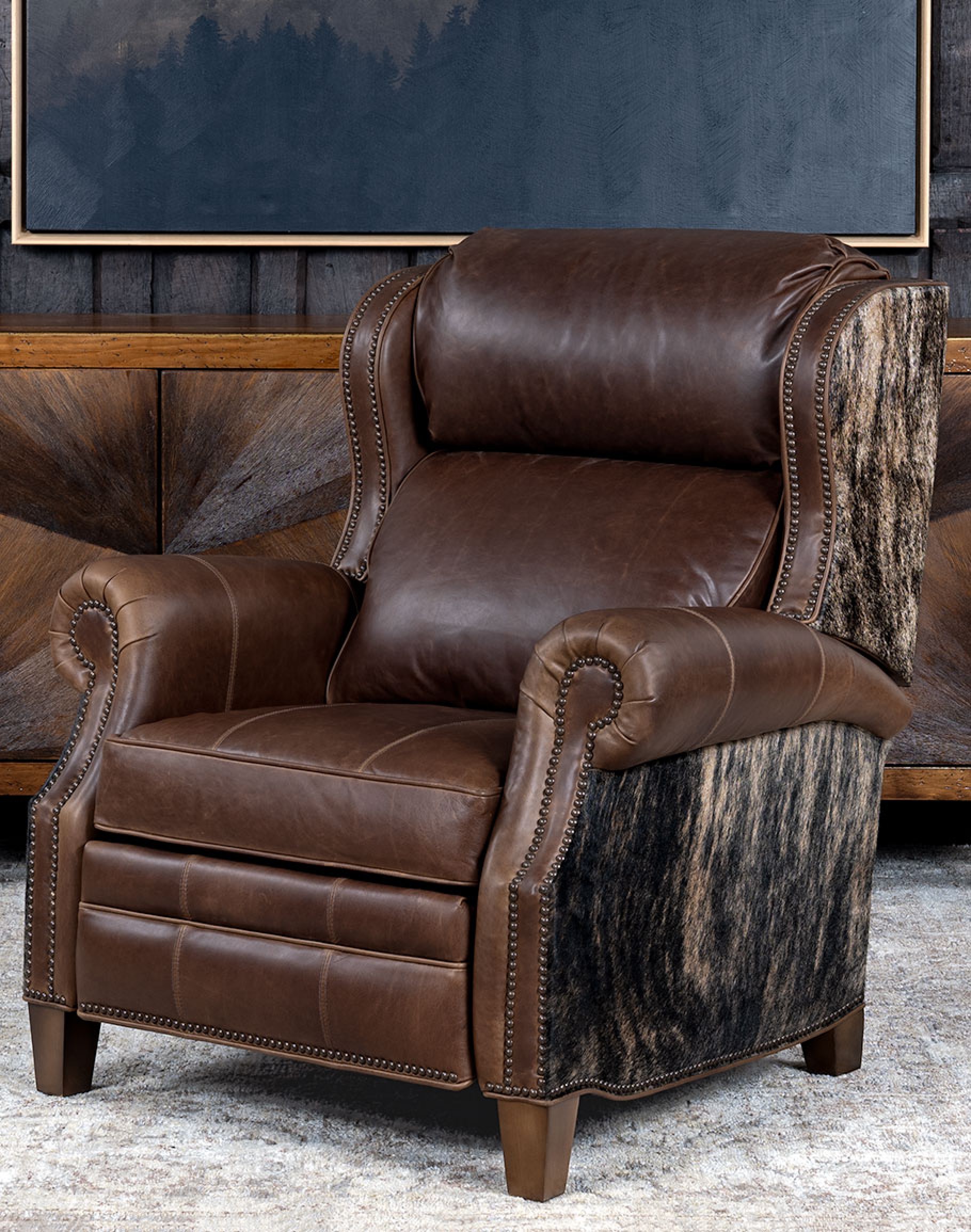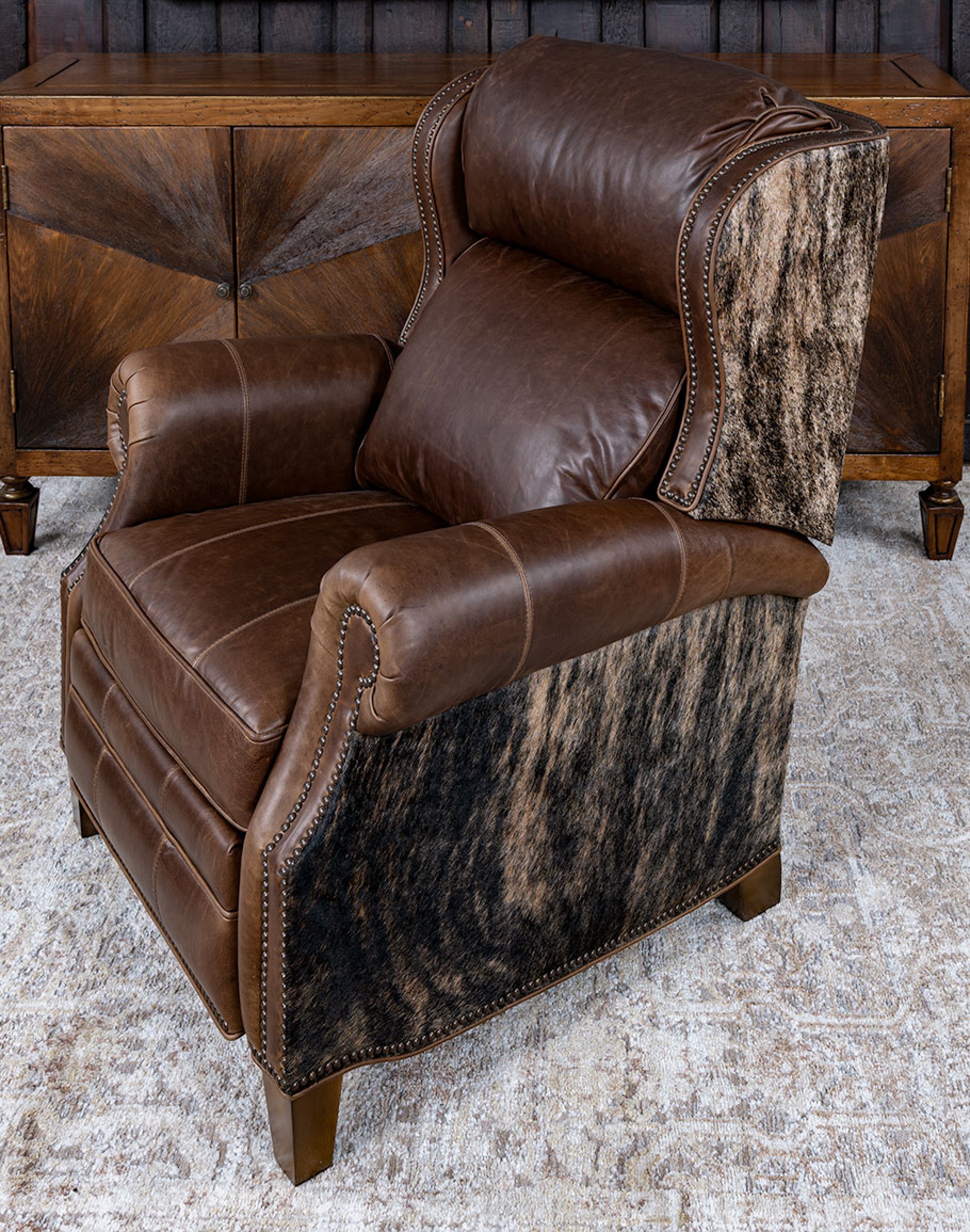 Experience luxury and comfort like never before with the classic ranch Bronco Brindleback Recliner. Proudly made in America to the highest standards of quality and craftsmanship, this recliner exudes timeless elegance and offers exceptional support with its grandly scaled bustle-back design. Featuring a wingback-style frame, the Bronco Brindleback Recliner is a perfect blend of classic and Western aesthetics. Its supple top-grain light brown leather, enhanced by an oil-infused finish, adds a touch of sophistication to any space. Upholstery-grade brindle cowhide beautifully wraps along the sides and outback, bringing an authentic Western charm to your home. Indulge in the sumptuous comfort of this recliner's plush seat cushion, accentuated by leather welting and outer accents. Meticulous attention to detail is evident in the gold-colored nail tacks that add a refined touch to the overall design. Discover the perfect blend of luxury and relaxation in this remarkable Bronco Brindleback recliner. At Adobe Interiors, we create the furniture, and you create the memories.