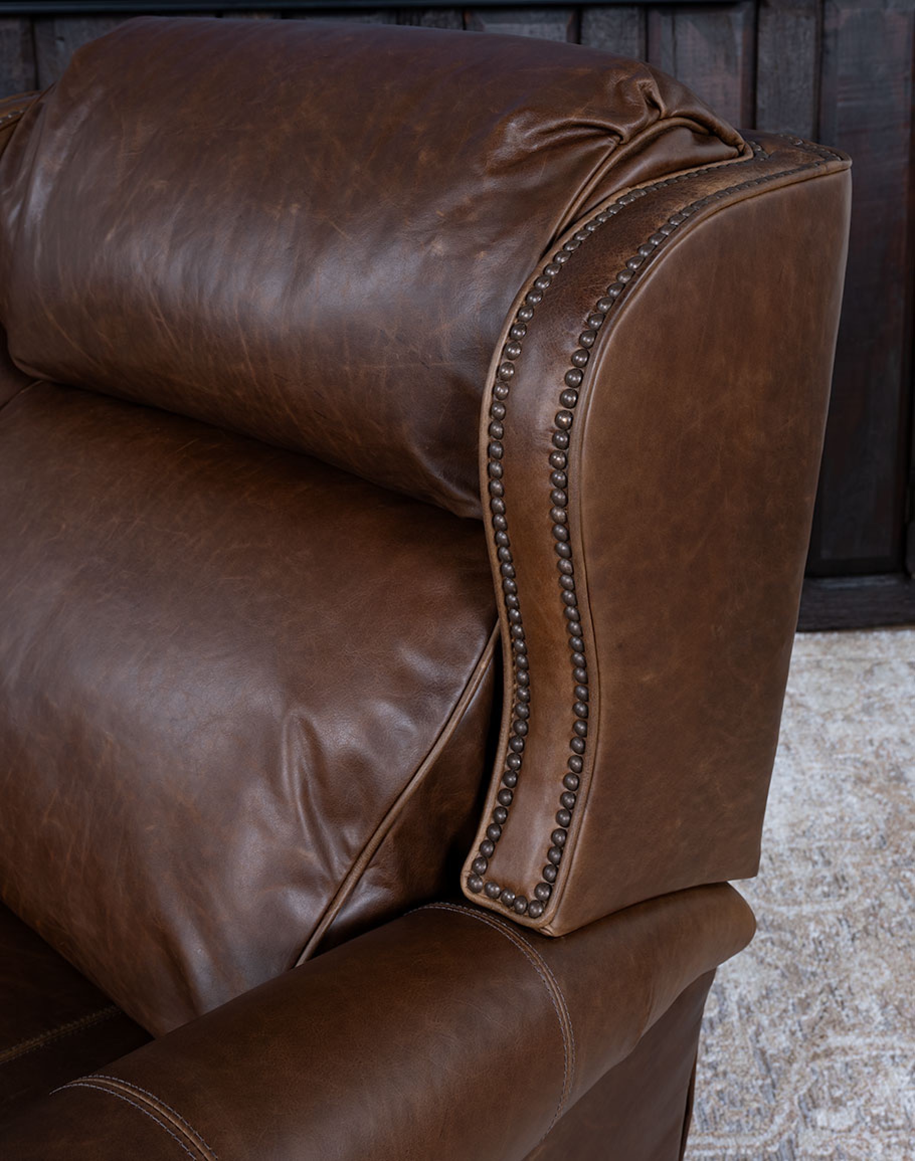 Experience luxury and comfort like never before with the classic ranch Bronco Brown Leather Recliner. Proudly made in America to the highest standards of quality and craftsmanship, this recliner exudes timeless elegance and offers exceptional support with its grandly scaled bustle-back design. Featuring a wingback-style frame, the Bronco Brown Leather Recliner is a perfect blend of classic and Western aesthetics. Its supple full grain warm brown leather, enhanced by an oil-infused finish, adds a touch of sophistication to any space. Indulge in the sumptuous comfort of this leather recliner's plush seat cushion, accentuated by leather welting. Meticulous attention to detail is evident in the brass colored nail tacks that add a refined touch to the overall design. Discover the perfect blend of luxury and relaxation in this remarkable Bronco Brown Full Grain Leather Recliner. At Adobe Interiors, we create the furniture, and you create the memories.