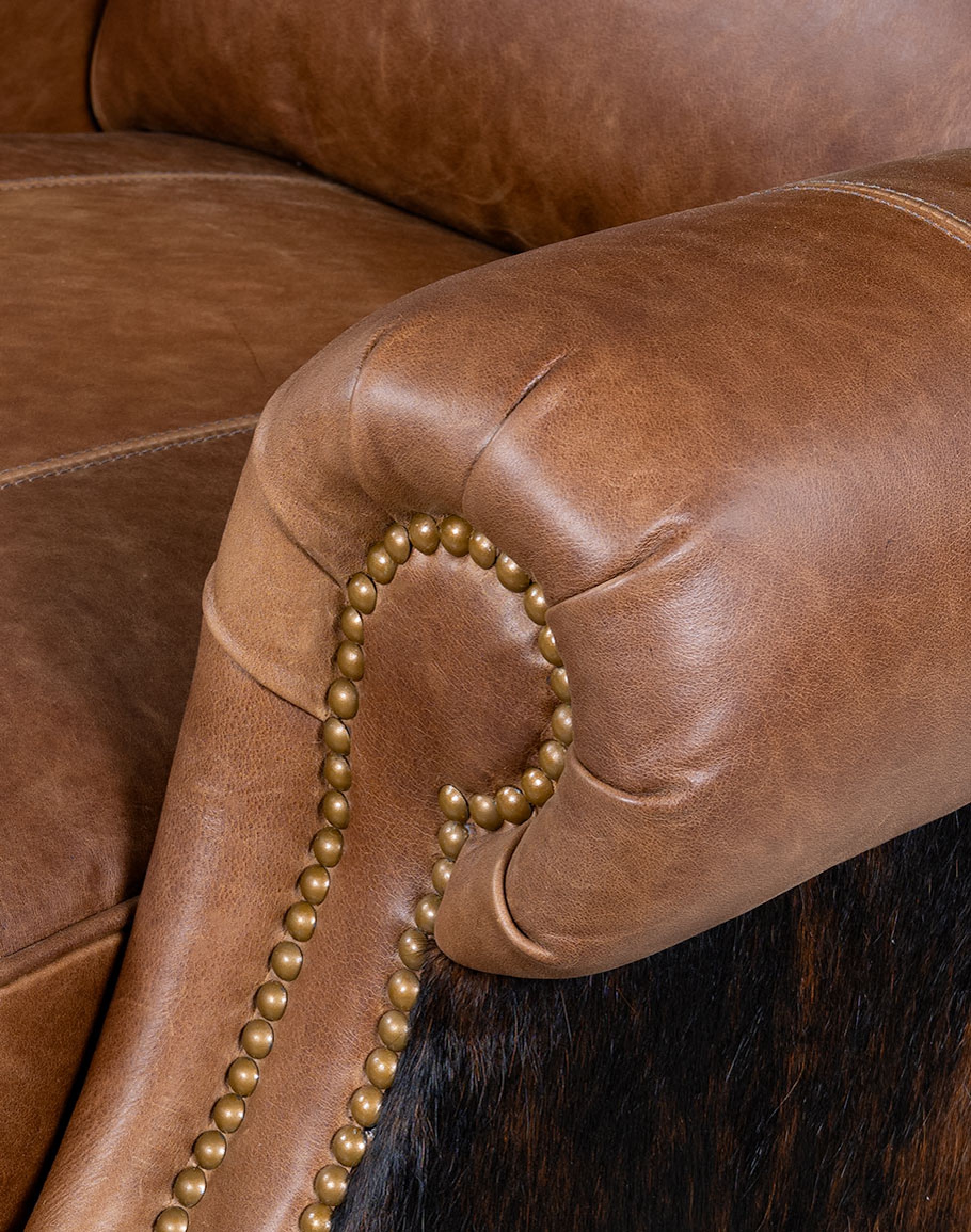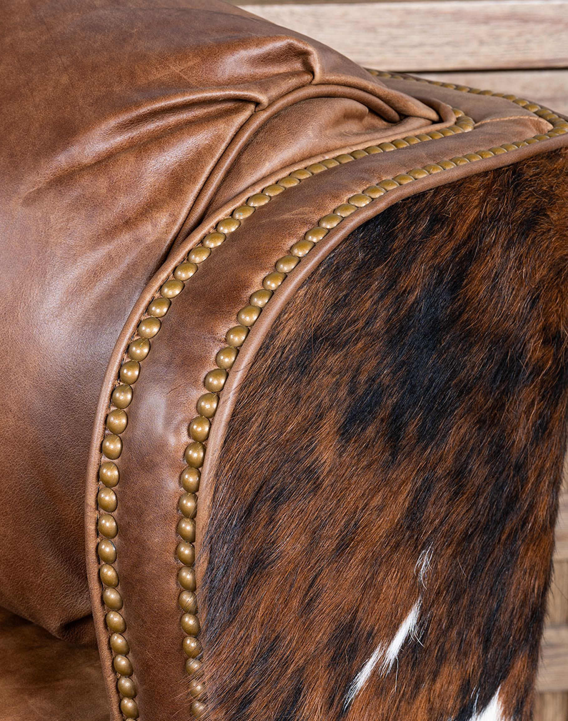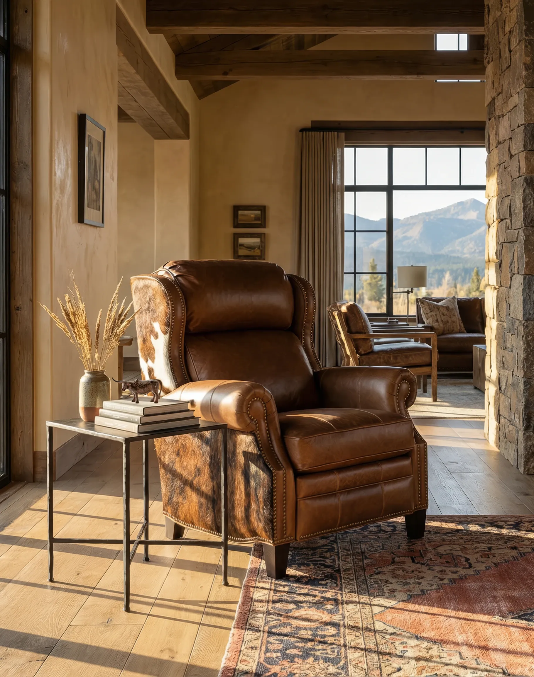 Experience luxury and comfort like never before with the classic ranch Bronco Cognac Leather Recliner. Proudly made in America to the highest standards of quality and craftsmanship, this recliner exudes timeless elegance and offers exceptional support with its grandly scaled bustle-back design. Featuring a wingback-style frame, the Bronco Cognac Leather Recliner is a perfect blend of classic and Western aesthetics. Its supple top-grain warm brown leather, enhanced by an oil-infused finish, adds a touch of sophistication to any space. Upholstery-grade brindle cowhide beautifully wraps along the sides and outback, bringing an authentic Western charm to your home. Indulge in the sumptuous comfort of this recliner's plush seat cushion, accentuated by leather welting and outer accents. Meticulous attention to detail is evident in the old gold-colored nail tacks that add a refined touch to the overall design. Discover the perfect blend of luxury and relaxation in this remarkable Bronco Cognac Leather recliner. At Adobe Interiors, we create the furniture, and you create the memories.