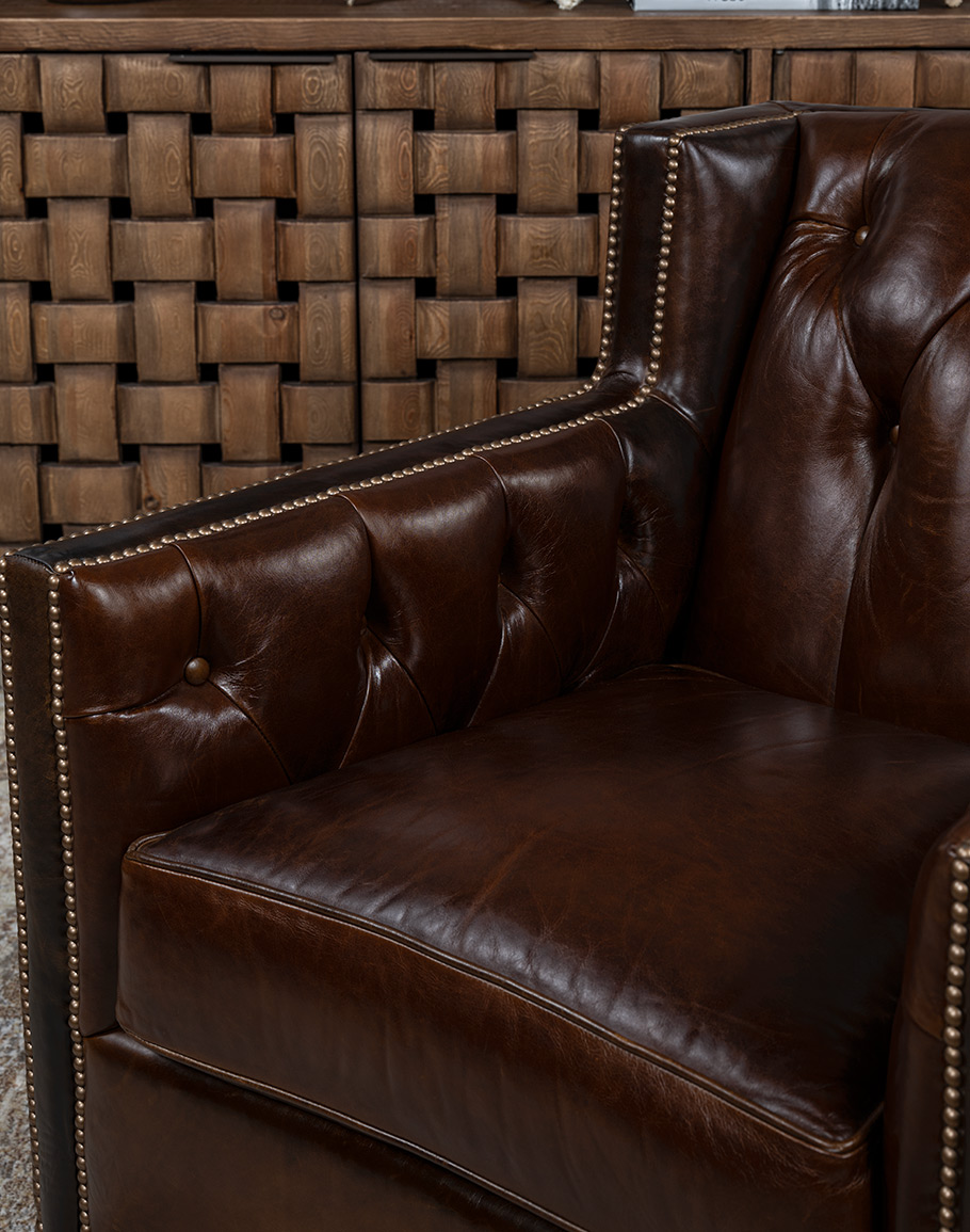 The Browning Bourbon Swivel Chair is a refined take on the classic club chair—tailored, architectural, and built to anchor a room with quiet confidence.Crafted 100% in America to the highest standards of quality and craftsmanship, the Browning Bourbon Swivel Chair is the kind of piece that looks custom, wears beautifully, and instantly upgrades the entire seating area—whether styled beside a sofa, paired in a matching set, or placed as a statement accent chair. Upholstered in a rich bourbon brown leather (a warm whiskey-toned brown with deep chocolate undertones), it delivers that elevated, heirloom look designers love for studies, living rooms, and sophisticated lounge spaces.