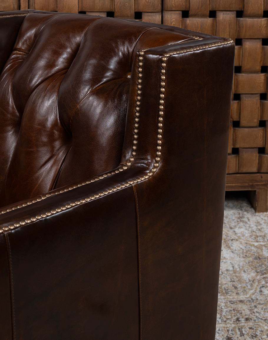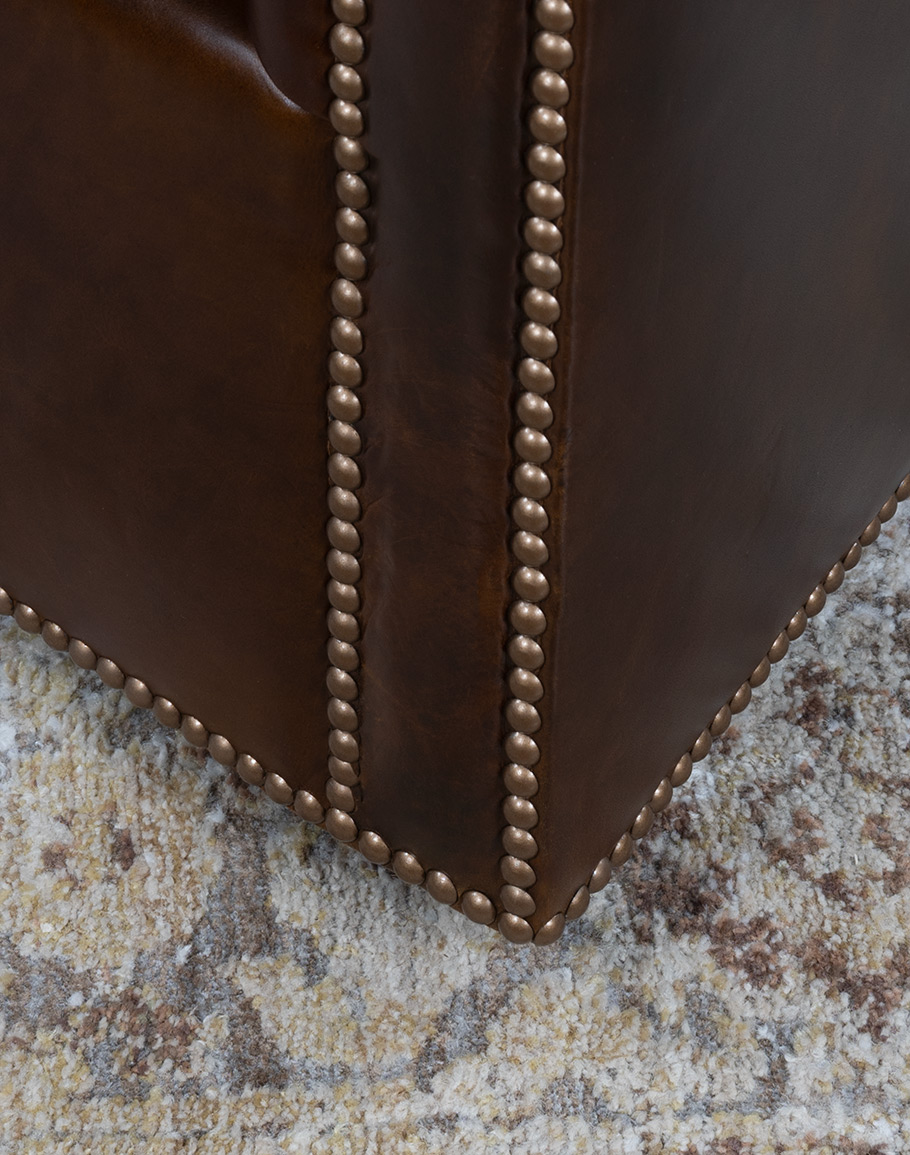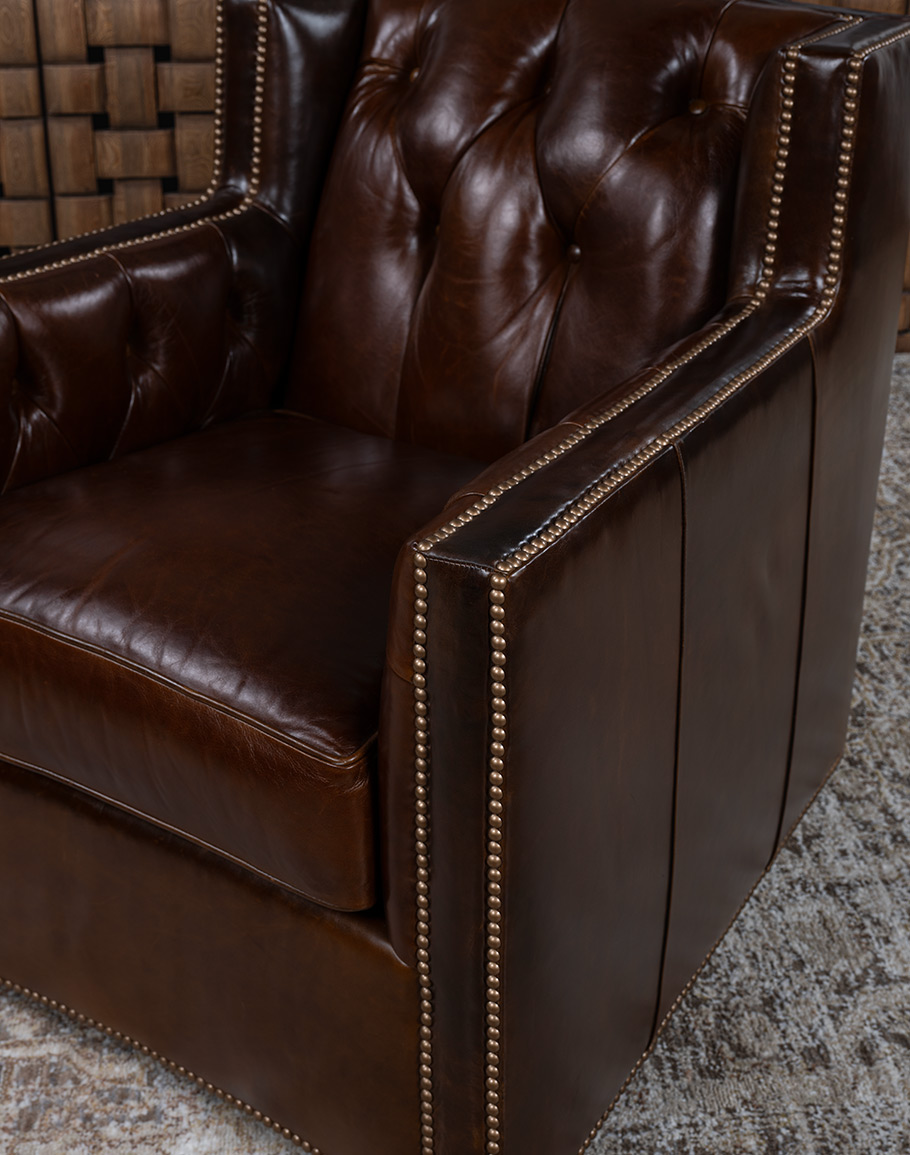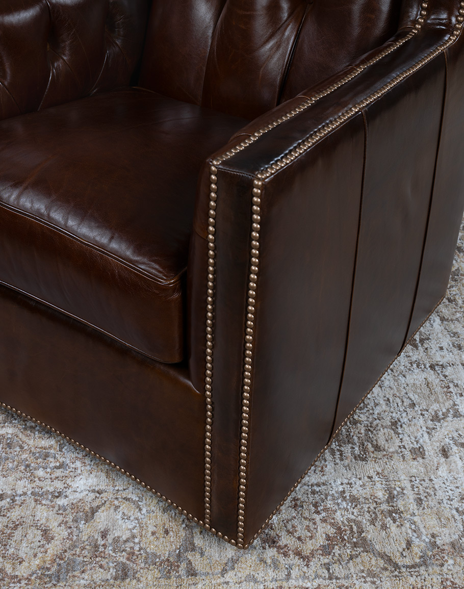 From a design standpoint, this chair reads modern-traditional: clean, squared-off track arms and a structured silhouette are softened by deep button tufting across the inside back and inner arms. A crisp box seat cushion gives it a polished, showroom-ready profile, while the swivel base adds effortless function—perfect for conversation seating without sacrificing the tailored aesthetic. Finished with antique brass nailhead trim that frames the arms and edges, the Browning feels intentionally detailed. At Adobe Interiors, we create the furniture, and you create the memories.