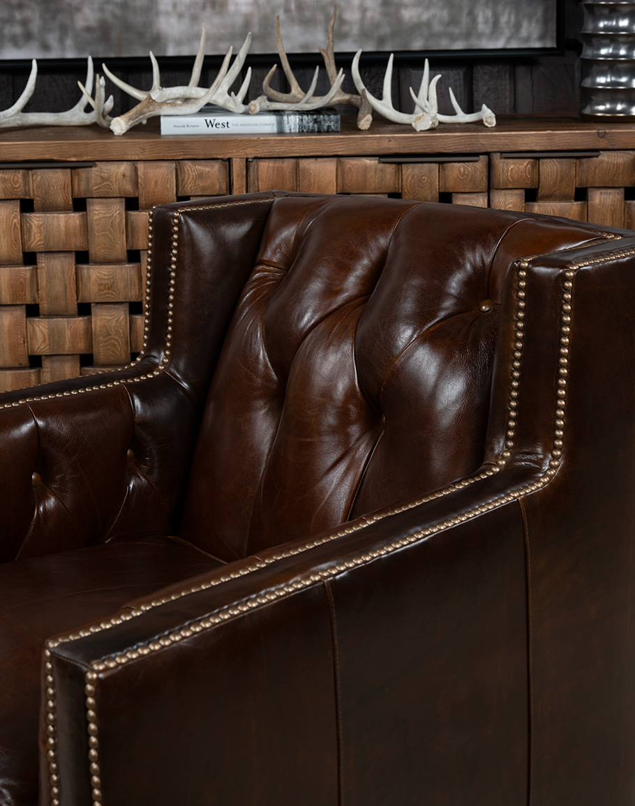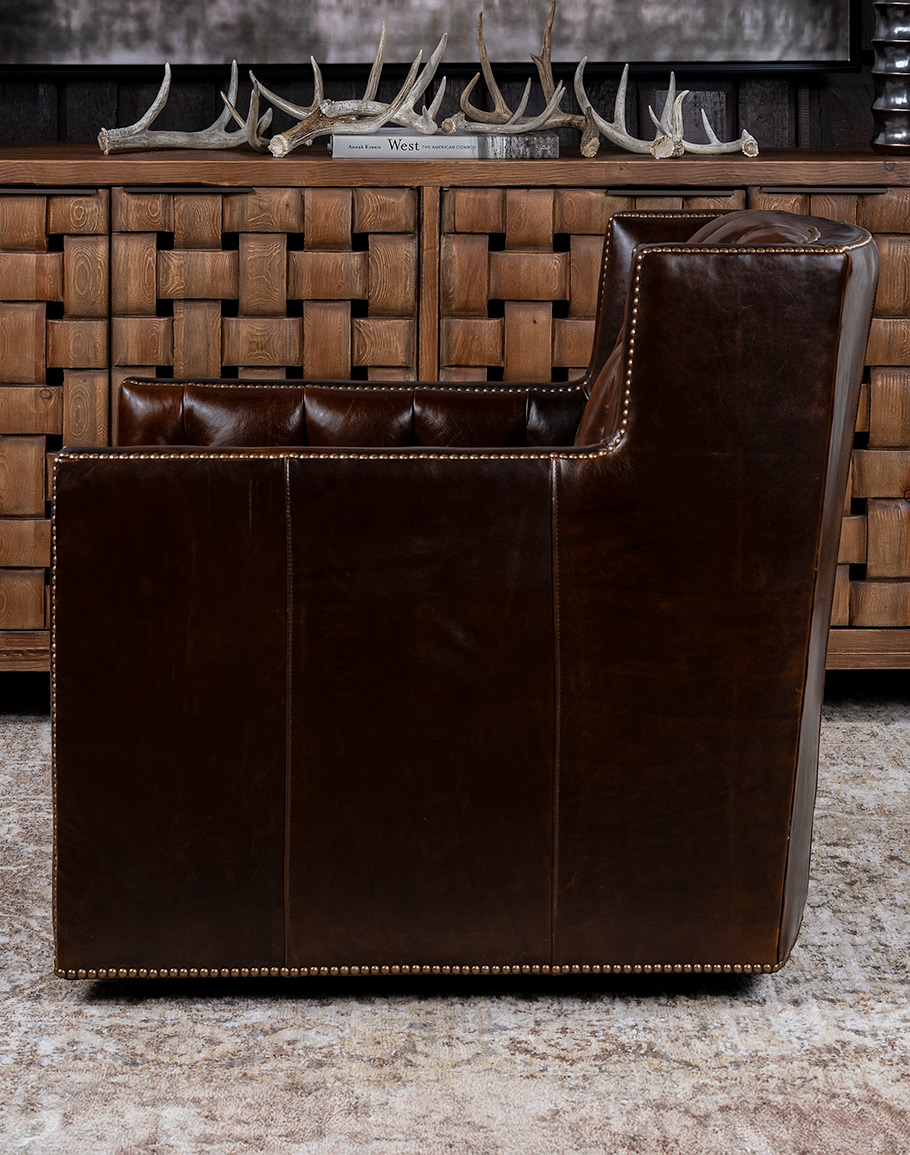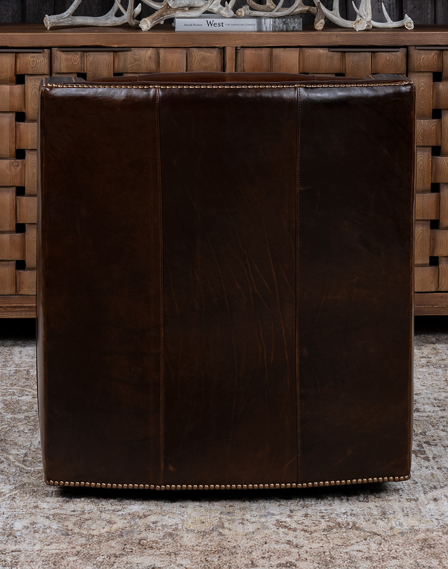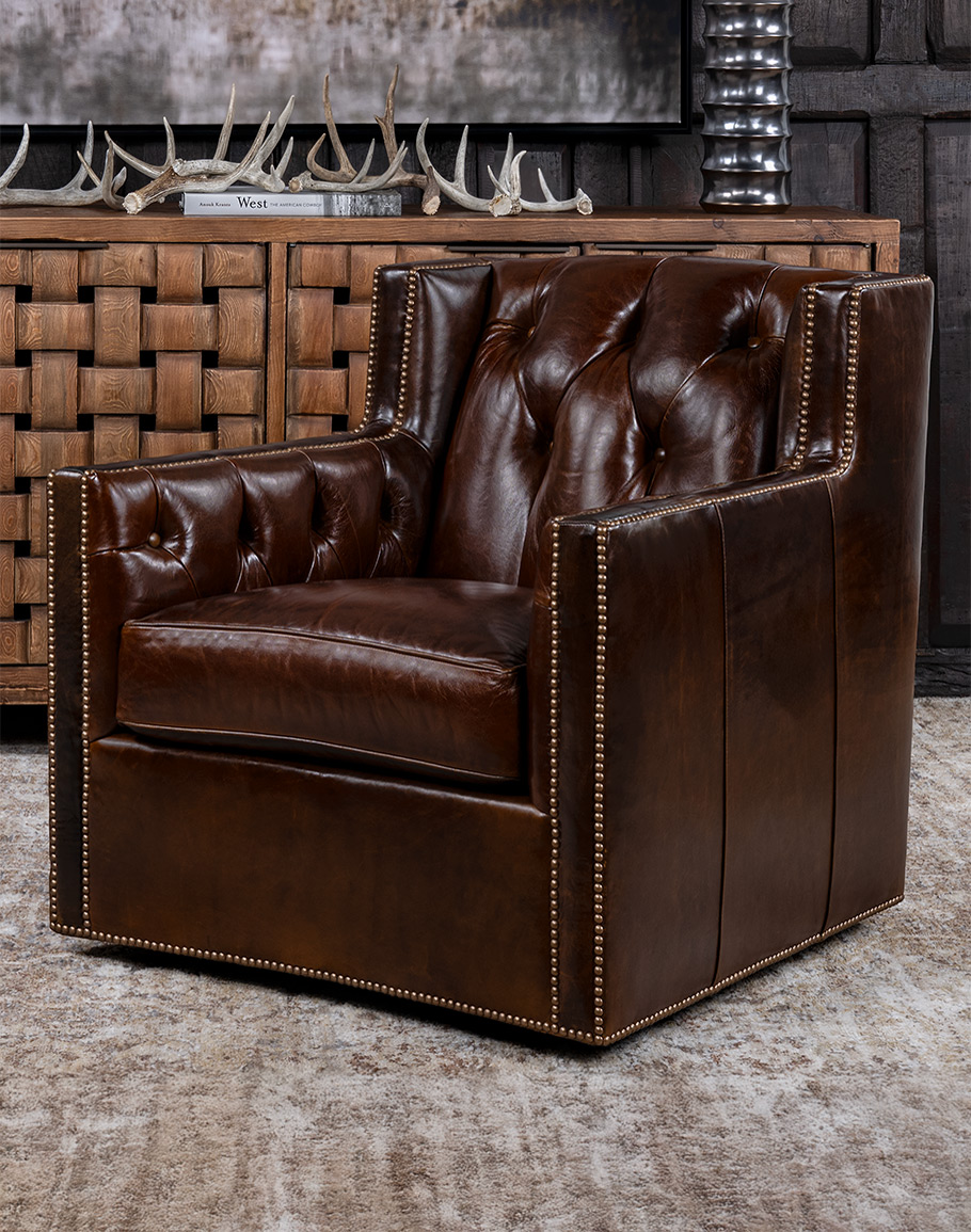 Shop our Browning Bourbon Swivel Chair in Dark Bourbon Brown , crafted with Full Grain Leather and featuring 8 Way Hand Tied for Best Comfort. A perfect addition to any Refined Ranch space, brought to you by Adobe Interiors.
