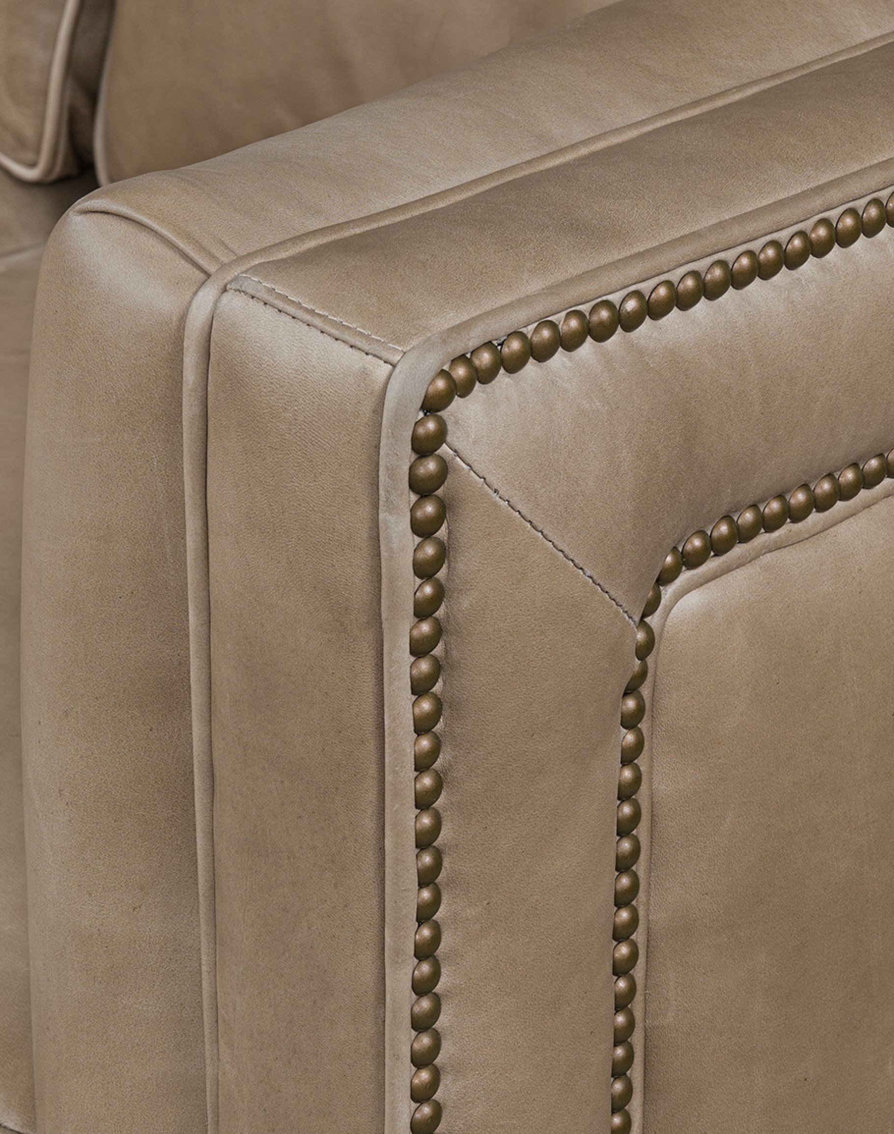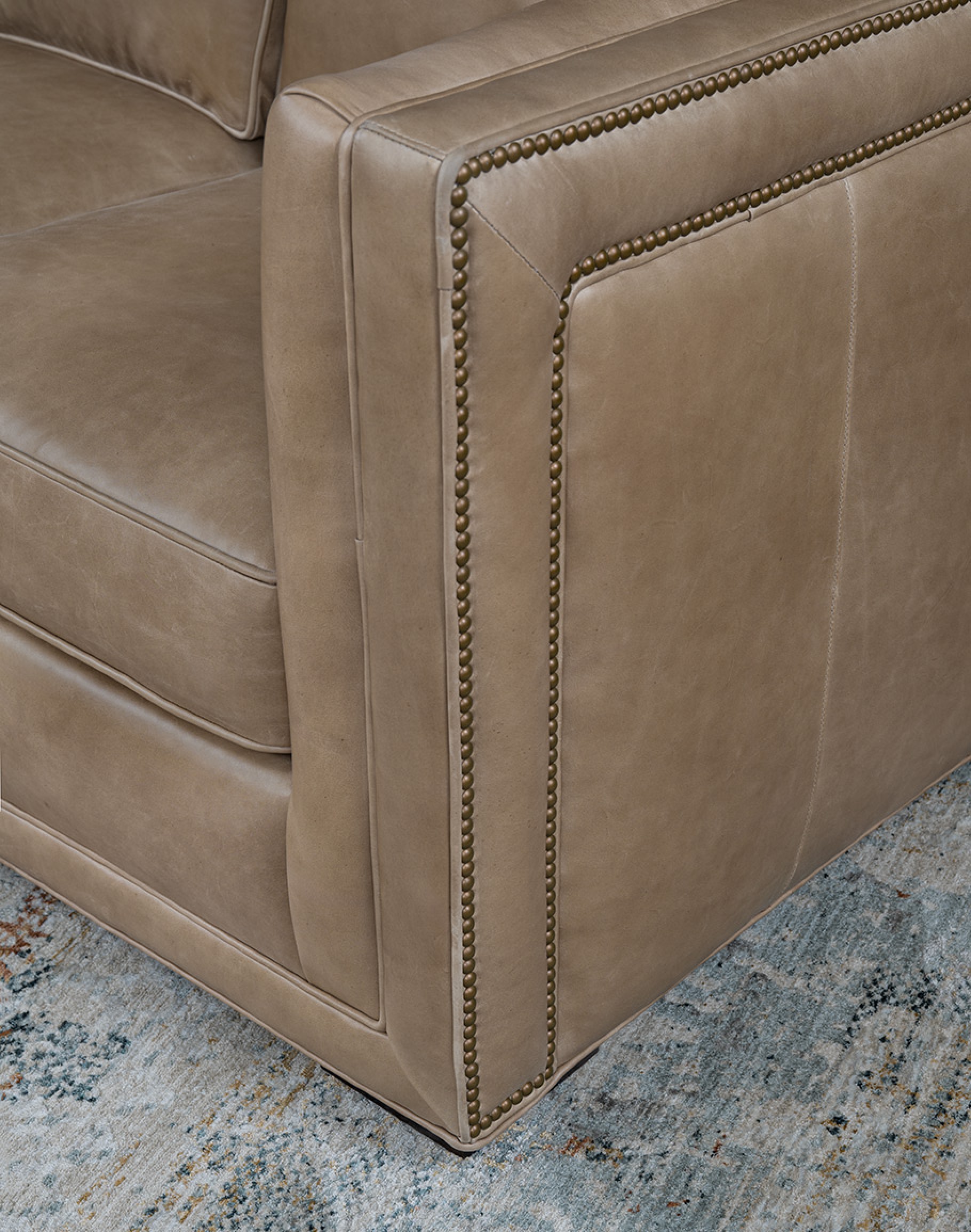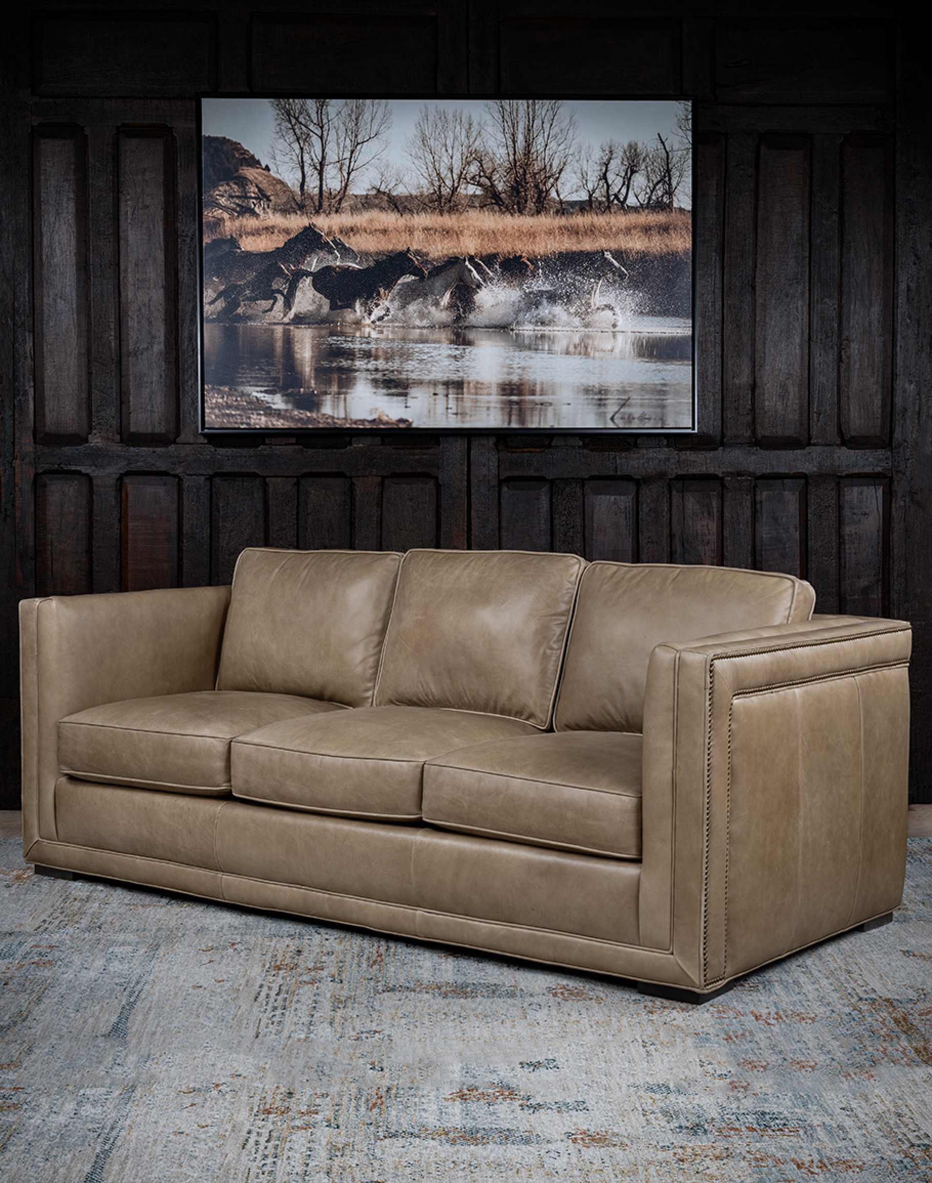 The Bryce Sand Leather Sofa is a tailored, architectural statement piece designed for elevated everyday living. Upholstered in a versatile Sand taupe-griege leather, this sofa delivers a sophisticated neutral that layers beautifully with wood tones, stone textures, and modern rustic palettes. Its clean, squared-off silhouette is defined by a track arm design with a refined inset arm panel—then finished with gunmetal nailhead trim that crisply outlines the shape for an upscale, designer look.