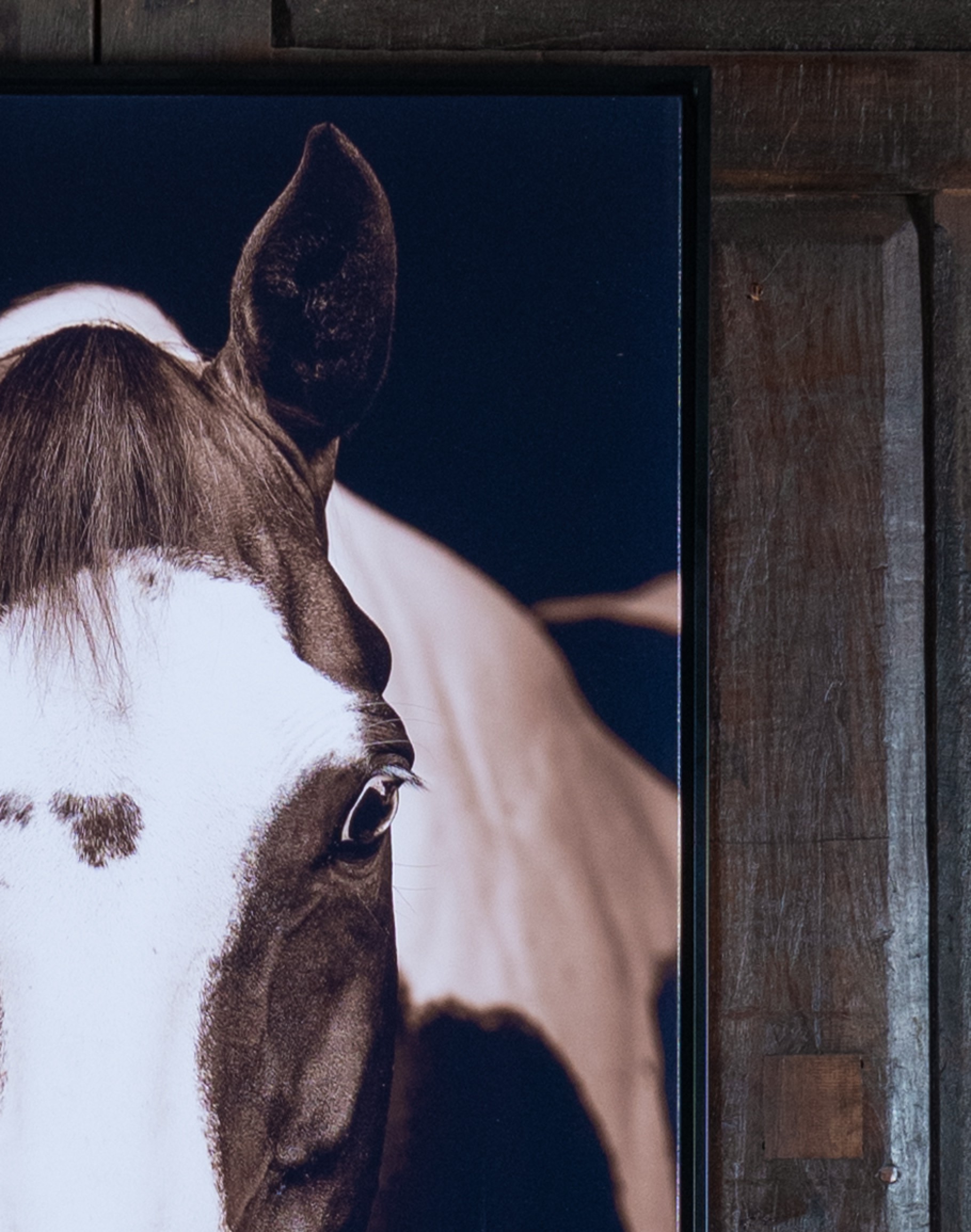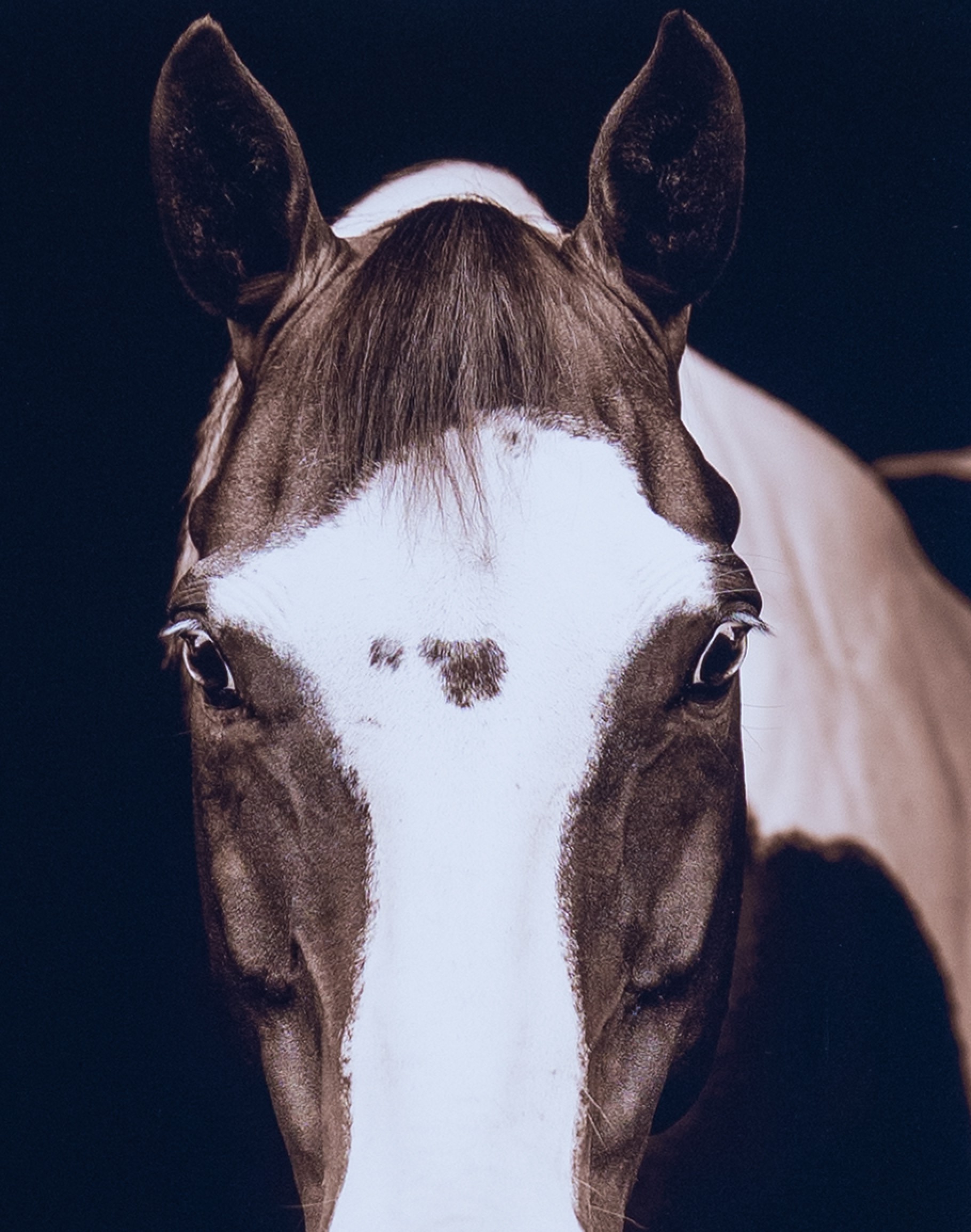 Our artwork captivates the viewer with an extraordinarily detailed image of a brown and white Horse, elegantly set against a sleek black backdrop. This visually arresting composition, featured in a vertical format, captures the depth and complexity of the horse's expressive gaze, its vibrant coat, and its strong, poised stature.