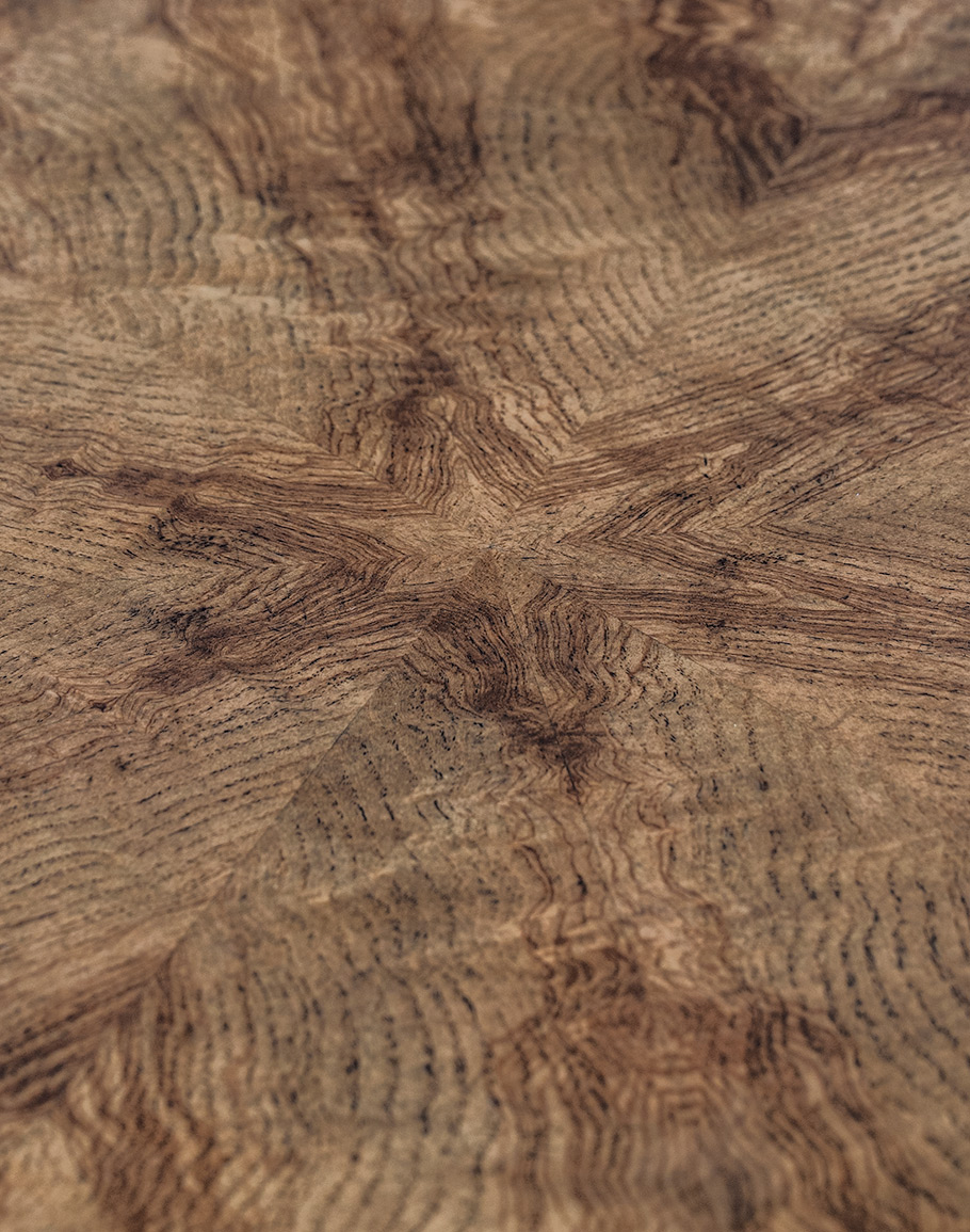 The tabletop showcases a radiating sunburst veneer layup - a designer hallmark that highlights burl’s signature “eyes,” ripples, and movement. Color reads as a warm honey-caramel base with layered figuring in toasted umber, walnut-brown, and espresso tones, delivering depth and visual dimension from every angle. A refined inlaid ring detail near the perimeter adds a subtle architectural line, while the gently shaped edge profile keeps the form crisp and tailored. At Adobe Interiors, we create the furniture, and you create the memories.